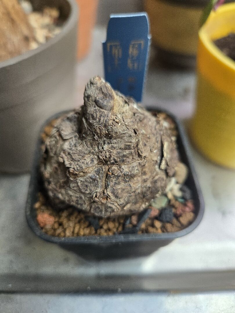 藍葉山烏龜目前處於休眠期或剛開始醒的階段,整顆塊莖表皮乾縮、沒有發芽。