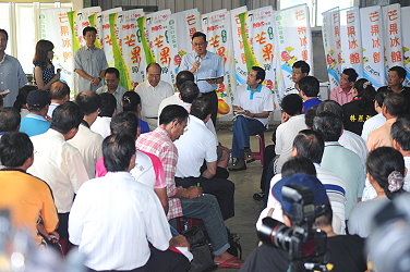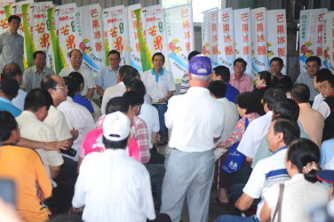 馬總統隨後與產銷班員等40多位農民進行座談,與會農民積極提出建議並針對芒果盛產期之銷售狀況及拓展銷售通路、病蟲害防治、農藥價格、提高老農津貼等多項議題踴躍提問,希望中央能協助處理。黃副主委指出,品質穩定,近年來政府積極開拓外銷市場,外銷量提升帶動內銷價格,而今年臺南地區芒果產量雖然較往年增產約30%,但品質穩定,所以價格仍具一定水準。有關今年芒果產期延後,農民擔心配合不上日本送禮節慶,黃副主委說明已協調貿易商在7月底前維持穩定出貨,並與日本檢疫官溝通,將外銷簡易作業延長至月底。國內同步啟動收購次級品進行加工,配合促銷活動,以穩定盛產期的價格。有關芒果病蟲害及農藥價格問題,因顧及全面噴藥會造成的環保問題,目前仍以推行黏板誘集害蟲為主,共同防治用藥的費用也有補助。至於是否調高老農津貼,政府亦將審慎評估。相關問題中央會在一週內做出詳細回覆。
