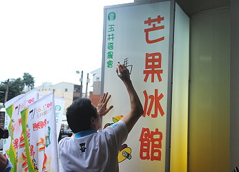 馬總統英九積極關切國內農業發展,於7月15日上午8時30分由農委會黃副主任委員有才、洪國策顧問玉欽等人陪同,前往玉井區農會青果集散包裝場視察芒果產銷。玉井區農會總幹事黃澄清的引導解說,介紹該包裝場負責進行芒果的選別、分級與包裝,在嚴謹組織的系統下,經層層嚴格把關,以確保玉井芒果出貨的品質及效率。7月16日、17日為一年一度的玉井芒果節,總統並共襄盛舉在芒果包裝箱上簽名,供節目上拍賣之用。