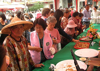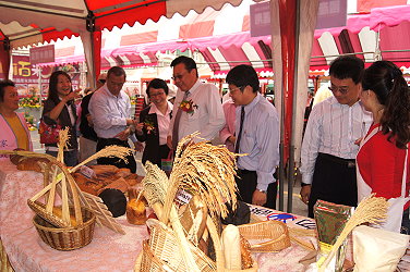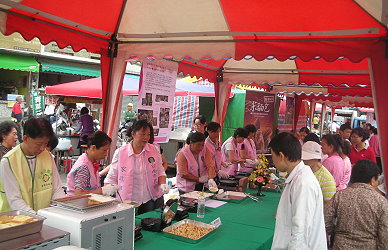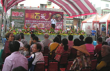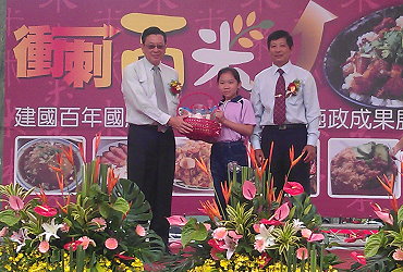 農委會以「全民愛吃米食運動」為號召,落實農業糧食安全的政策,由本會輔導處農業推廣科在全台各地百年廟口,巡迴舉辦「中華民國精彩一百國產米食推廣暨農業施政成果」系列活動共9場,為讓民眾瞭解政府的農業施政成果,第七場於本(100)年11月26日上午在臺南市安南區朝皇宮前廣場舉辦,邀民眾親身感受臺南市家政班多道「衝刺百米」米食料理,以及本場「米麵包」系列產品展示,展現臺灣米食多元化應用,活動會場有許多嘉賓蒞臨,第一場主辦單位西港區農會陳月英總幹事也到場參與,廟口前廣場也擠滿了人潮,市民攏相招來「逗」熱鬧。