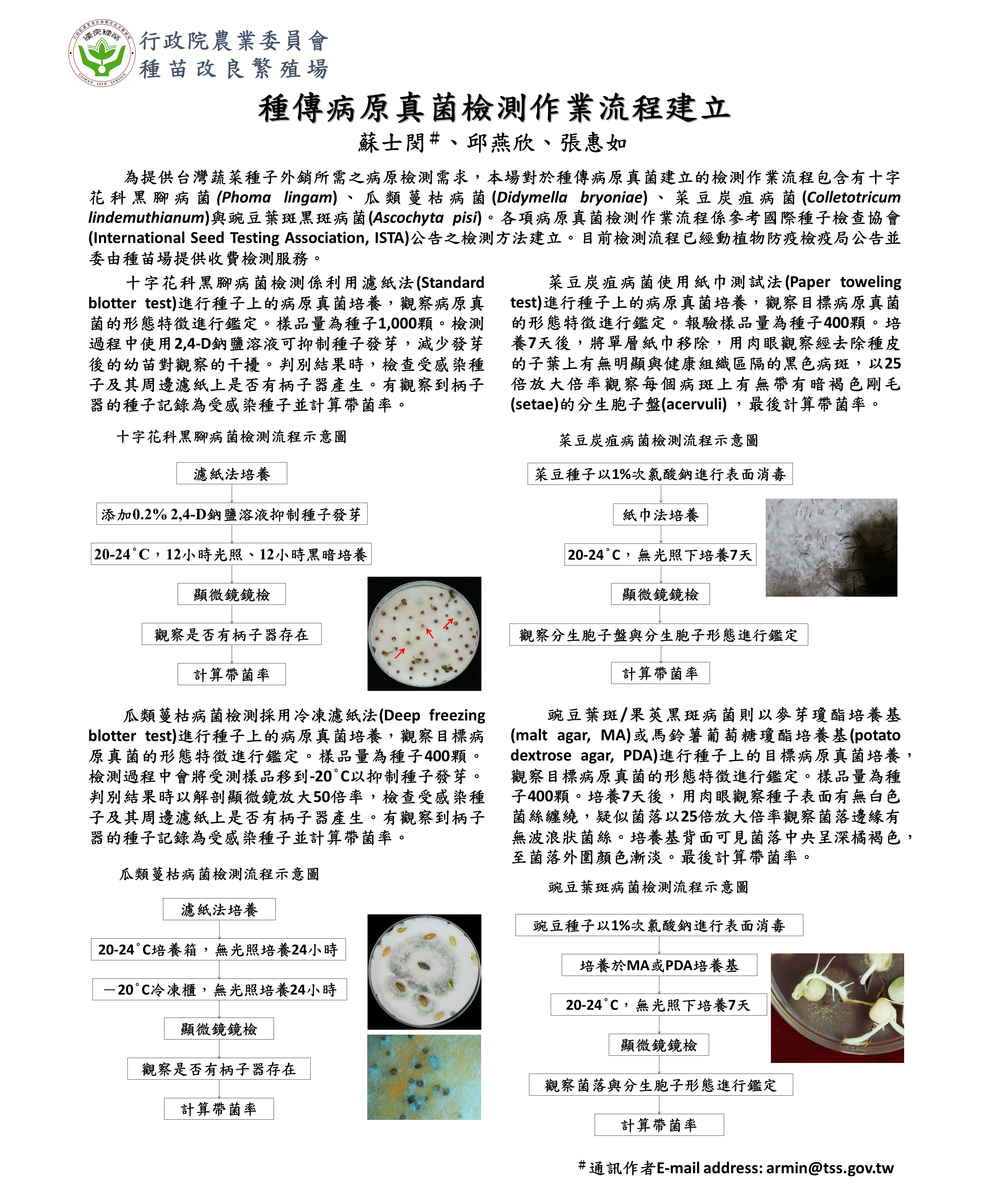 為提供台灣蔬菜種子外銷所需之病原檢測需求,本場對於種傳病原真菌建立的檢測作業流程包含有十字花科黑腳病菌(Phomalingam)、瓜類蔓枯病菌(Didymellabryoniae)、菜豆炭疽病菌(Colletotricumlindemuthianum)與豌豆葉斑黑斑病菌(Ascochytapisi)。各項病原真菌檢測作業流程係參考國際種子檢查協會(International Seed Testing Association, ISTA)公告之檢測方法建立。目前檢測流程已經動植物防疫檢疫局公告並委由種苗場提供收費檢測服務。