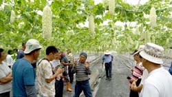 育種者全中和副研究員表示,苦瓜花蓮7號果形較大、瓜型更完美,栽培期從3至9月都可種植,授粉後15-20日就可以開始採收,因為採收期長達60-100日,需要追加至少2次的追肥。以觀自在農場為例,4月17日種植至6月中旬就已結實累累,相較於花蓮地方種山苦瓜總產量僅6-10公噸,本場育成的苦瓜花蓮7號,每公頃產量可達40公噸,總產值很是驚人。