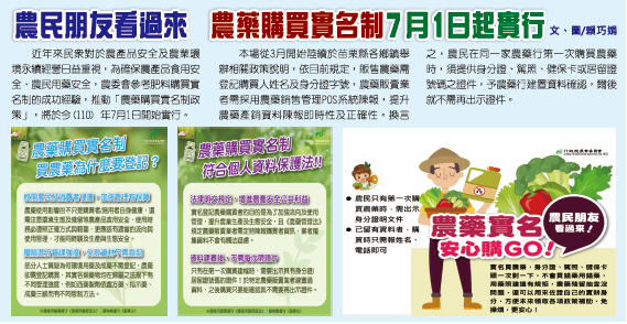 近年來民眾對於農產品安全及農業環境永續經營日益重視,為確保農產品食用安全、農民用藥安全,農委會參考肥料購買實名制的成功經驗,推動「農藥購買實名制政策」,將於今(110)年7月1日開始實行。
