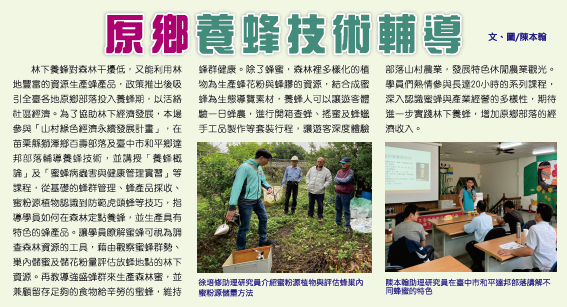 林下養蜂對森林干擾低,又能利用林地豐富的資源生產蜂產品,政策推出後吸引全臺各地原鄉部落投入養蜂以活絡社區經濟。為了協助林下經濟發展,本場參與「山村綠色經濟永續發展計畫」,在苗栗縣獅潭鄉百壽部落及臺中市和平鄉達邦部落輔導養蜂技術,並講授「養蜂概論」及「蜜蜂病蟲害與健康管理實習」等課程,從基礎的蜂群管理、蜂產品採收、蜜粉源植物認識到防範虎頭蜂等技巧,一一指導學員如何在森林定點養蜂,並生產具有特色的蜂產品。蜜蜂可視為調查森林資源的工具,藉由觀察蜜蜂群勢、巢內儲蜜及儲花粉量評估放蜂地點的林下資源,再以強盛蜂群來生產森林蜜,但也要留存足夠的食物給辛勞的蜜蜂,並保持蜂群健康。除了蜂蜜,森林裡多樣化的植物資源亦具生產蜂花粉與蜂膠的潛力蜜蜂亦可作為生態導覽素材,養蜂人可以讓遊客體驗一日蜂農,進行開箱查蜂、搖蜜及蜂蠟手工品製作等套裝行程,讓遊客深度體驗部落山村農業,發展特色休閒農業觀光。學員們熱情參與長達20小時的系列課程,深入認識蜜蜂與產業經營的多樣性,期待進一步實踐林下養蜂,促進原鄉部落的永續發展。