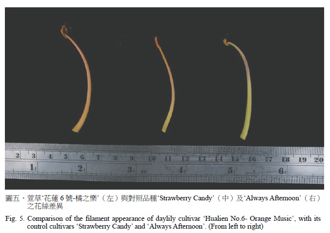 ‘花蓮 6 號-橘之樂’花絲為單色橙色,對照品種‘Strawberry Candy’花絲為雙色,橙色為主要顏色,黃色為次要顏色,對照品種‘Always Afternoon’花絲主要顏色為紫色,次要顏色為黃色(圖五)。‘花蓮 6 號- 橘之樂’和‘Strawberry Candy’柱頭為橙色,對照品種‘Always Afternoon’柱頭為黃色。
