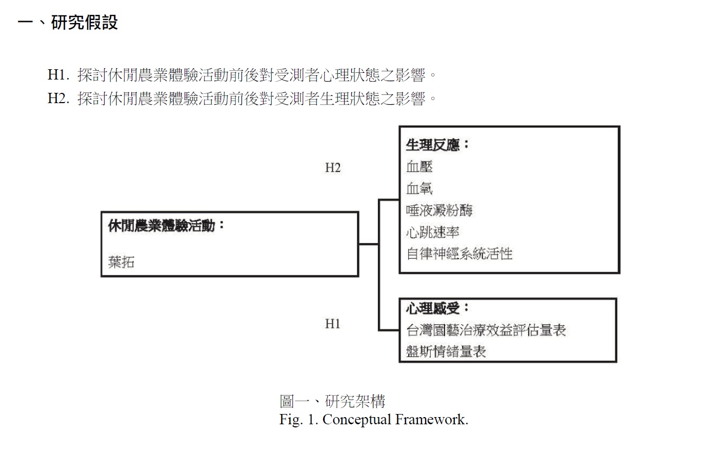 本研究評估人體對體驗活動前後的知覺反應,以休閒農業體驗活動葉拓操作為刺激源,刺激個體產生多方面的喚起(arousal)狀態,使個體處於情緒反應,並利用血壓計、血氧機、唾液澱粉酶測定儀、心率監測儀等儀器,於活動進行期間與受測者連接,反應受測者當下的生理狀態,再對其產生的心理知覺反應以台灣園藝治療效益評估量表(紀等人,2015)、盤斯情緒狀態量表(Profile of Mood State, POMS)進行評估,比較受測者在操作休閒農業體驗活動前後所產生的生心理反應變化。