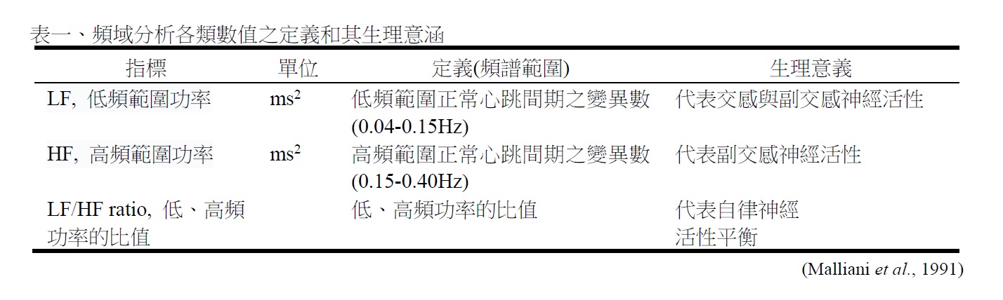 5. 自律神經系統活性(Autonomic nervous system, ANS):藉由心率監測儀資料處理軟體進行心率變異分析(Heart rate variability ,HRV)換算出低頻範圍功率(Low frequency power, LF)、高頻範圍功率(High frequency power ,HF)、低高頻功率比值(LF/HF)後對照其生理意義評估受測者於活動前後之的生理狀態(表一)。