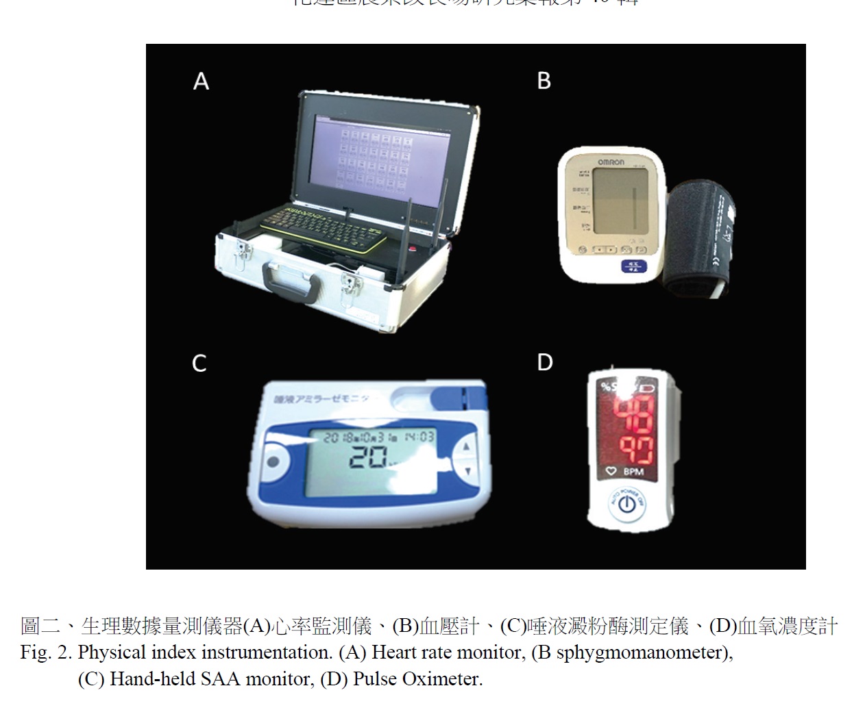 生理指標評估部分,使用血壓計(HEM-7320, OMRON, 日本)、血氧濃度計(RX-SB100,Rossmax, 台灣)、唾液澱粉酶監測儀(CM-21, Nipro, 日本)、心率監測儀(BeneGear, HRV, 台灣)進行各項生理指標數據的量測,生理量測儀器如圖二。本研究分別針對以下生理指標進行量測。