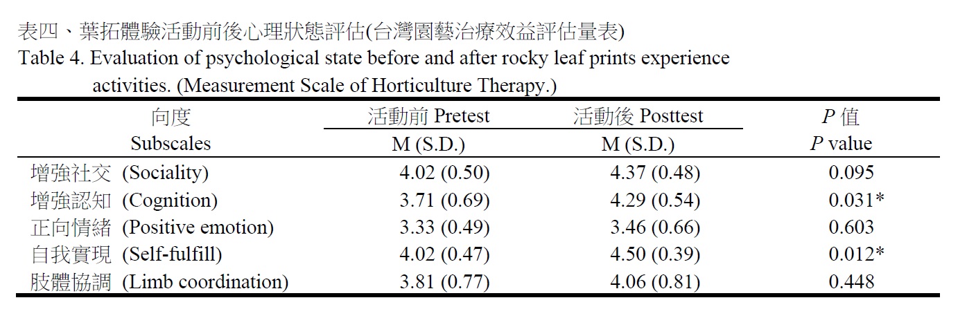 本研究評估休閒農業體驗活動「葉拓」之心理效益結果如表四及表五所示。表四為台灣園藝治療效益評估量表結果,表五為盤斯情緒狀態量表評估結果。由表四顯示,受測者進行葉拓體驗活動後,具有增強認知與自我實現等效益顯著提升。本研究結果與前人研究相符,葉拓體驗活動是一項手部按摩與藝術創作結合之園藝活動,能讓受測者自由創作及體驗,因此對心理效益具有正向影響(Tu et al., 2020)。