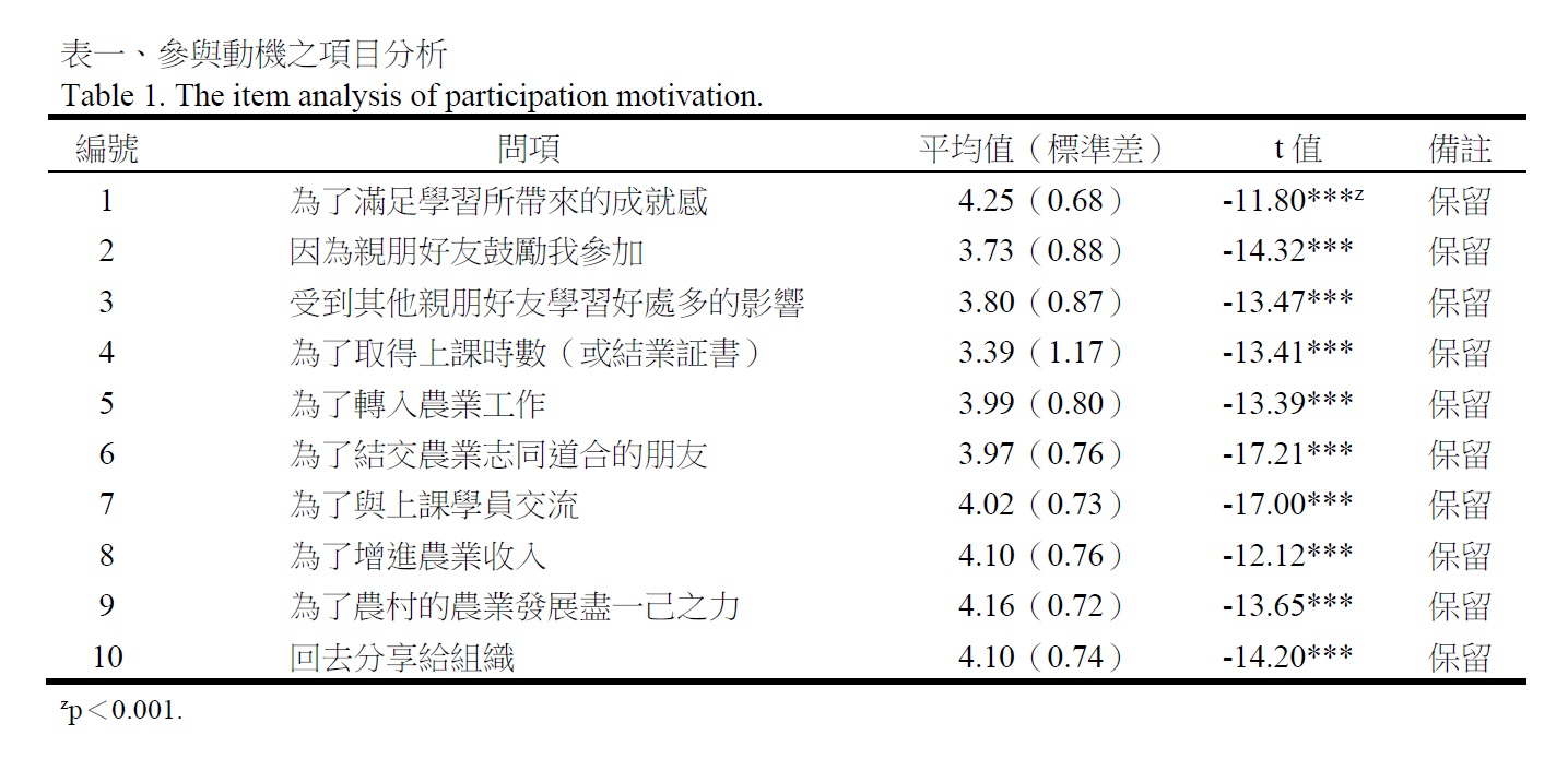 為了能夠測量到欲測量的行為特質,施測回收後的問卷首先進行項目分析,採用27%作為高分組(前25%的受試者)及低分組(後27%的受試者)別的標準(吳和陳 1991),再以獨立樣本t 檢定比較高低兩組,以求得各組的決斷值(CR 值),考驗結果是否達顯著水準,以作為題項鑑別度之依據及各題項取捨之標準。項目分析係針對區間尺度的量表進行分析,經項目分析的參與動機、課程滿意度、忠誠度等分量表結果如(表一、二、三),均顯示各分量表每一題項的決斷值具有顯著(p<0.05),皆符合統計上要求,表示測量的題目都具有鑑別力,各題項應予以保留。