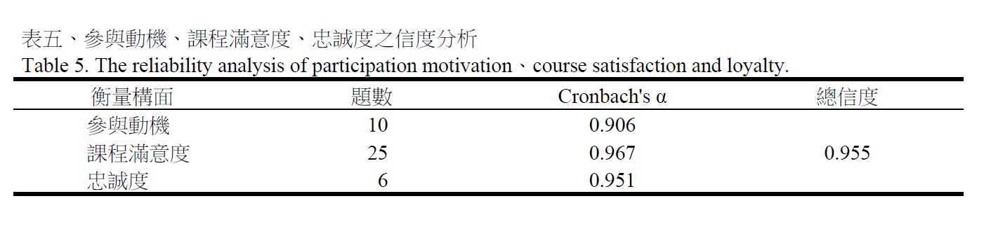 本研究針對參與動機、課程滿意度與忠誠度進行信度分析,分析結果如(表五)所示,其結果顯示本量表各衡量構面與整體信度之Cronbach's α 值均大於0.7,符合統計上之要求,因此本量表各構面之題項內部一致性程度高,具有相當良好之可靠性。此外,本研究所建構的問卷是參酌各學者之相關理論、實證研究,以及量表經過項目分析、信度估計與因素分析等試題篩選萃取分析,因此符合內容效度及良好的建構效度。