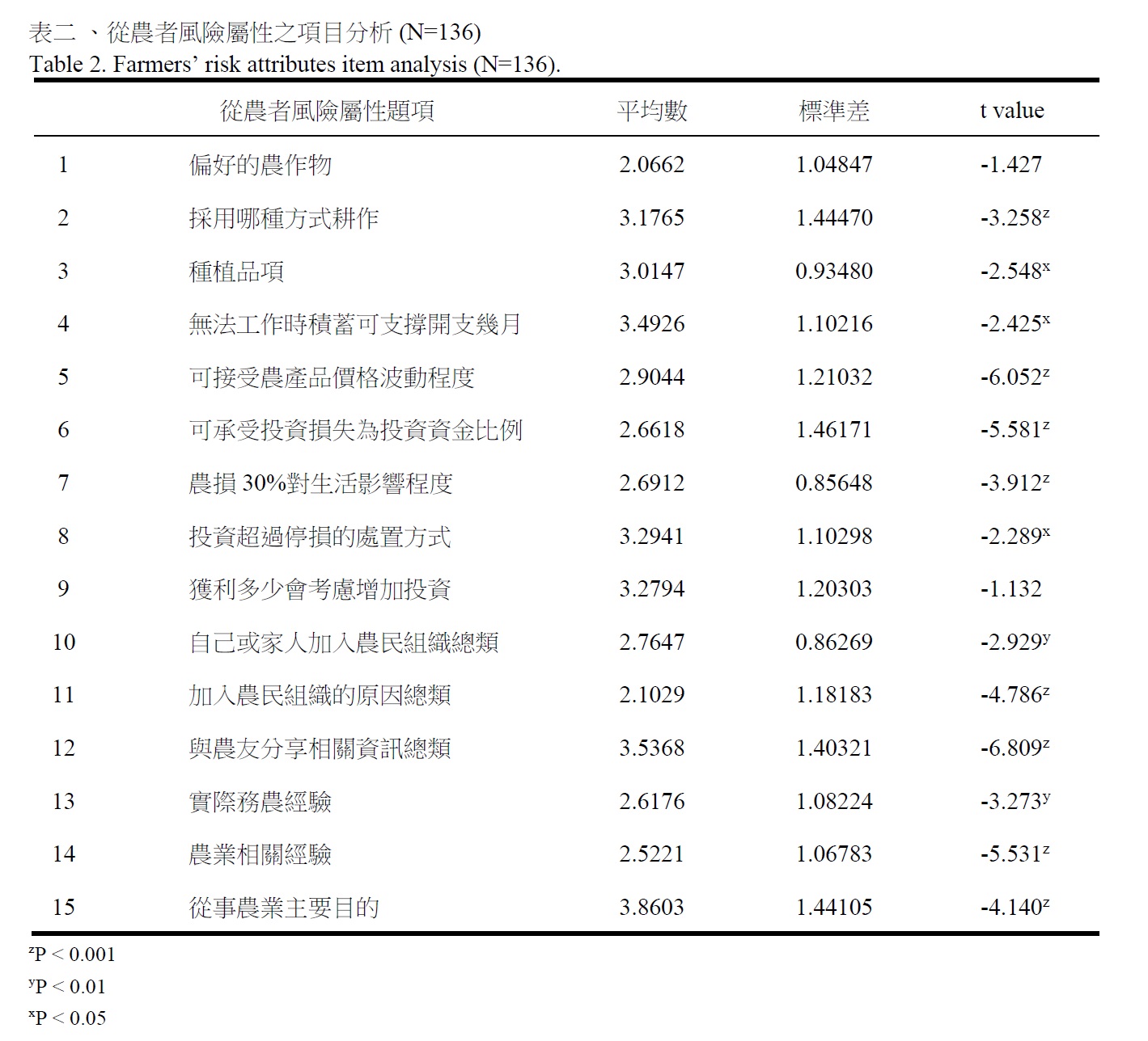 本問卷題項設計之初由台灣農業推廣學會與台北大學合作經濟暨非營利事業研究中心團隊先行設計,再經由農委會輔導單位、大學農業經濟及推廣研究學者及各農業試驗單位之農業推廣專家共同討論及修正3 次以上,篩選出15 項從農者風險屬性題項。嗣後,本研究再透過項目分析,首先選取受試者中27%之高分組與低分組,再檢定二組平均數的差異程度,以此作為問卷效度分析之主要依據,如表二。據本研究分析檢驗發現,問卷中「偏好的農作物」及「獲利多少會考慮增加投資」兩題項P 值大於0.05,代表統計上不具顯著差異,因此將兩題項剔除,僅保留13 項作為本研究問卷之題項。因此,本問卷題項除具備專家效度外同時亦具備鑑別能力,又問卷填答內容多屬客觀事實,非反映受測者的認知或意願,故較不適合進行信度分析。