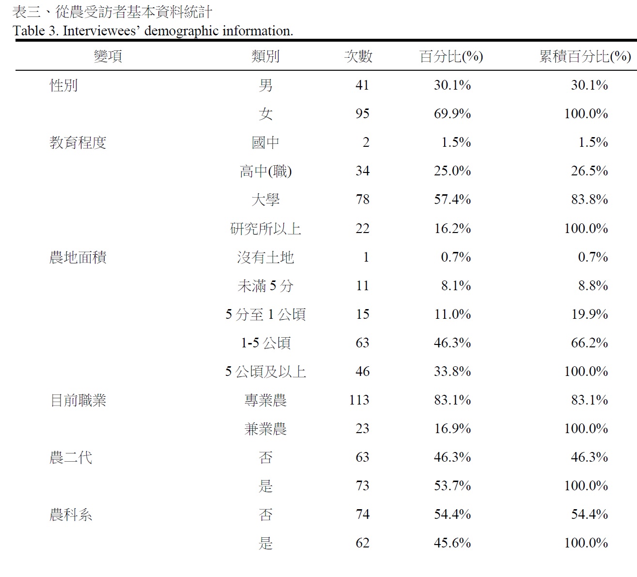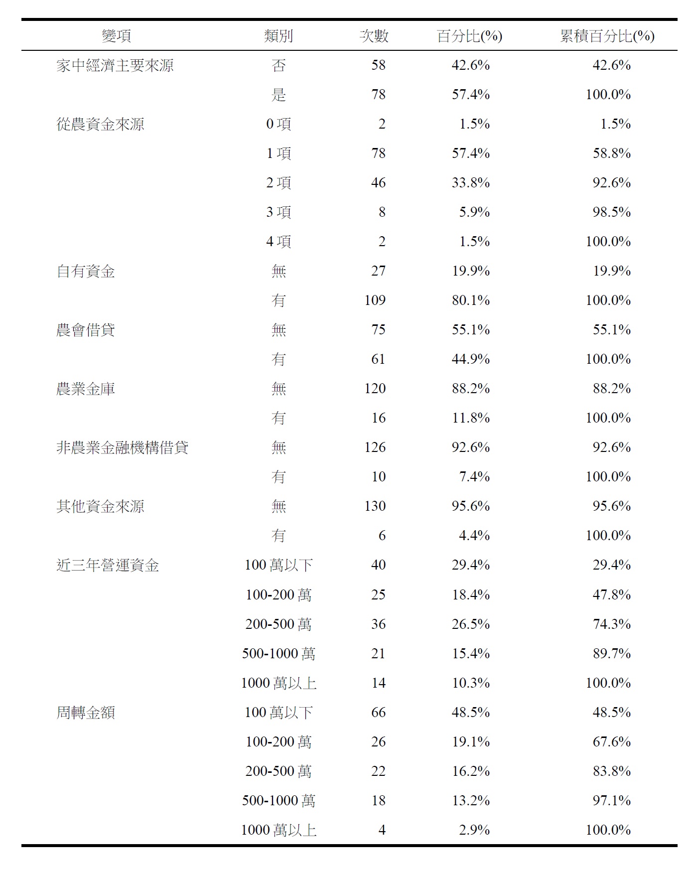 根據本研究問卷回收資料如表三所示,有效問卷受訪者計有136 人,性別比例上女性占比較高,計有95 人(69.9%);教育程度多屬大學,佔有78 人(57.4%);自有或承租農地面積大多約在1-5 公頃,佔有63 人(46.3%);職業類別上受訪者多屬於專業農,計有113 人(83.1%);從農背景方面有73 人(53.7%)屬於農二代;而多數受訪者為非農業科系畢業,計有74 人(54.4%);在財務方面,受訪者為家中主要經營來源者計78 人(57.4%)為多;從農資金來源大多為1 項或2 項,分別為78 人(57.4%)及46 人(33.8%),其中以自有資金者最多,計有109 人(80.1%),其次為農會借貸的61人(44.9%);大多數受訪者近三年營運資金在500 萬以下,佔整體比例74.3%,其中以100 萬以下佔有40 人(29.4%)最高,其次則為200-500 萬佔有36 人(26.5%)。而每年平均周轉金額為100 萬以下者占比最多,計有66 人(48.5%),其次為100-200 萬者,計有26 人(19.1%)。