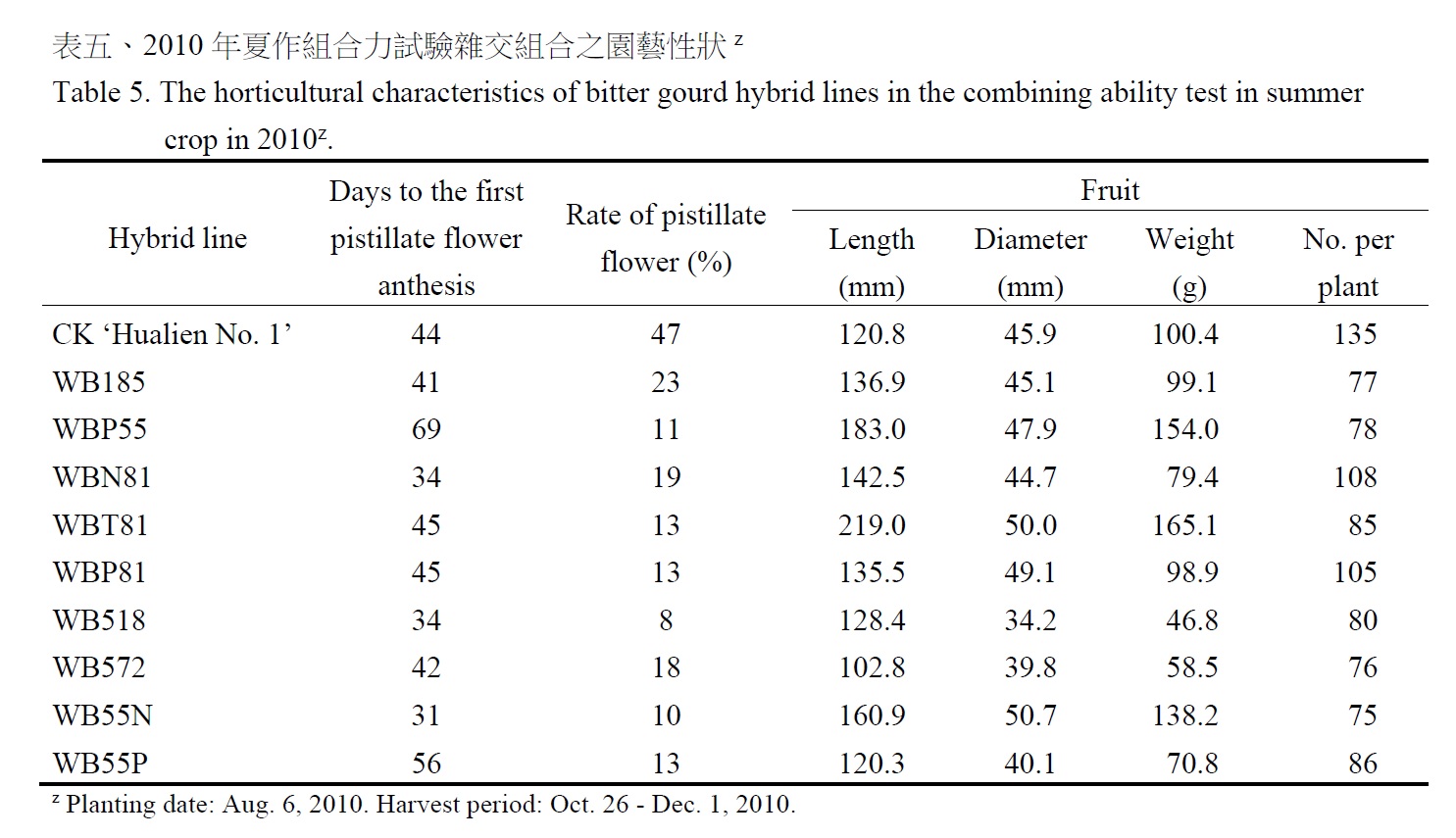 試驗材料以網室內拱型架栽培,行株距5 × 1.5 m,雙行植。2010 年春作組合力試驗結果如表四,十個品(種)系參試,以‘花蓮1 號’為對照,其中WBP81、WB55N 及WB55P 等3 個品系之田間表現較佳、果形優美,單顆果實重量97.8 g 以上,單株果實數為82 顆以上。2010 年夏作組合力試驗結果如表五,參試之10 個品(種)系中,亦以品系WBP81 與WB55N 田間表現佳、生長勢強、單株果數為75 顆以上,果形優美,單顆果重98.9 g 以上。因山苦瓜後代的果實通常較市場主流為小,因此果徑寬也是觀察指標,WB55N 與WB55P 之果徑寬較為符合。經綜合評估,選拔WBP81、WB55N、WB55P 三個品系進行後續之品系比較試驗。
