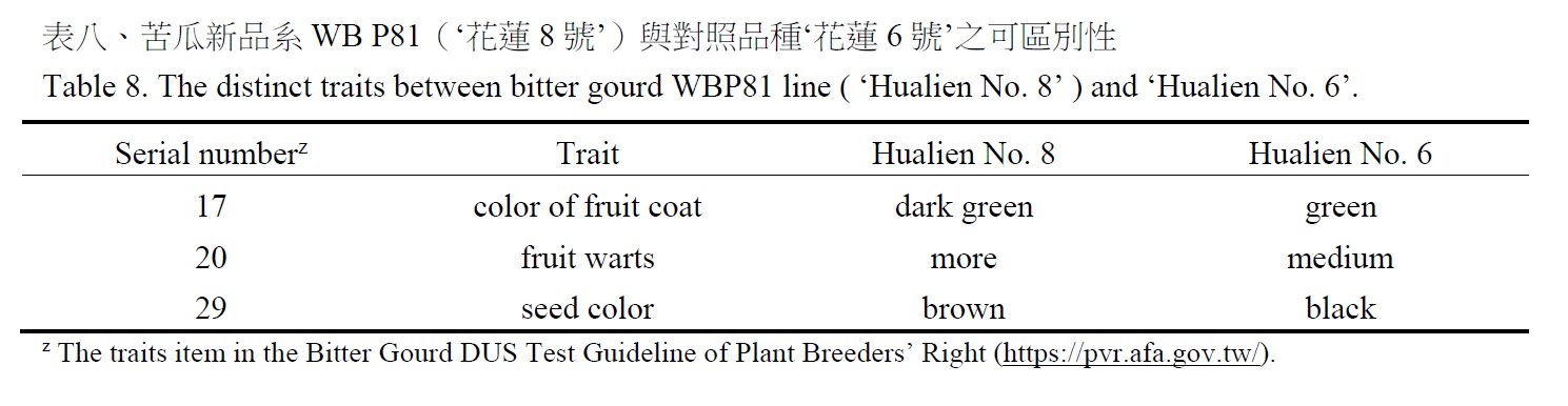 依據果實性狀如果長、果寬、果重、果形等性狀評估,新品系WBP81(‘花蓮8 號’)之雜交親本HMP9011466 與‘花蓮6 號’之雜交親本相同,經農業部蔬菜類植物品種審議委員會第8 次會議決議審認‘花蓮6 號’為品系WBP81(‘花蓮8 號’)之對照品種。