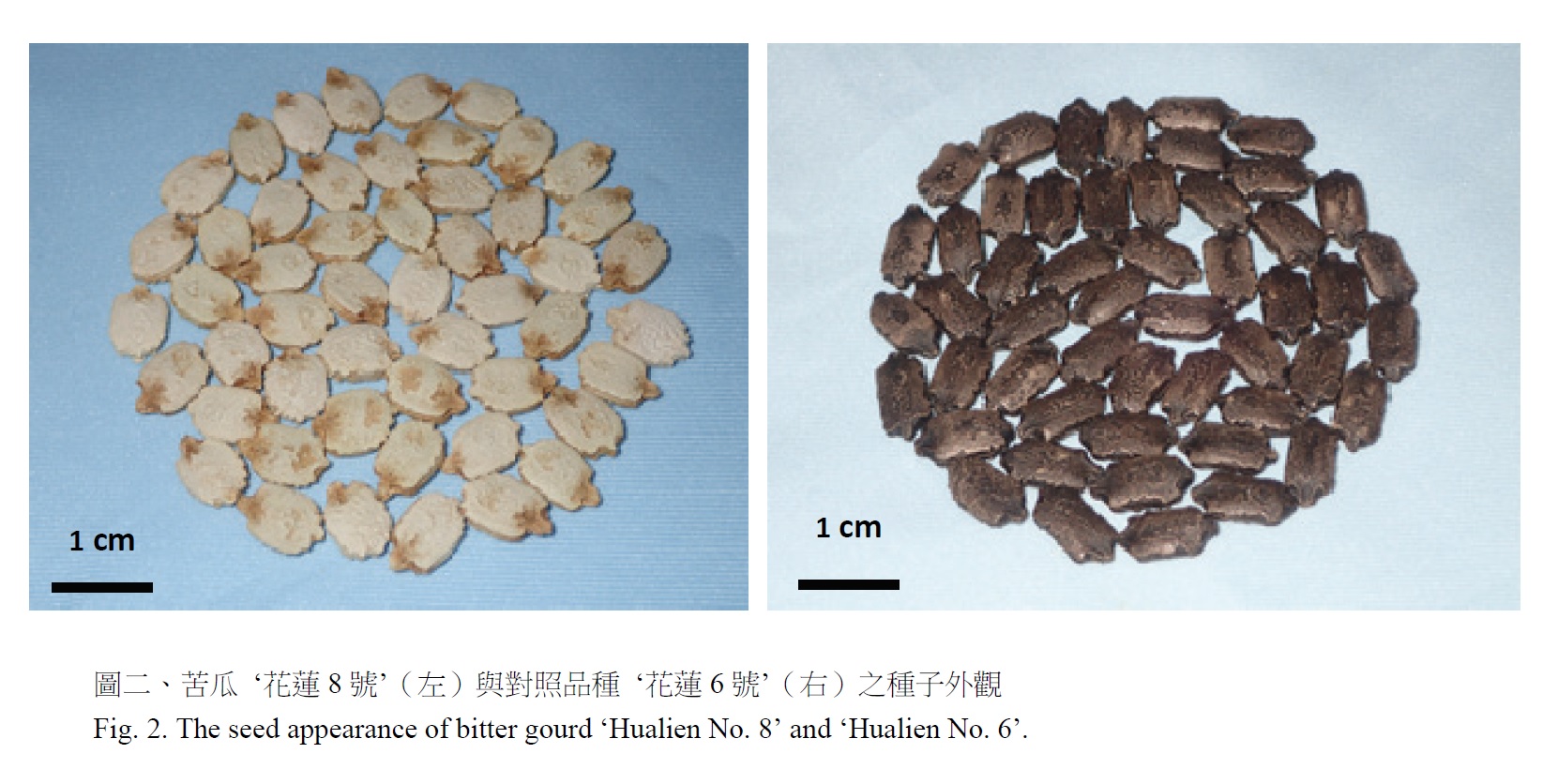 新品種與對照品種於2019 年春作、夏作進行品種權性狀檢定調查,檢定田區為花蓮區農業改良場網室試驗田。參試苦瓜品系種子以45℃溫水浸泡1 hr 後,播種於50 格穴盤育苗,至2-3 片本葉苗期定植於田間,以拱型棚架栽培,行株距5 × 2.5 m,採雙行植。田區採逢機完全區集設計(RCBD),3 重複,每小區種植10 株,依「苦瓜新品種性狀試驗檢定須知」(植物品種權公告查詢系統,2022)進行性狀調查。檢定結果顯示,‘花蓮8 號’與‘花蓮6 號’可區別的性狀有3 項:果實(可食用時期)之果皮顏色‘花蓮8 號’為深綠,‘花蓮6 號’為綠色。果實(可食用時期)之果面疣數‘花蓮8 號’為多,‘花蓮6 號’為中等。‘花蓮8 號’ 種子顏色為褐色,‘花蓮6 號’為黑色(表八、圖一、圖二)。數量性狀調查結果如表九,平均果實重量為185 g 以上。‘花蓮8 號’各調查項目之標準偏差,與‘花蓮6 號’對應項目之標準偏差,其比值皆小於1.6,符合品種權檢定之一致性(uniformity)規定。