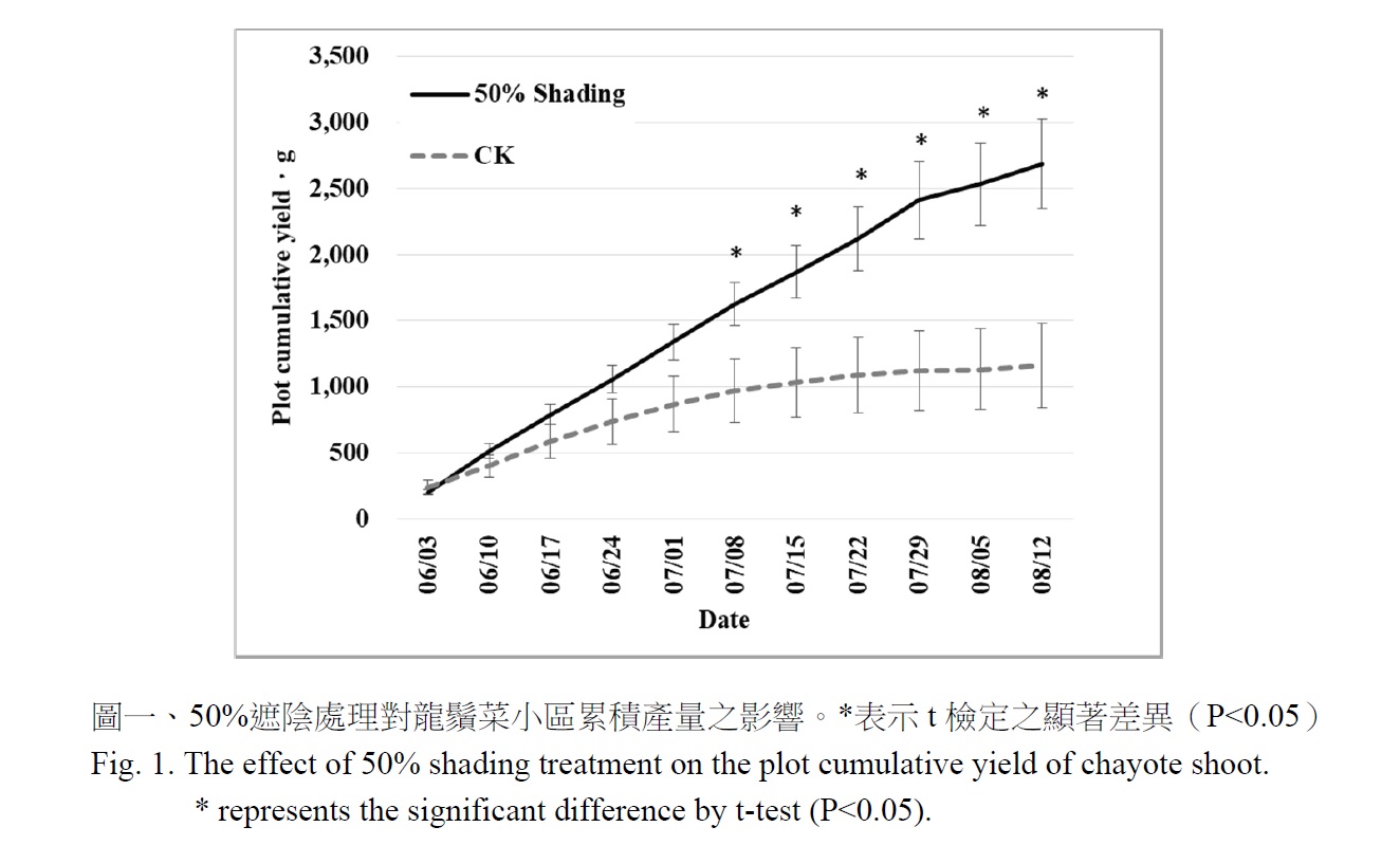 6 月間70%遮蔭處理之小區累積產量變化從449 至854 g,其對照組之產量變化從360 至646g,兩者差異未達顯著(圖二)。至7 月時,70%遮蔭處理之小區累積產量變化從997 至1,566 g,增加57.1%;其對照組之產量變化從716 至818 g,只增加14.2%。兩者差異達到顯著。8 月持續延續顯著差異趨勢,70%遮蔭處理之小區累積產量變化從1,798 至1,893 g;其對照組之產量變化從838 至844 g,已呈現生長停滯。