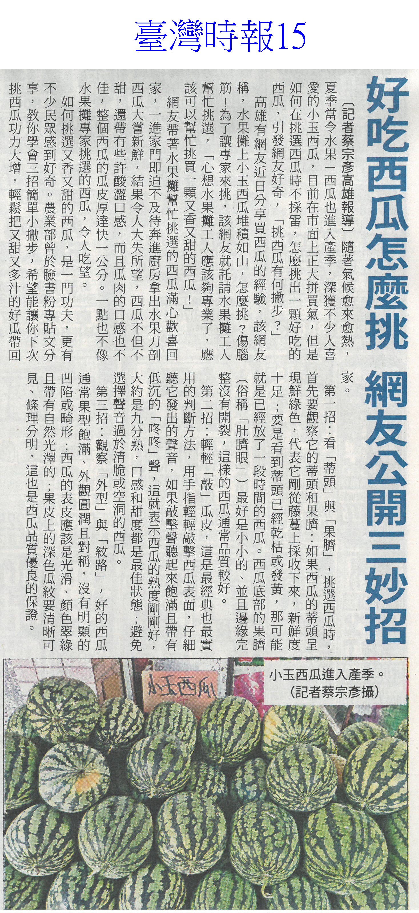 好吃的西瓜怎麼挑 網友公開三妙招(臺灣時報15)