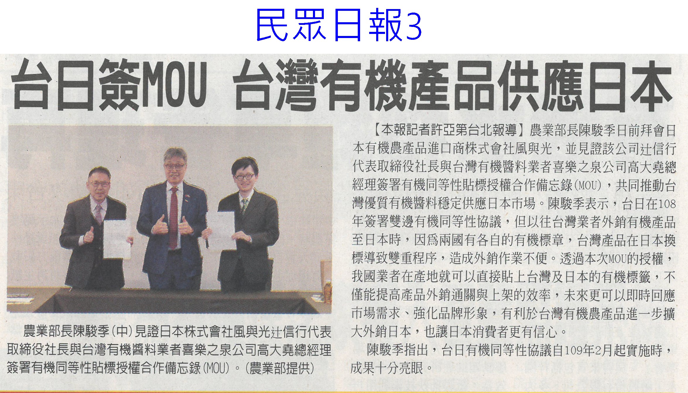 台日簽MOU 台灣有機產品供應日本(民眾日報3)
