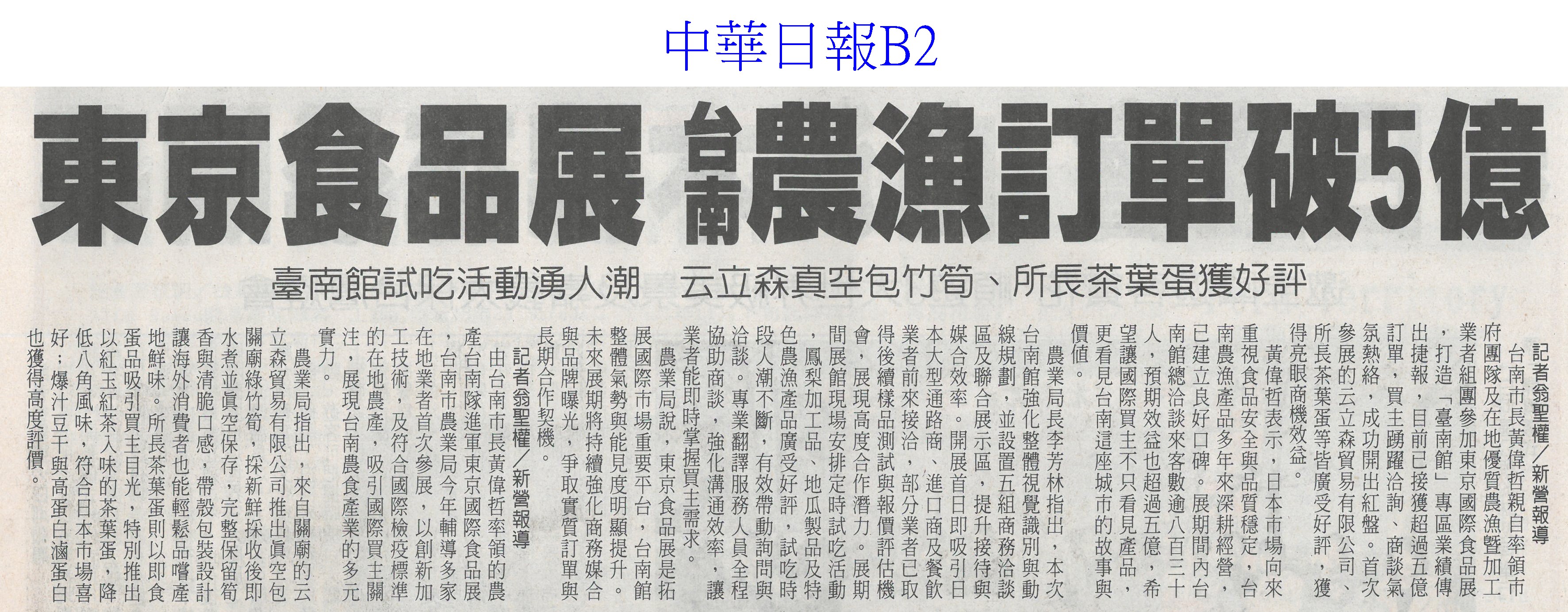 東京食品展 台南農漁訂單破5億(中華日報B2)