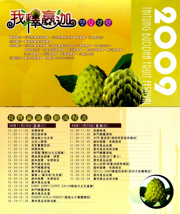 「2009台東釋迦行銷推廣活動—我釋贏迦」系列活動,訂於11月28、29日(星期六、日)在台東市南京路廣場辦理,28日上午11時舉行開幕式,兩天活動內容包括有釋迦果王優質果及產業文化展示解說、釋迦飾品、釋迦創意美食品嚐、農特產品品嚐、藝品DIY、民俗童玩DIY、農特產品展售、熱門樂團表演、趣味競賽、熱門樂團演唱、街舞秀、趣味競賽、有獎徵答等,期提昇台東釋迦節之知名度,帶動地方產業文化觀光休閒活動,發揮促銷地方農產品的效果,並且帶動餐飲、旅遊等業界促銷活動。