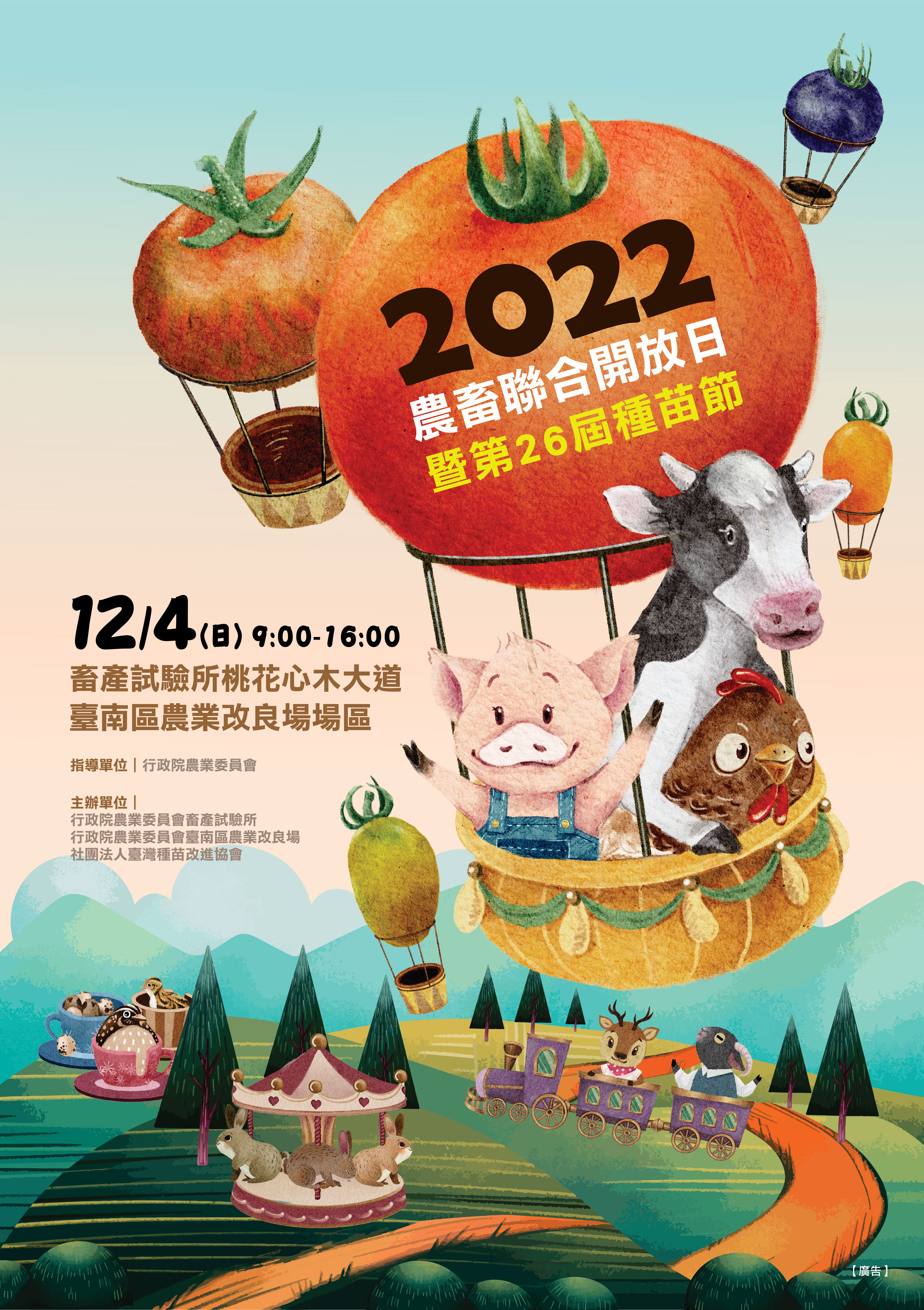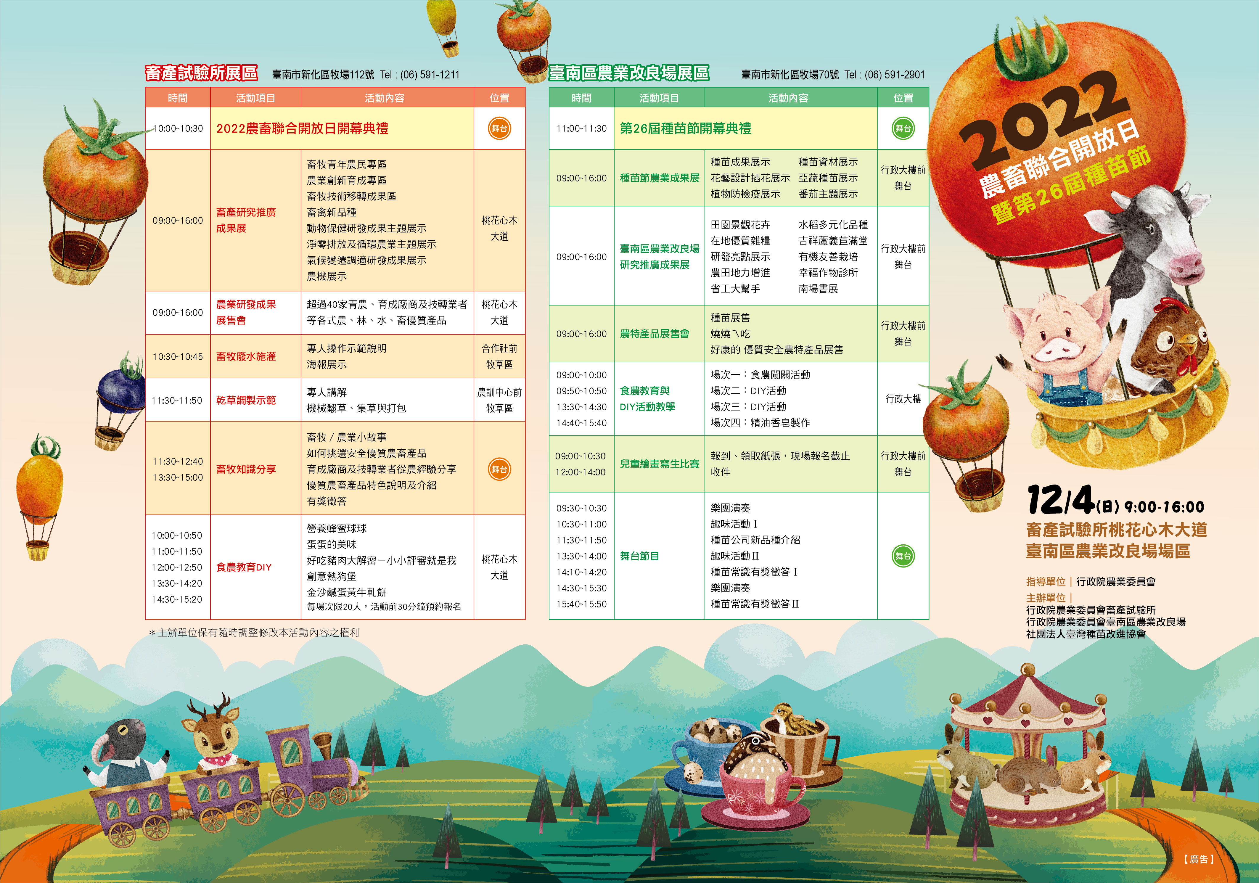 畜產試驗所與臺南區農業改良場訂於111年12月4日(星期日)上午9時至下午4時,共同舉辦「2022農畜聯合開放日暨第26屆種苗節活動」