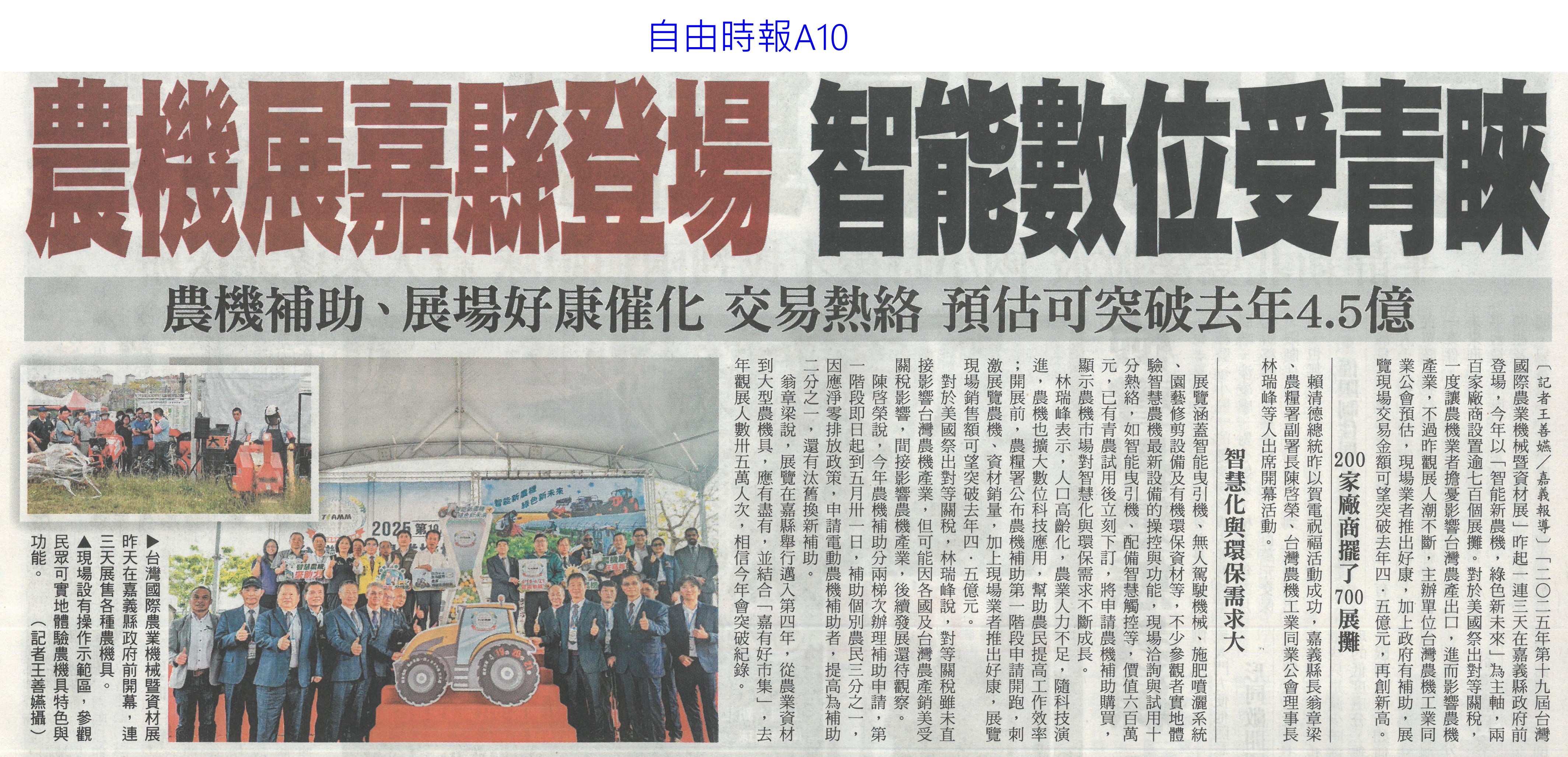 首頁楊眼好新聞 楊眼好新聞 排序 發布日期 更新日期 序號 發布日期 標題 241. 114/05/16 雲林慶祝農民節 表彰172人(中華日報B6) 242. 114/05/16 農科園區定期強化安全防護 打造韌性產業聚落(民眾日報4) 243. 114/05/16 臺南水果進軍北台 上架開賣(中華日報B2) 244. 114/05/16 臺南水果農產國際採洽會 熱絡(台灣新生報6) 245. 114/05/16 台南水果 農產採洽會 16國外買主參與(自由時報A11) 246. 114/05/16 台南熱帶水果國際採洽會 登場(臺灣時報12) 247. 114/05/13 農保放寬 光電農地免一分地門檻(中國時報A5) 248. 114/05/13 雲林良品30大伴手禮票選開跑(中華日報B6) 249. 114/04/28 南科小農市集明登場 挺優質農產(中華日報B8) 250. 114/04/28 農業部投入180億 補助擴至外銷農企(自由時報A9) 251. 114/04/28 國際農業機械展 成交金額上看10億(臺灣時報18) 252. 114/04/21 農機展嘉縣登場 智能數位受青睞(自由時報A10) 253. 114/04/21 臺灣國際農機展 首日湧人潮(臺灣時報6) 254. 114/04/18 南市農民節表彰大會 肯定158位農業模範(台灣新生報6) 255. 114/04/18 關稅阻礙農產品銷美 農機產業憂需求減少(臺灣時報5) 256. 114/04/18 新加坡參展 雲林良品潛在訂單逾1.7億(臺灣時報18) 257. 114/04/18 國際農業機械展 嘉縣府開跑(臺灣時報18) 258. 114/04/18 雲林食農教育貢獻獎頒獎(中華日報B6) 259. 114/04/17 農民節表彰大會 158人受獎(中華日報B3) 260. 114/04/17 嘉縣700展攤 國際農機展4/19登場(中國時報A9) 第 13/121 頁,共 2411 筆上一頁到第123456789101112131415161718192021222324252627282930313233343536373839404142434445464748495051525354555657585960616263646566676869707172737475767778798081828384858687888990919293949596979899100101102103104105106107108109110111112113114115116117118119120121頁下一頁每頁103070筆資料