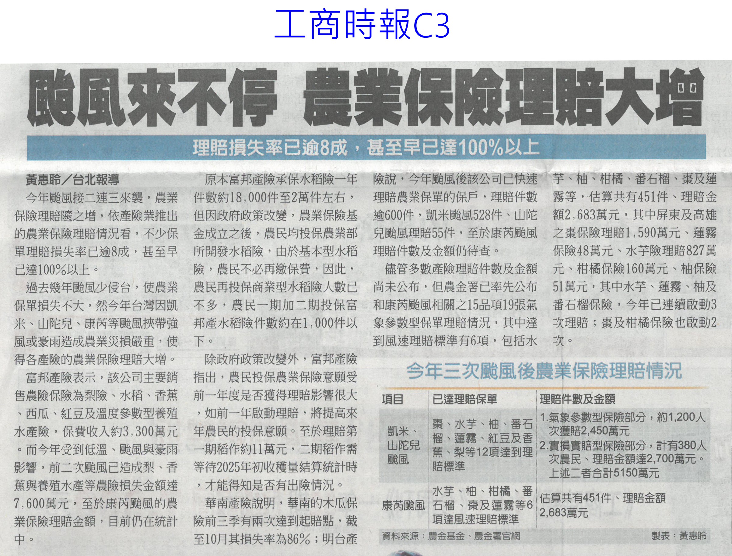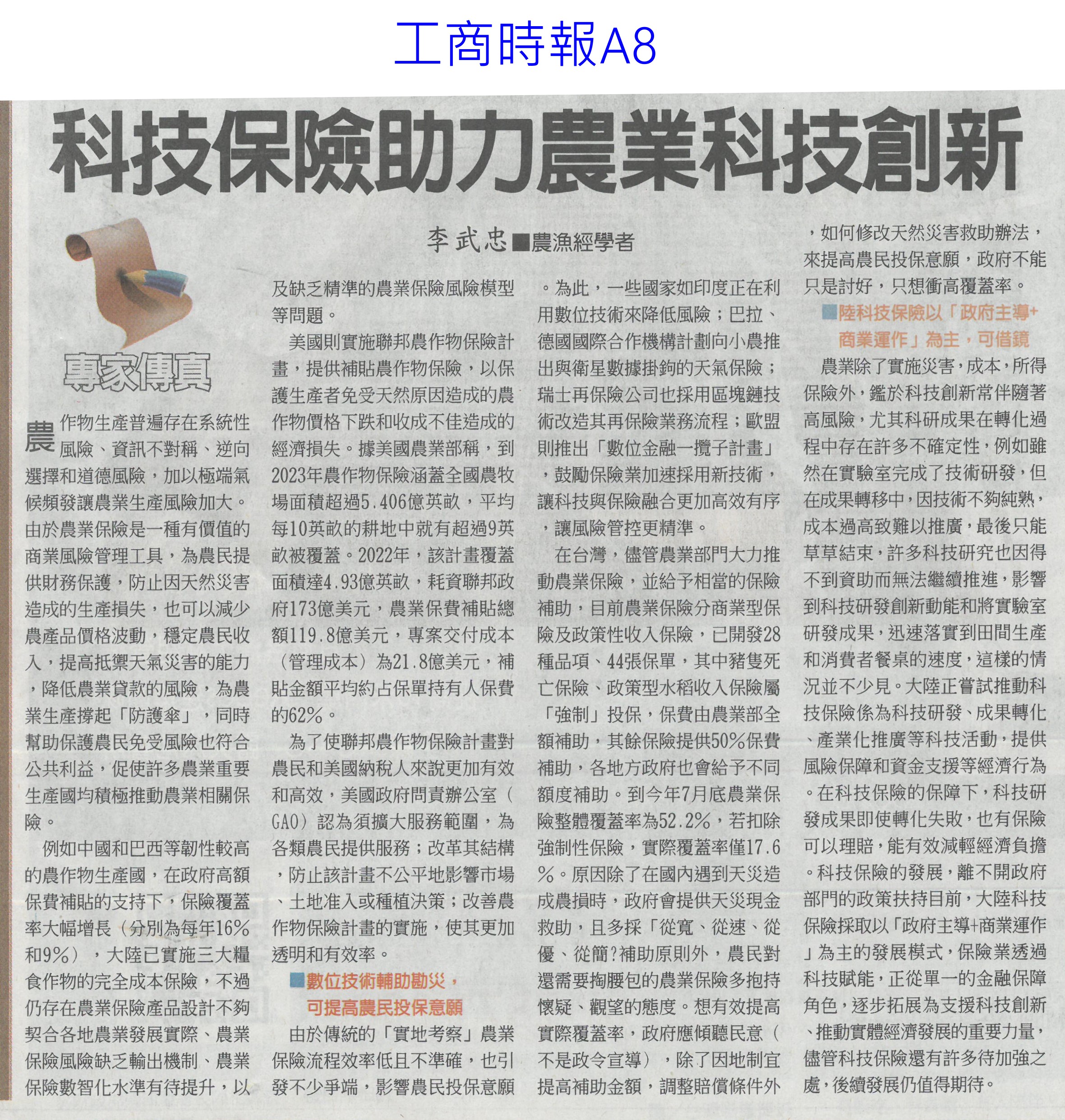 首頁楊眼好新聞 楊眼好新聞 排序 發布日期 更新日期 序號 發布日期 標題 461. 113/12/18 太康有機專區冷鏈 新鮮送達(中華日報B8) 462. 113/12/18 雜糧 蔬菜與茶 可農機代耕(中華日報A4) 463. 113/12/12 科技保險助力農業科技創新(工商時報A8) 464. 113/12/11 支持青農返鄉 市有耕地公告放租(中華日報B1) 465. 113/12/11 雲縣府/雲科大 推一驗多証制度(台灣新生報6) 466. 113/12/11 雲科大一驗多証 造福農漁牧(中國時報A9) 467. 113/12/11 資源循環零廢棄 創造永續農業新價值(民眾日報8) 468. 113/12/11 農業廢棄物變新綠金(自由時報A1) 469. 113/12/04 內政部:農業權入法無助發展(中華日報A3) 470. 113/12/04 新加坡新台灣館開幕 雲林良品進駐 大受歡迎(台灣新生報10) 471. 113/12/04 褒忠循環農業 國際發光(聯合報B2) 472. 113/12/04 臺灣產銷履歷出於藍 日本派員考察(自由時報A8) 473. 113/12/04 有機世界大會在台舉辦(台灣新生報6) 474. 113/12/04 陳昱初接掌台南農改場(中華日報B2) 475. 113/12/04 十大神農獎 雲林居全國之冠(臺灣時報18) 476. 113/12/02 農業生產追不上人口(聯合報A2) 477. 113/12/02 颱風來不停 農業保險理賠大增(工商時報C3) 478. 113/12/02 憂損權益 雲林擬減農1增農2(中國時報A8) 479. 113/12/02 農畜聯合開放日 破萬人逛起來(中華日報B1) 480. 113/12/02 AI科技 強化農業韌性(民眾日報4) 第 24/126 頁,共 2502 筆上一頁到第123456789101112131415161718192021222324252627282930313233343536373839404142434445464748495051525354555657585960616263646566676869707172737475767778798081828384858687888990919293949596979899100101102103104105106107108109110111112113114115116117118119120121122123124125126頁下一頁每頁103070筆資料