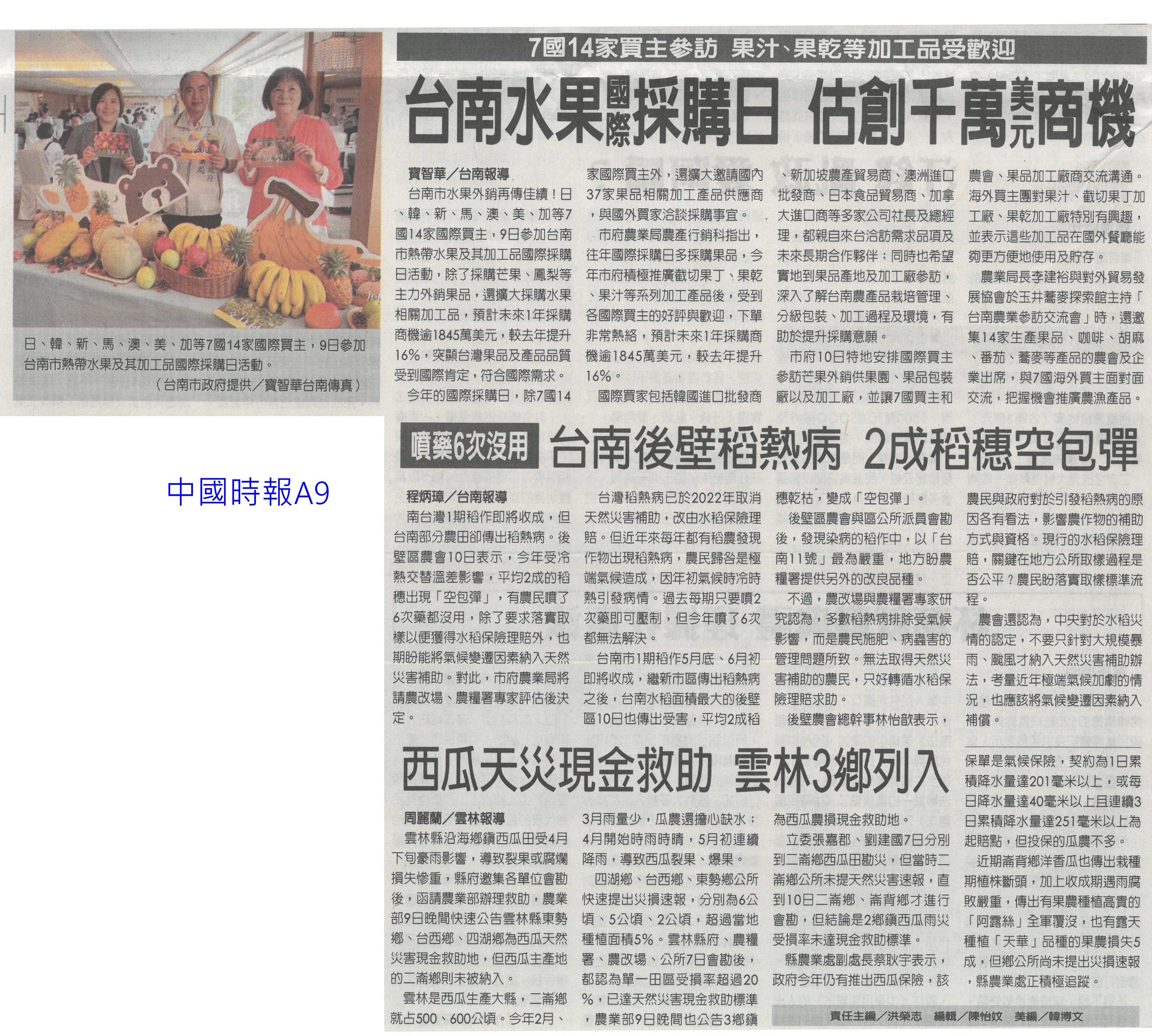首頁楊眼好新聞 楊眼好新聞 排序 發布日期 更新日期 序號 發布日期 標題 521. 113/05/31 雲縣14農民入選百大青農(中華日報B6) 522. 113/05/31 突破!臺灣有機農產 可外銷英國(中華日報A4) 523. 113/05/31 集水區降雨破百毫米 2水庫進補(自由時報A11) 524. 113/05/31 切碎循環再利用 製成固體再生燃料 稻稈變身生質能發電(自由時報A7) 525. 113/05/31 雲林推動農藥殘留質譜快檢機制(台灣新生報6) 526. 113/05/31 梅雨進補 三大水庫水情正常(中華日報B1) 527. 113/05/31 廢校變身食農教育新場域兼社區照顧 獲2024全球卓越建設銀獎 528. 113/05/22 農業部長陳駿季:推農業基本法 農民數位卡(自由時報A10) 529. 113/05/22 智慧韌性 永續安心 農業施政願景(民眾日報6) 530. 113/05/22 陳駿季:4年內制定農業基本法(中國時報A5) 531. 113/05/21 百大青農林一夫 楠西區長貼紅榜(中華日報B3) 532. 113/05/21 水情不樂觀3水庫蓄水率下降(臺灣時報19) 533. 113/05/21 濁水溪高灘地將供電 農民按讚(中國時報A9) 534. 113/05/21 鮮果 加工品 7國14買家採購(自由時報A11) 535. 113/05/21 台南水果採洽會 7國買家下單(中華日報B8) 536. 113/05/21 台南水果國際採購日 估創千萬美元商機(中國時報A9) 537. 113/05/21 百大青農 嘉縣大放異彩11人獲選(自由時報A12) 538. 113/05/14 520專屬伴手禮 沒吃國宴也買得到(自由時報A13) 539. 113/05/09 黃偉哲開箱國宴伴手禮 滿滿臺南人情味(台灣新生報6) 540. 113/05/09 稻草分解菌有機質肥料補助 每公斤5元(民眾日報12) 第 27/117 頁,共 2337 筆上一頁到第123456789101112131415161718192021222324252627282930313233343536373839404142434445464748495051525354555657585960616263646566676869707172737475767778798081828384858687888990919293949596979899100101102103104105106107108109110111112113114115116117頁下一頁每頁103070筆資料