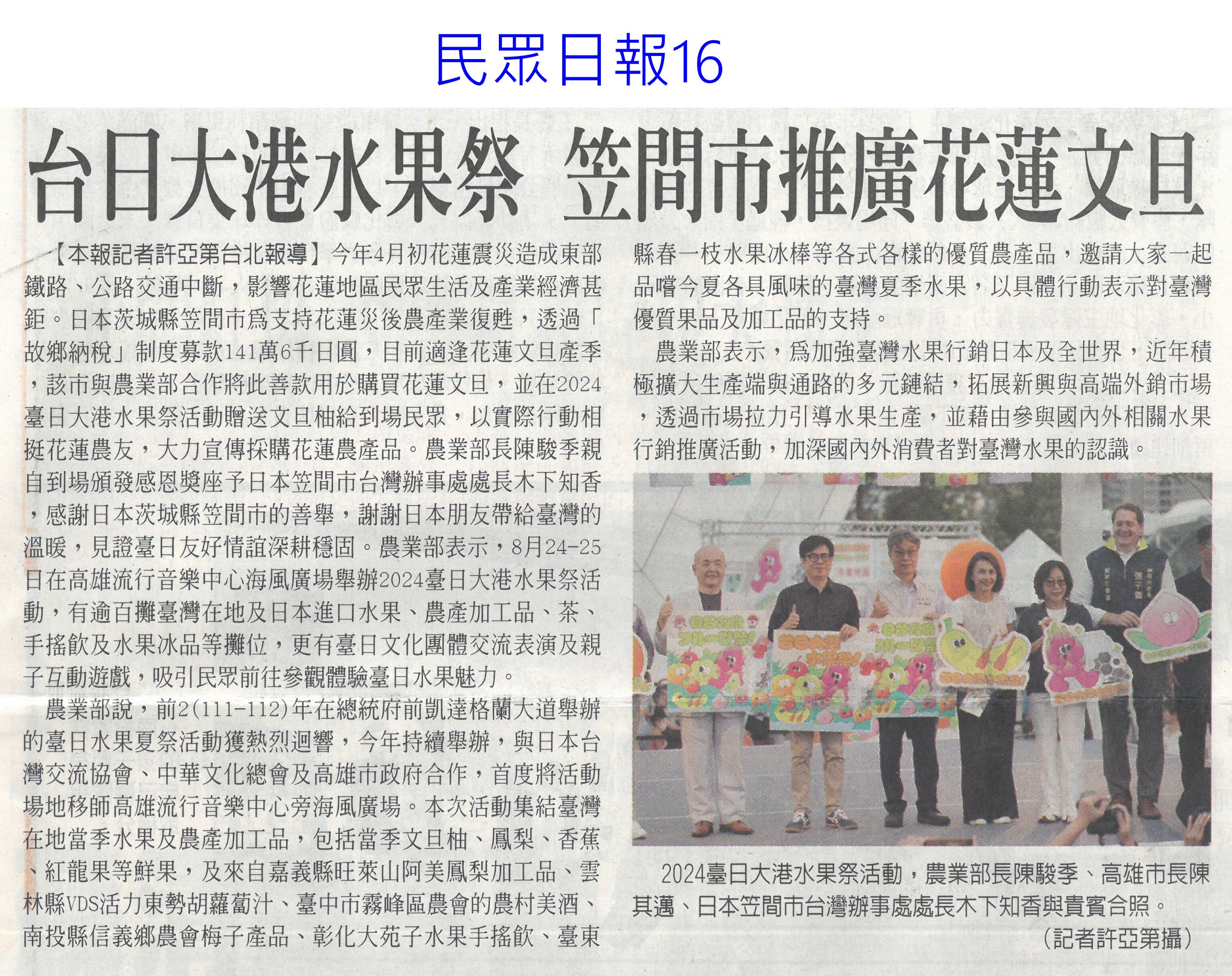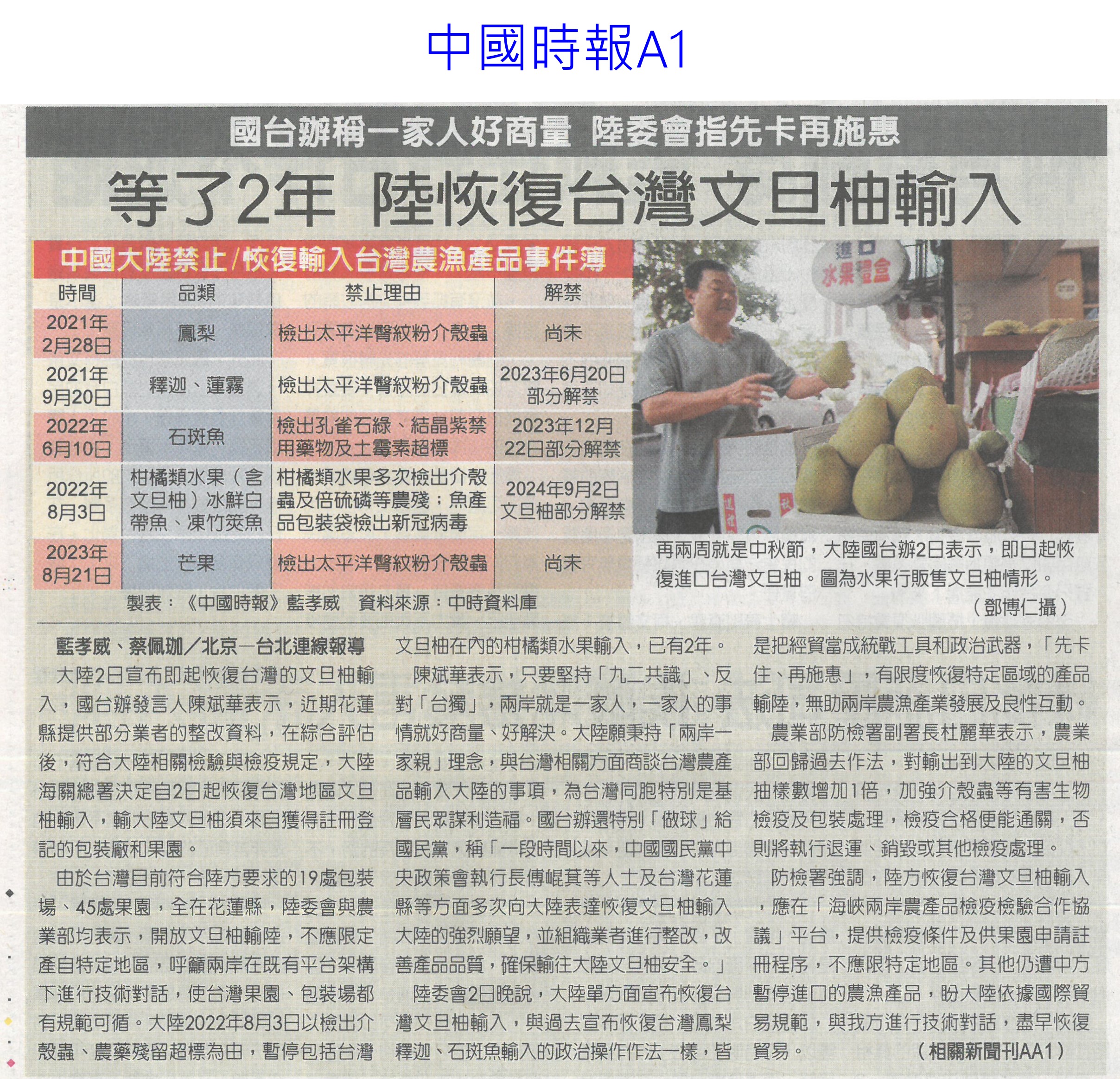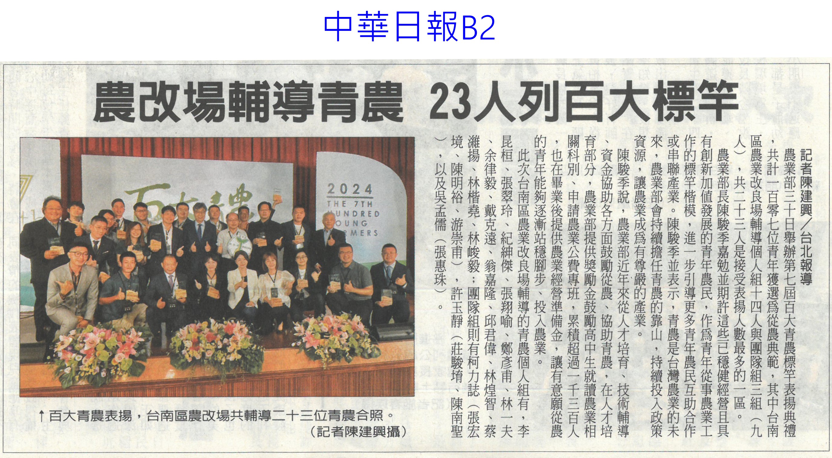 首頁楊眼好新聞 楊眼好新聞 排序 發布日期 更新日期 序號 發布日期 標題 561. 113/09/03 等了2年 陸恢復臺灣文旦柚輸入(中國時報A9) 562. 113/09/02 農民傷病給付 前2月日領增至680元(自由時報A6) 563. 113/09/02 張麗善與青農交流新生傾聽心聲(台灣新生報6) 564. 113/09/02 百大青農標竿表揚 107人獲獎(民眾日報4) 565. 113/09/02 農改場輔導青農 23人列百大標竿(中華日報B2) 566. 113/08/27 台日大港水果祭 笠間市推廣花蓮文旦(民眾日報16) 567. 113/08/23 胡忠一率團出席APEC糧食安全部長會議(民眾日報2) 568. 113/08/23 國土畫設 雲縣議會要求修正農一比例(中國時報A9) 569. 113/08/23 天牛`猴危害農作物 台東農改場研發空氣灌注 `防猴網罩(中華日報B6) 570. 113/08/22 農漁產品外銷 上半年產值破4億(自由時報A11) 571. 113/08/22 台南農產外銷6國 產值破4億(中國時報A9) 572. 113/08/22 農糧署攜全聯 提升國產米使用量(民眾日報16) 573. 113/08/22 農業部結合OK mart 打造全國農產物流網(民眾日報16) 574. 113/08/22 農業部農易送平台 運費省3成(中華日報A4) 575. 113/08/19 雲國土計畫說明會 土庫開講(台灣新生報7) 576. 113/08/14 農民職災保險 月底納入皮膚癌(自由時報A9) 577. 113/08/14 中元物價查核 蔬果漲幅3成(中華日報B8) 578. 113/08/14 極端氣候衝擊大 乾旱+淹水 青農索性離農(聯合報A2) 579. 113/08/14 嘉義優鮮進軍國際 東京展售獲回響(臺灣時報18) 580. 113/08/14 雲林永續農業 雞屎牛糞變有機肥(中國時報A9) 第 29/126 頁,共 2502 筆上一頁到第123456789101112131415161718192021222324252627282930313233343536373839404142434445464748495051525354555657585960616263646566676869707172737475767778798081828384858687888990919293949596979899100101102103104105106107108109110111112113114115116117118119120121122123124125126頁下一頁每頁103070筆資料