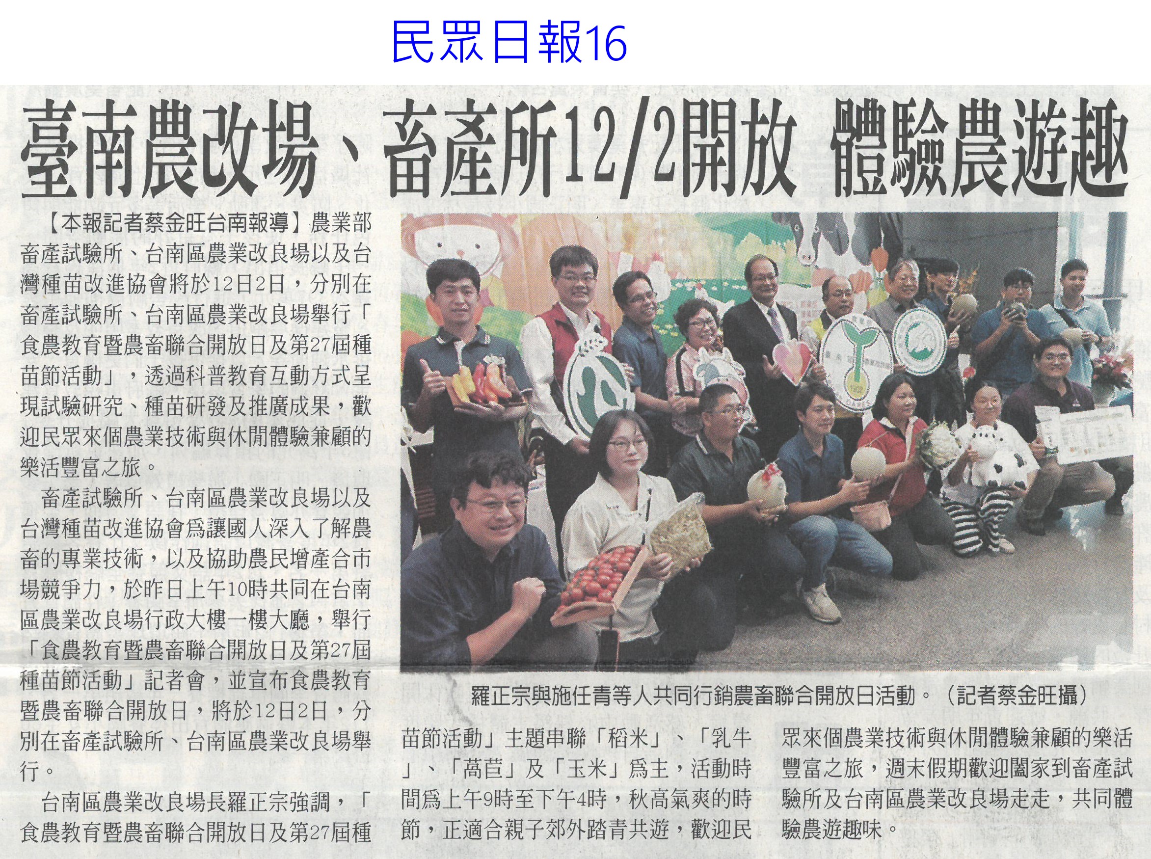 首頁楊眼好新聞 楊眼好新聞 排序 發布日期 更新日期 序號 發布日期 標題 701. 112/12/07 日日好農體驗從牧場到餐桌(中華日報B3) 702. 112/12/07 南市綠色照顧 3農會獲獎(台灣新生報8) 703. 112/12/07 農畜聯合開放日 食農教育秀成果(自由時報A12) 704. 112/12/07 推動氣候智慧型農業 迫在眉睫(聯合報A11) 705. 112/12/07 農業保險覆蓋率過半?自願僅6%?(聯合報A5) 706. 112/12/07 食農教育 日日好農親子同遊體驗(民眾日報16) 707. 112/12/07 百大青農遴選 線上線下同時開跑(民眾日報6) 708. 112/12/07 台南新化果菜市場 明年啟動蔬菜拍賣(中國時報A9) 709. 112/12/07 農會百大精品登場 嚴選122家優良商家(民眾日報4) 710. 112/12/07 吃不消 蔬果外食漲幅高(臺灣時報1) 711. 112/12/01 農畜聯合開放 乳牛食農教育 玉米成果展(自由時報A13) 712. 112/12/01 臺南農改場 畜產所12/2開放 體驗農遊趣(民眾日報16) 713. 112/12/01 南市農水路改善 成果全國第一(台灣新生報6) 714. 112/12/01 南臺灣有機友善耕作面積 全國第一(中華日報B8) 715. 112/12/01 台灣燈會伴手禮 60大農特產入選(中華日報B8) 716. 112/12/01 農畜聯合開放日 12/2邀親子同歡(中華日報B8) 717. 112/12/01 台南60大農特產伴手禮出爐(中國時報A9) 718. 112/12/01 與農共舞 嘉縣18校展成果(中國時報A9) 719. 112/11/29 楠西照興擴大灌溉服務開工(中華日報B8) 720. 112/11/23 加入小地主大專業農行列 提升農業競爭力(中華日報B1) 第 36/117 頁,共 2337 筆上一頁到第123456789101112131415161718192021222324252627282930313233343536373839404142434445464748495051525354555657585960616263646566676869707172737475767778798081828384858687888990919293949596979899100101102103104105106107108109110111112113114115116117頁下一頁每頁103070筆資料