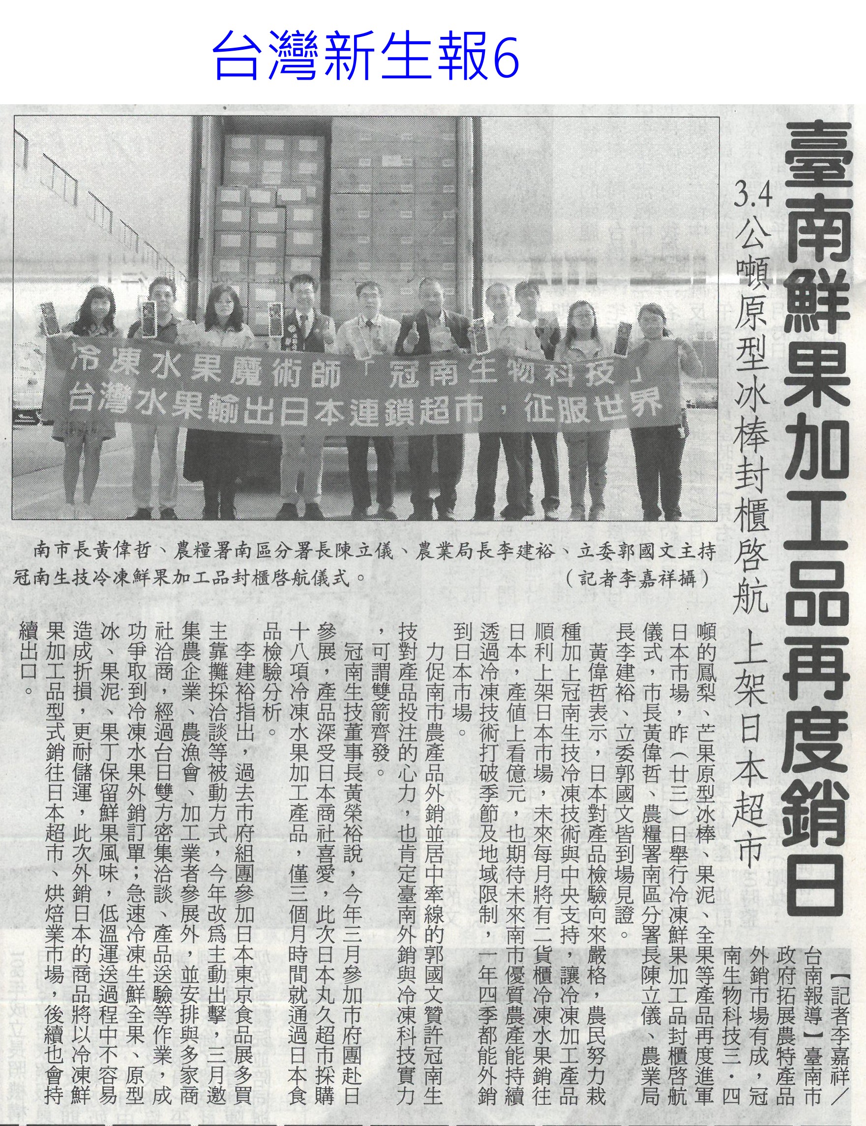首頁楊眼好新聞 楊眼好新聞 排序 發布日期 更新日期 序號 發布日期 標題 741. 112/10/30 雲遊四海皆良品 雲林縣40聯名專區上架開跑(中國時報A9) 742. 112/10/30 省時省工 解決農業缺工 無人機成利器(自由時報A10) 743. 112/10/30 台南表揚四產銷履歷達人(台灣新生報8) 744. 112/10/30 曾文 南化水庫聯通管 明年6月通水(聯合報B2) 745. 112/10/30 雲林良品 40多據點上架(台灣新生報7) 746. 112/10/25 小犬農損 雲林爭取20項現金救助(臺灣時報18) 747. 112/10/25 省工省時 推廣機械代施禽畜糞肥料(自由時報A15) 748. 112/10/25 農機施肥省成本 佳里辦田間觀摩(中華日報B8) 749. 112/10/25 產銷履歷達人 得獎數冠全國(中華日報B1) 750. 112/10/24 臺南鮮果加工品再度銷日(台灣新生報6) 751. 112/10/24 鮮果加工凍起來 3.4萬噸銷日(中華日報B8) 752. 112/10/24 雲林良品專區 擴大行銷優質農產(中國時報A9) 753. 112/10/23 台灣國際農機資材展 開幕(台灣新生報7) 754. 112/10/23 嘉縣國際農機展 判商機突破6億(中國時報A9) 755. 112/10/23 南市八農漁會榮獲農金獎(台灣新生報8) 756. 112/10/23 112年度產銷履歷達人 頒獎(民眾日報4) 757. 112/10/20 農業補助 議員認應有未來性(中華日報B2) 758. 112/10/20 嘉縣廢農膜回收 再造新價值(中國時報A9) 759. 112/10/19 明年春耕 供灌無虞(自由時報A13) 760. 112/10/19 水情樂觀 明年梅雨季前用水無虞(中華日報B8) 第 38/117 頁,共 2337 筆上一頁到第123456789101112131415161718192021222324252627282930313233343536373839404142434445464748495051525354555657585960616263646566676869707172737475767778798081828384858687888990919293949596979899100101102103104105106107108109110111112113114115116117頁下一頁每頁103070筆資料
