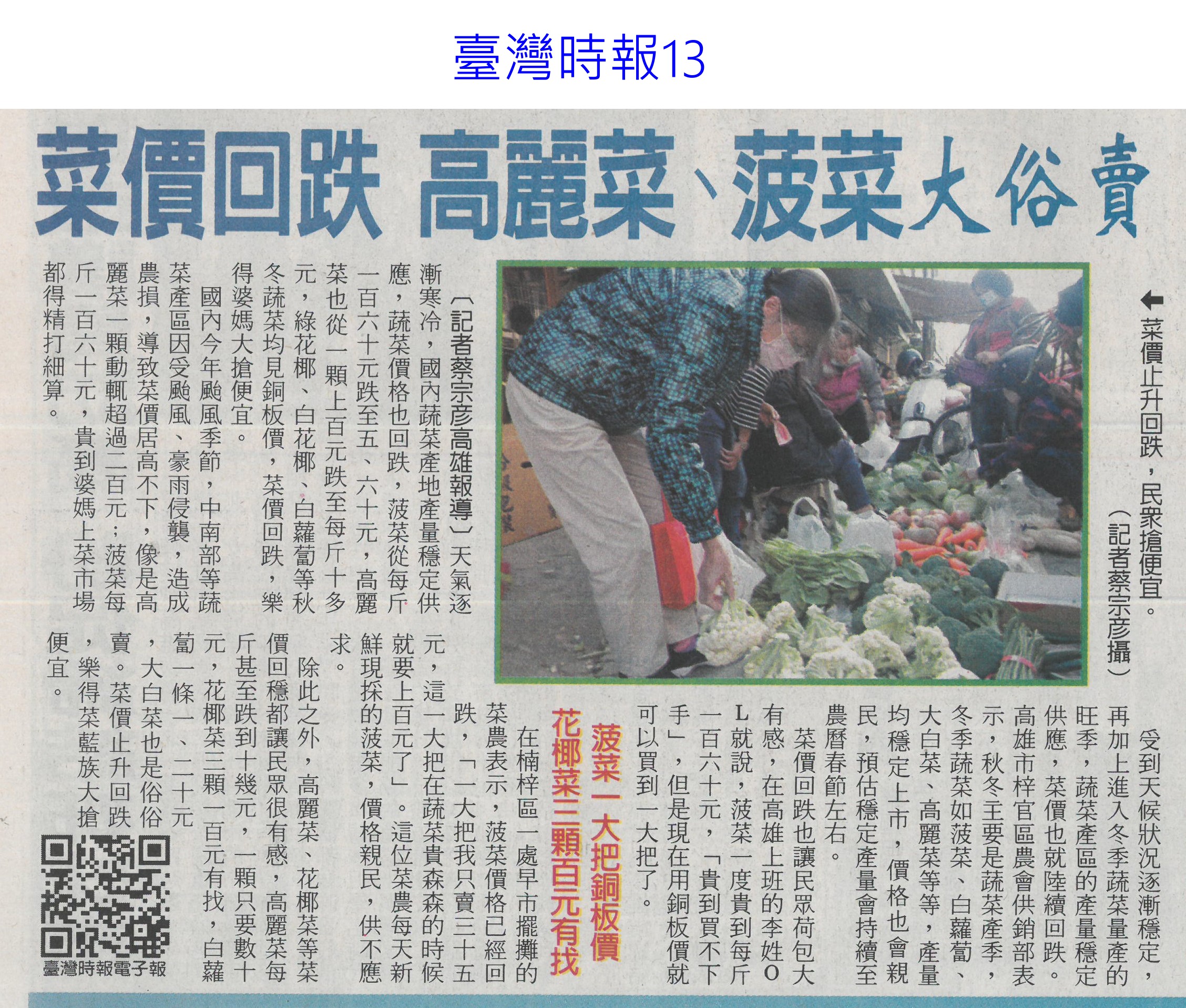 首頁甘藍新鮮聞 甘藍新鮮聞 排序 發布日期 更新日期 序號 發布日期 標題 241. 114/12/04 菜價回跌 高麗菜 菠菜大俗賣(臺灣時報13) 242. 114/12/04 台南農再有成 獲農業部雙向肯定(中華日報B3) 243. 114/12/04 張啓楷12/5嘉義市公益送菜 挺農民免費送市民 244. 114/11/29 雲林冬季盛產登場 香蕉、高麗菜進國道服務區亮相 245. 114/11/26 2024 糧食年報 01》糧食自給率 30.7% 止跌回升,食米量、地瓜上升,蔬果雙下降(2025公布) 246. 114/11/18 高麗菜價崩盤 自採(聯合報B1) 247. 114/11/18 憂心血泡湯 雲林菜農趁風雨前搶收(自由時報A10) 248. 114/11/18 中部菜農搶收 不能讓老天收(聯合報A5) 249. 114/11/16 廣角鏡/彰化縣高麗菜撿便宜 自己採 250. 114/11/13 農民搶收到貨量增 菜價微跌(中國時報A8) 251. 114/11/13 台南農村再生嘉年華 52個社區參與(自由時報A10) 252. 114/11/13 有機生活日 水果小鎮出任務(民眾日報5) 253. 114/11/13 虎科大推水井鹽地番茄食農教育(台灣新生報6) 254. 114/11/13 嘉大辦理有機農業精準作物調查登載(民眾日報12) 255. 114/11/13 如何辨別高麗菜壞掉? 日廚師曝「腐敗3警訊」 256. 114/11/11 黃偉哲領軍 台南鮮果星國開賣(臺灣時報6) 257. 114/11/11 台北旅展 農業部打造永續農遊新風潮(民眾日報16) 258. 114/11/09 鳳凰颱風襲台機率高買菜熱絡 菜價、豬價批發價略漲 259. 114/11/03 創新緩控釋肥論壇 打造綠色農業(中華日報A4) 260. 114/11/03 中華郵政農糧署合作 (臺灣時報18) 第 13/194 頁,共 3878 筆上一頁到第123456789101112131415161718192021222324252627282930313233343536373839404142434445464748495051525354555657585960616263646566676869707172737475767778798081828384858687888990919293949596979899100101102103104105106107108109110111112113114115116117118119120121122123124125126127128129130131132133134135136137138139140141142143144145146147148149150151152153154155156157158159160161162163164165166167168169170171172173174175176177178179180181182183184185186187188189190191192193194頁下一頁每頁103070筆資料