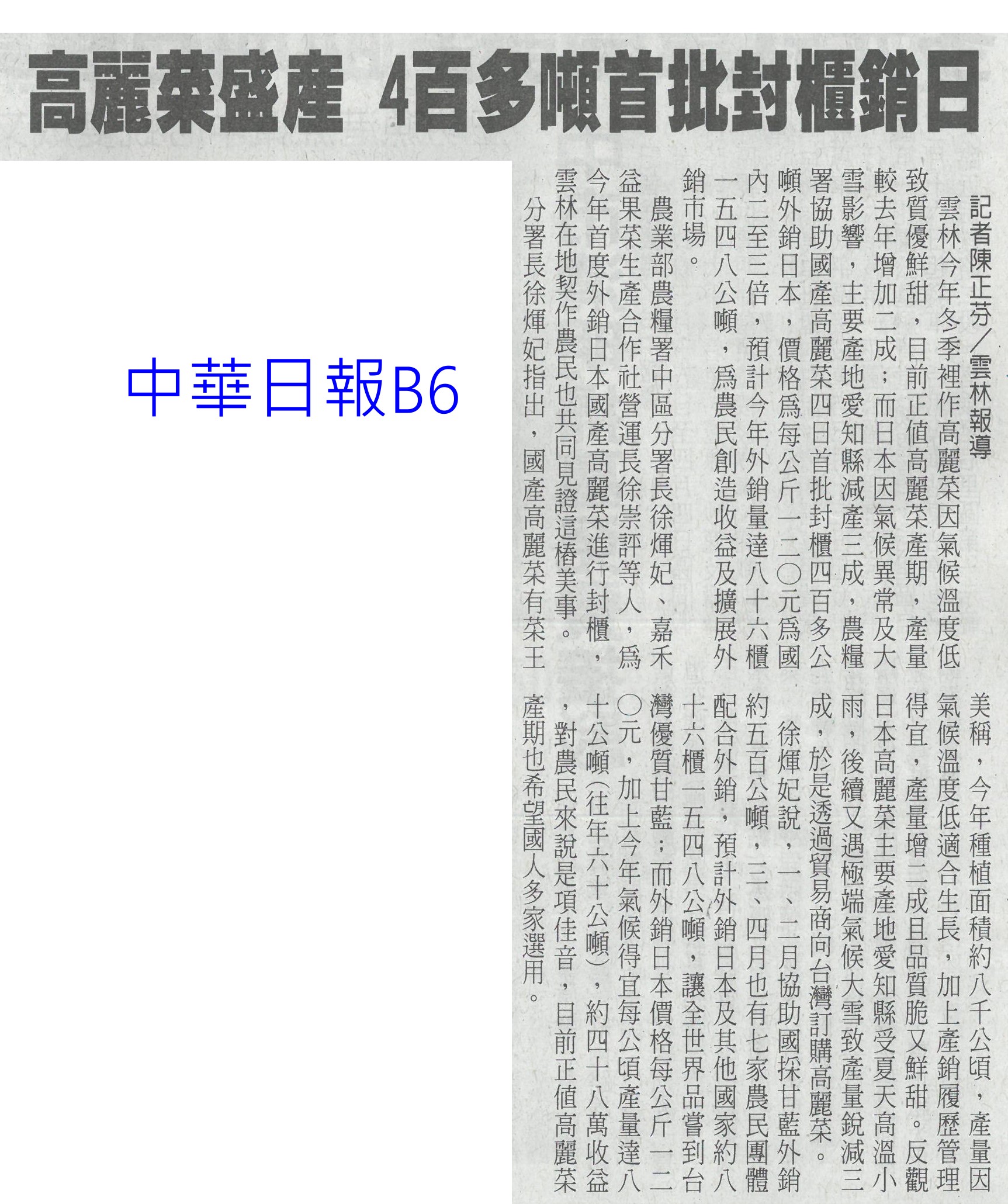 首頁甘藍新鮮聞 甘藍新鮮聞 排序 發布日期 更新日期 序號 發布日期 標題 501. 114/03/13 雲林良品強勢出擊東京食品展(台灣新生報6) 502. 114/03/13 台南進軍東京國際食品展(台灣新生報6) 503. 114/03/13 台南好物登東京 創佳績(中華日報B8) 504. 114/03/12 嘉縣八食品業者 赴東京參展(臺灣時報18) 505. 114/03/12 東京食品展開幕 翁章梁 黃敏惠率隊搶商機(台灣新生報6) 506. 114/03/12 東京食品展 雲林良品強勢出擊(中華日報B6) 507. 114/03/12 東京食品展開幕 TAIWAN SELECT展食力(中華日報A4) 508. 114/03/12 高麗菜怎麼炒最好吃?專家教「1方法」鮮甜爽脆,加碼3招延長保存期限 509. 114/03/11 鄉間小路進出難 農地重劃升級(自由時報A9) 510. 114/03/11 嘉市青農送菜 營業額破千萬(聯合報B2) 511. 114/03/11 台北花博農民市集 展售全台特色農產品(民眾日報6) 512. 114/03/11 專家:臺灣農業要找強項 打品牌(聯合報A5) 513. 114/03/11 台灣農村好物 進軍日本(民眾日報15) 514. 114/03/11 蘭展精品館 逾400農特產品上架(中華日報B8) 515. 114/03/11 雲林良品 登陸東京食品展(中國時報A9) 516. 114/03/10 炒高麗菜「脆又甜」秘訣!掌握4步驟、1關鍵 在家炒出熱炒店等級美味 517. 114/03/07 高麗菜盛產 4百多噸首批封櫃銷日(中華日報B6) 518. 114/03/07 水果貴桑桑 高麗菜1顆30元(中華日報A4) 519. 114/03/07 高麗菜銷日 農民收益增(中國時報A9) 520. 114/03/07 攜小七 農村水保署行銷農村好物(民眾日報15) 第 26/194 頁,共 3878 筆上一頁到第123456789101112131415161718192021222324252627282930313233343536373839404142434445464748495051525354555657585960616263646566676869707172737475767778798081828384858687888990919293949596979899100101102103104105106107108109110111112113114115116117118119120121122123124125126127128129130131132133134135136137138139140141142143144145146147148149150151152153154155156157158159160161162163164165166167168169170171172173174175176177178179180181182183184185186187188189190191192193194頁下一頁每頁103070筆資料