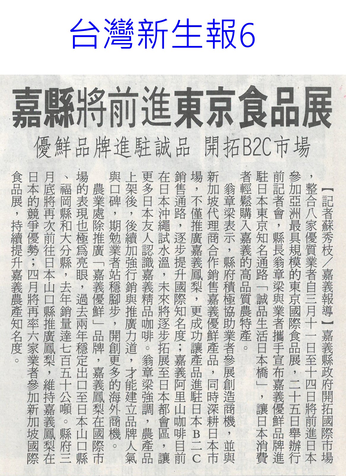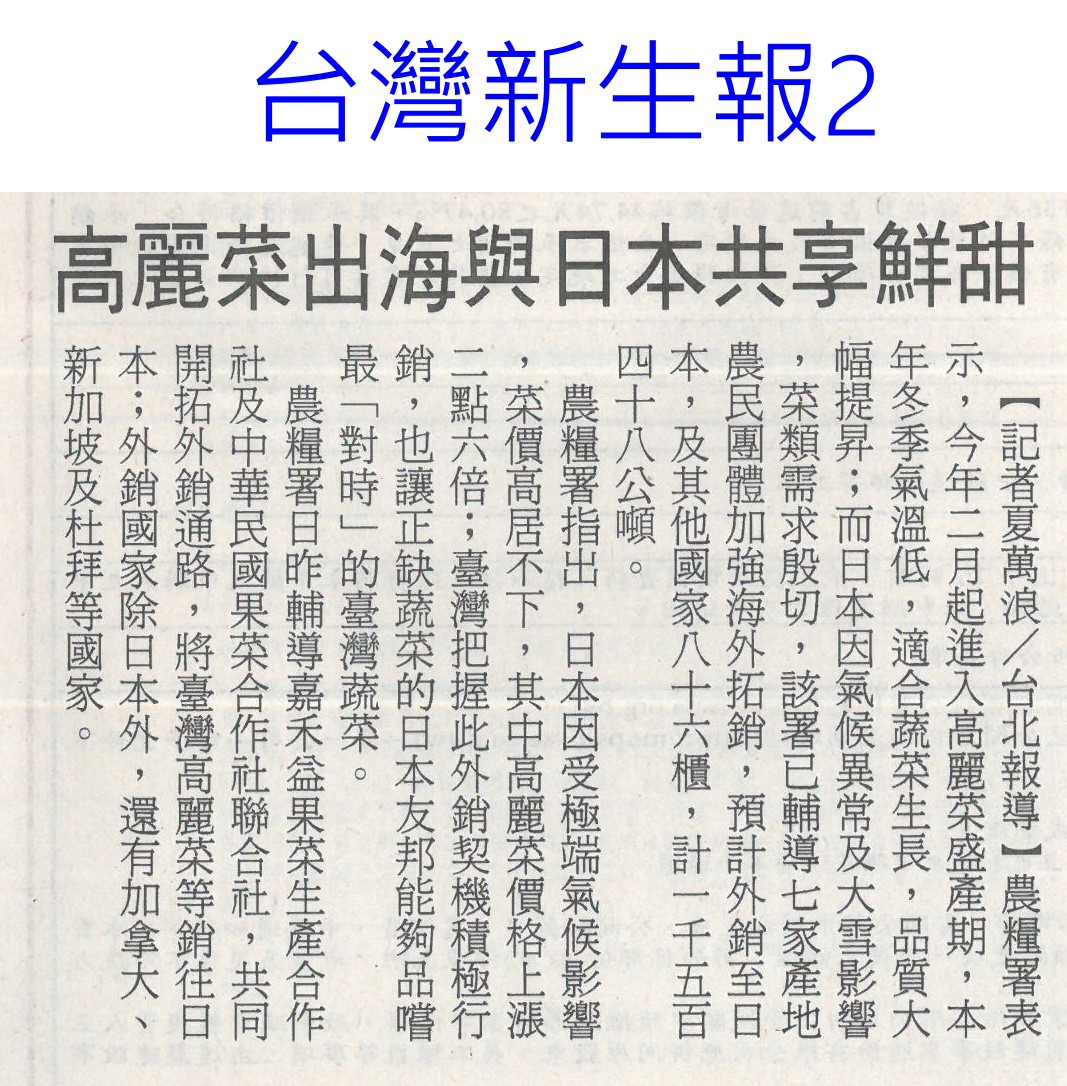 首頁甘藍新鮮聞 甘藍新鮮聞 排序 發布日期 更新日期 序號 發布日期 標題 521. 114/03/07 台灣野生植物資訊 e指搞定(自由時報A8) 522. 114/03/07 黃敏惠推我嘉的伴手禮(台灣新生報6) 523. 114/03/07 雲林良品 進軍東京食品展(台灣新生報6) 524. 114/03/07 北農辦理北市府高麗菜團購活動 提升農民收益 525. 114/03/06 高麗菜出海與日本共享鮮甜(台灣新生報2) 526. 114/03/05 日本雪災高麗菜不足 台灣外銷「賺20倍利潤」 527. 114/03/05 北農外銷再突破!「18噸國產高麗菜」明天出口到日本 528. 114/03/05 高麗菜價崩!農民開放「10元1顆」自採 529. 114/03/04 南部5縣市長 東京食品展搶訂單(聯合報B2) 530. 114/03/04 極端氣候影響收成!日本菜價居高不下 雲林高麗菜拚外銷 531. 114/03/04 日本蔬菜價格飆升 農糧署助攻台灣甘藍拓展外銷版圖 532. 114/03/03 嘉縣八業者 前進東京國際食品展(臺灣時報18) 533. 114/03/03 3大量販店開賣國產平價蔬果(自由時報A10) 534. 114/03/03 農業部攜量販通路 推蔬果平價專區(民眾日報6) 535. 114/03/03 嘉縣將前進東京食品展(台灣新生報6) 536. 114/03/03 農業部推量販通路蔬果專區(台灣新生報3) 537. 114/03/03 農村水保署推農村好物 進軍統超i預購(民眾日報4) 538. 114/03/03 高麗菜每斤15元大俗賣 婆媽撿便宜(臺灣時報14) 539. 114/03/03 卓揆:積極推動有機農業發展(民眾日報2) 540. 114/03/03 雲林農村再生 中央今年再補助逾1.2億(自由時報A10) 第 27/194 頁,共 3878 筆上一頁到第123456789101112131415161718192021222324252627282930313233343536373839404142434445464748495051525354555657585960616263646566676869707172737475767778798081828384858687888990919293949596979899100101102103104105106107108109110111112113114115116117118119120121122123124125126127128129130131132133134135136137138139140141142143144145146147148149150151152153154155156157158159160161162163164165166167168169170171172173174175176177178179180181182183184185186187188189190191192193194頁下一頁每頁103070筆資料