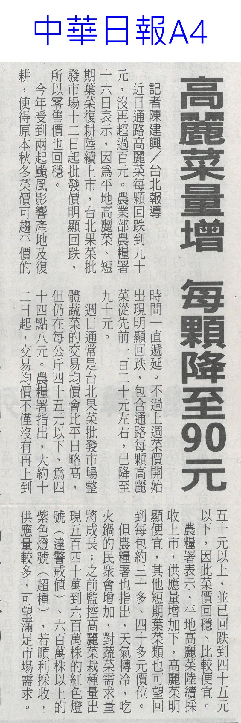 首頁甘藍新鮮聞 甘藍新鮮聞 排序 發布日期 更新日期 序號 發布日期 標題 621. 113/12/30 葉菜復耕上市 春節前趨平穩(中華日報A4) 622. 113/12/30 天然災害救助辦法 農業部預告修正(民眾日報2) 623. 113/12/30 台南農產外銷 拼出8億成績(自由時報A11) 624. 113/12/30 南市農業局 行銷商機近8億元(中國時報A9) 625. 113/12/30 台南農特產赴新北行銷 搶春節商機(中華日報B2) 626. 113/12/29 秋颱連發 歷史上首次10月2颱風襲台 11月4颱共舞 627. 113/12/24 冬瓜每斤飆40元天價!菜販驚:30年來最貴 5款蔬菜漲最兇 628. 113/12/22 菜價降3成!葉菜每斤20元起「瓜果類仍偏高」 農糧署:年節供應無虞 629. 113/12/22 菜價降3成!葉菜每斤20元起 農糧署:價格回穩年節供應無虞 630. 113/12/19 10種蔬菜一堆人不愛吃!醫大讚:很健康 631. 113/12/18 冬季蔬菜量產 價格見平穩(中華日報A4) 632. 113/12/18 農糧署:蔬菜價格逐漸平穩(台灣時報14) 633. 113/12/18 了解碳權 有助農業轉型升級(中華日報B3) 634. 113/12/18 高麗菜量增 每顆降至90元(中華日報A4) 635. 113/12/18 農糧署打造有機農業專區 提供全方位服務(民眾日報4) 636. 113/12/18 太康有機專區冷鏈 新鮮送達(中華日報B8) 637. 113/12/18 雜糧 蔬菜與茶 可農機代耕(中華日報A4) 638. 113/12/16 青菜怎洗才沒農藥?全場推「簡單1招」 食藥署解答了 639. 113/12/16 火鍋改吃「山茼蒿」香氣更濃郁 農糧署推6大鍋物蔬菜 640. 113/12/15 防癌還能降血壓!醫揭「花椰菜」益處:效果可觀 第 32/194 頁,共 3878 筆上一頁到第123456789101112131415161718192021222324252627282930313233343536373839404142434445464748495051525354555657585960616263646566676869707172737475767778798081828384858687888990919293949596979899100101102103104105106107108109110111112113114115116117118119120121122123124125126127128129130131132133134135136137138139140141142143144145146147148149150151152153154155156157158159160161162163164165166167168169170171172173174175176177178179180181182183184185186187188189190191192193194頁下一頁每頁103070筆資料
