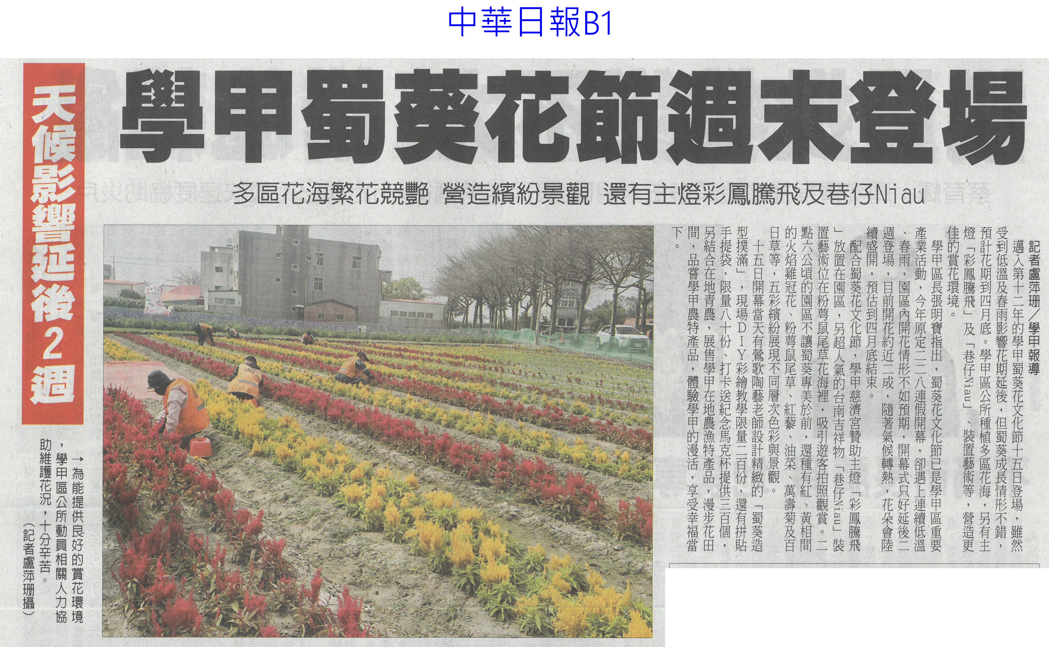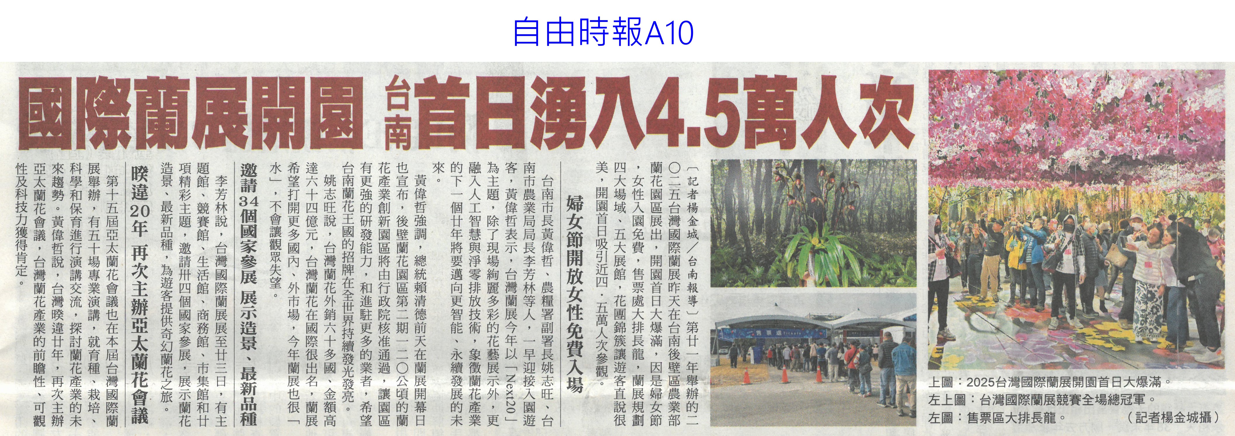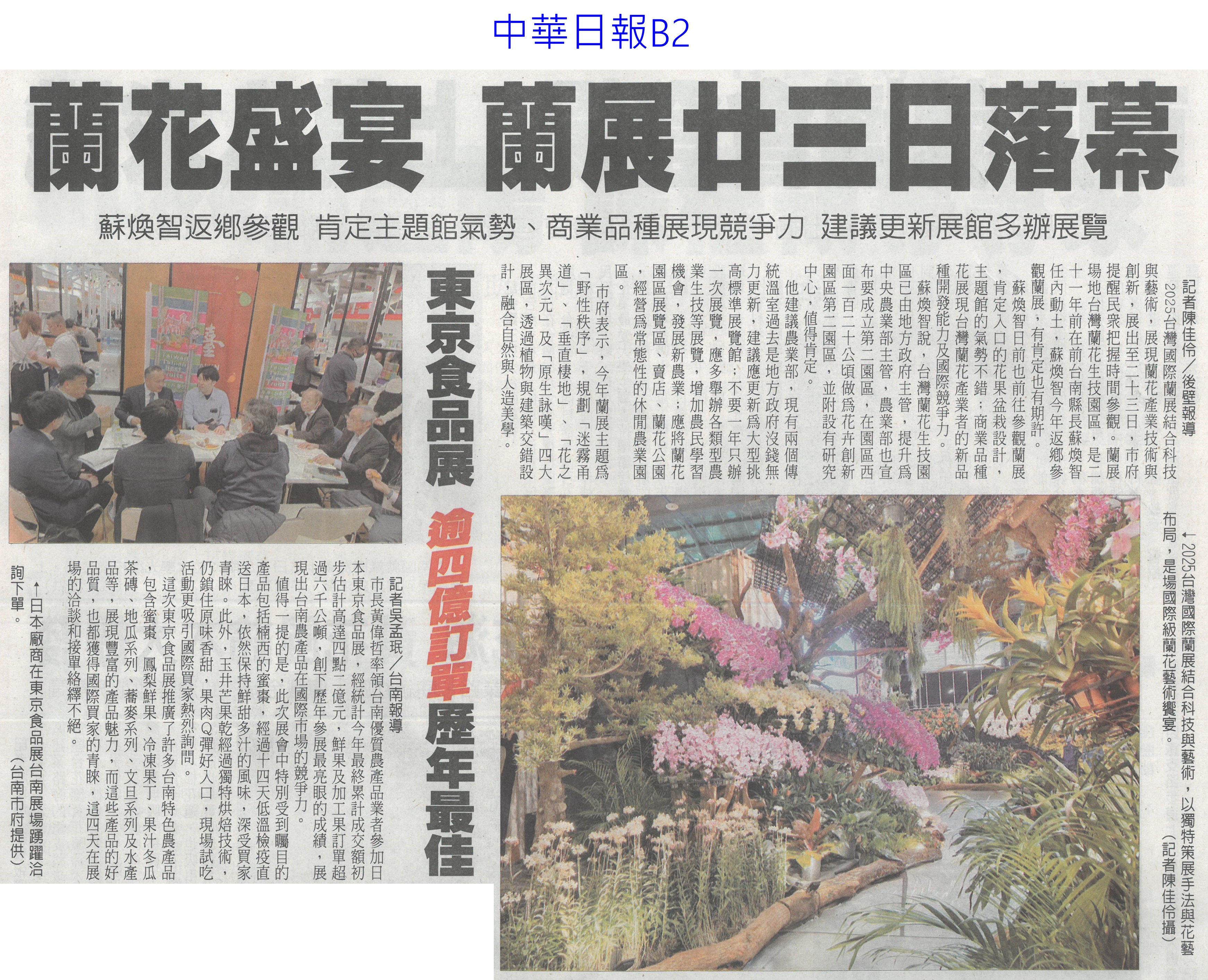 首頁花現新聞 花現新聞 排序 發布日期 更新日期 序號 發布日期 標題 261. 114/03/18 農糧署米糧烘焙精品館 秀新招(民眾日報4) 262. 114/03/17 出租農地設光電? 雲林逾5千農民 面臨強制退保(聯合報A6) 263. 114/03/17 台南優質廠商驚豔日本東京食品展(中華日報B8) 264. 114/03/17 張麗善訪日 考察農業 地方創生(中國時報A9) 265. 114/03/17 蘭花盛宴 蘭展23落幕(中華日報B2) 266. 114/03/13 東京食品展 台南2天接2億訂單(臺灣時報19) 267. 114/03/13 雲林良品強勢出擊東京食品展(台灣新生報6) 268. 114/03/13 台南進軍東京國際食品展(台灣新生報6) 269. 114/03/13 台南好物登東京 創佳績(中華日報B8) 270. 114/03/12 嘉縣八食品業者 赴東京參展(臺灣時報18) 271. 114/03/12 東京食品展開幕 翁章梁 黃敏惠率隊搶商機(台灣新生報6) 272. 114/03/12 東京食品展 雲林良品強勢出擊(中華日報B6) 273. 114/03/12 學甲屬葵花節周末登場(中華日報B1) 274. 114/03/12 東京食品展開幕 TAIWAN SELECT展食力(中華日報A4) 275. 114/03/11 國際蘭展開園 台南首日湧入4.5萬人次(自由時報A10) 276. 114/03/11 蘭花園區二期4年投入68.2億(中華日報B1) 277. 114/03/11 鄉間小路進出難 農地重劃升級(自由時報A9) 278. 114/03/11 國際蘭展開幕 賴清德:推動二期園區(自由時報A11) 279. 114/03/11 台北花博農民市集 展售全台特色農產品(民眾日報6) 280. 114/03/11 專家:臺灣農業要找強項 打品牌(聯合報A5) 第 14/125 頁,共 2496 筆上一頁到第123456789101112131415161718192021222324252627282930313233343536373839404142434445464748495051525354555657585960616263646566676869707172737475767778798081828384858687888990919293949596979899100101102103104105106107108109110111112113114115116117118119120121122123124125頁下一頁每頁103070筆資料