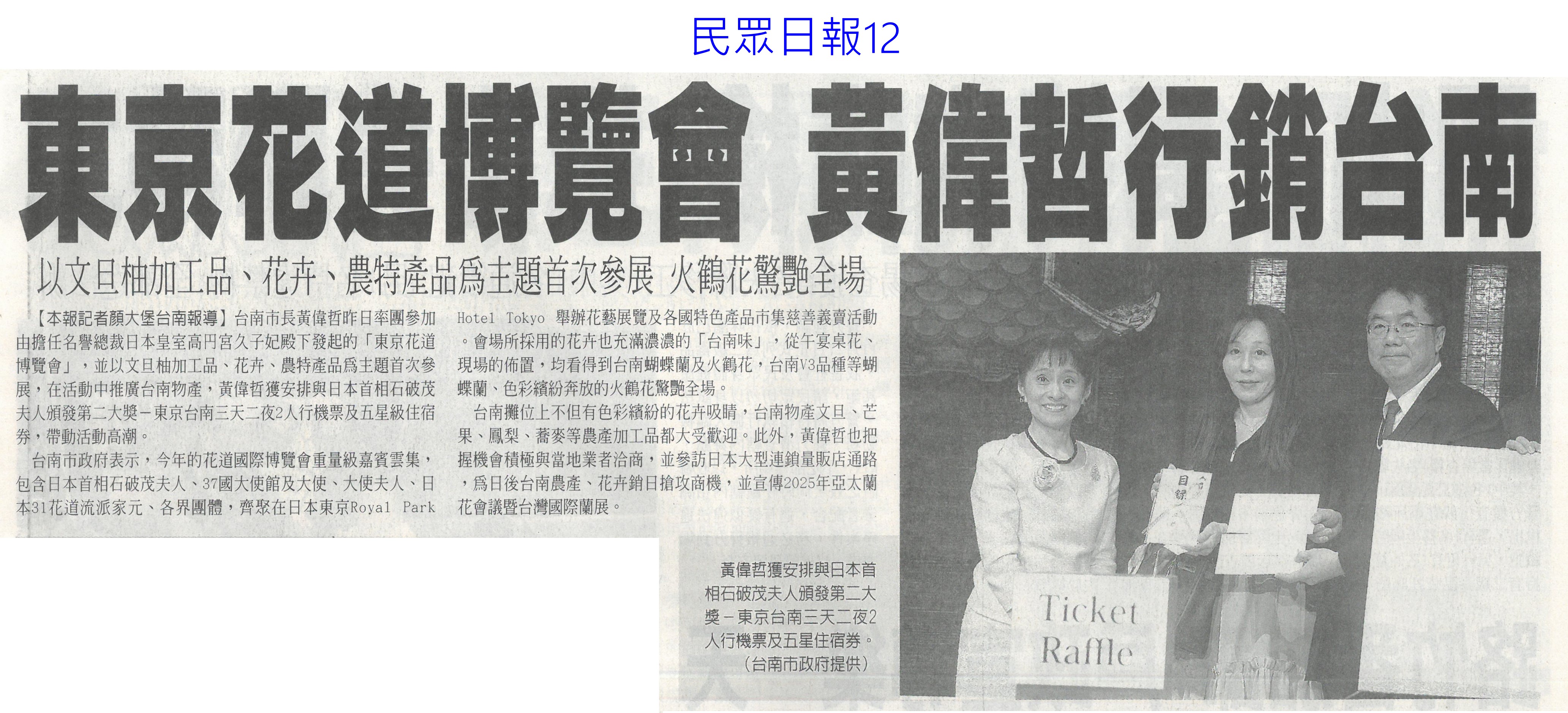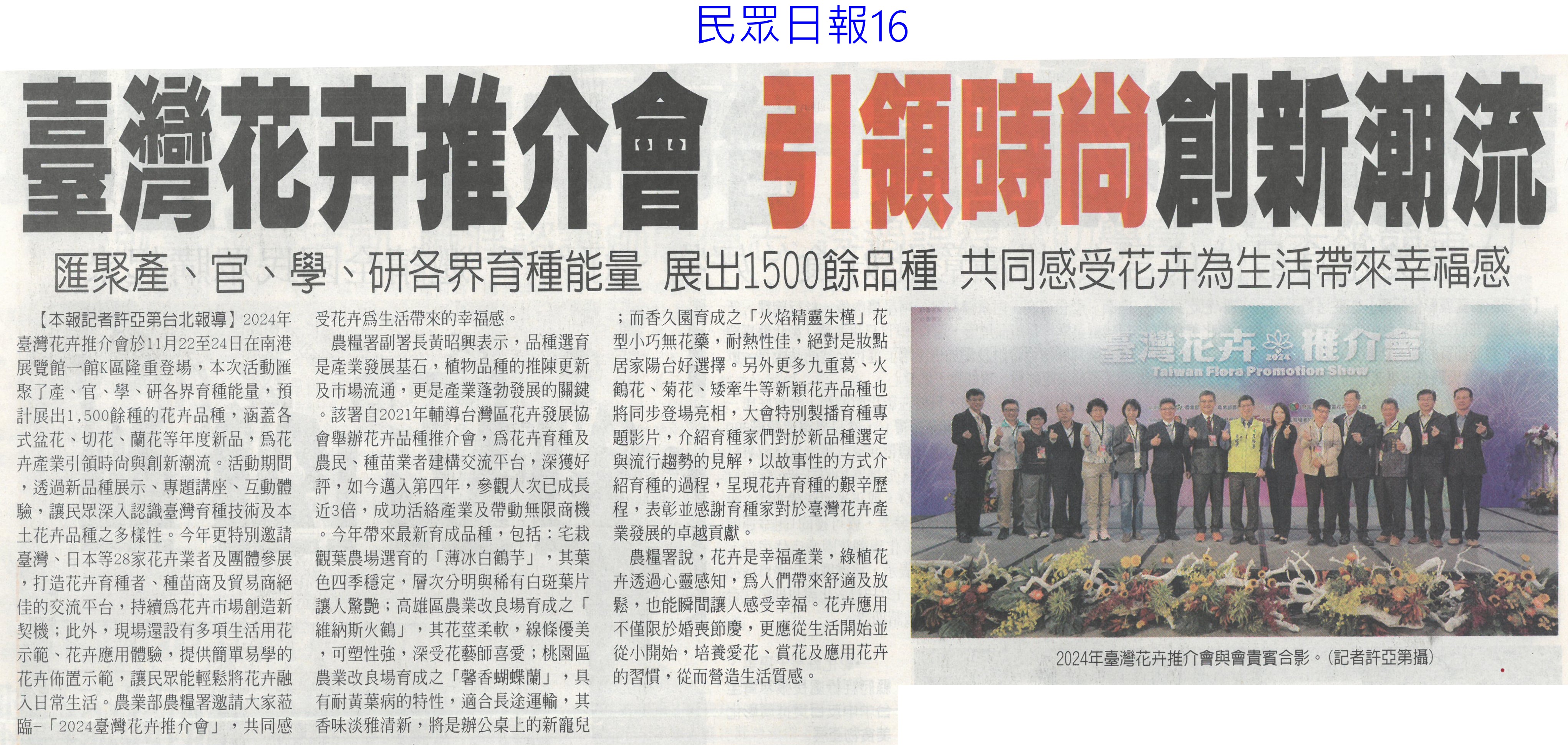 首頁花現新聞 花現新聞 排序 發布日期 更新日期 序號 發布日期 標題 361. 113/12/12 科技保險助力農業科技創新(工商時報A8) 362. 113/12/11 支持青農返鄉 市有耕地公告放租(中華日報B1) 363. 113/12/11 雲縣府/雲科大 推一驗多証制度(台灣新生報6) 364. 113/12/11 雲科大一驗多証 造福農漁牧(中國時報A9) 365. 113/12/11 資源循環零廢棄 創造永續農業新價值(民眾日報8) 366. 113/12/11 農業廢棄物變新綠金(自由時報A1) 367. 113/12/11 東京花道博覽會 花卉濃濃台南味(自由時報A11) 368. 113/12/11 東京花道博覽會 黃偉哲行銷台南(民眾日報12) 369. 113/12/11 復耕菜逐步上市 菜價仍在高檔(中華日報A4) 370. 113/12/11 東京國際花道博覽會 飄台南味(中國時報A9) 371. 113/12/10 豔驚四座 台南蘭花火鶴花首度參展東京國際花道博覽會 372. 113/12/10 黃偉哲赴東京參加花道博覽會 台南蘭花.火鶴花驚艷全場 373. 113/12/10 豔驚四座 台南蘭花火鶴花首度參展東京國際花道博覽會 374. 113/12/04 內政部:農業權入法無助發展(中華日報A3) 375. 113/12/04 新加坡新台灣館開幕 雲林良品進駐 大受歡迎(台灣新生報10) 376. 113/12/04 臺灣花卉推介會 引領時尚創新潮流(民眾日報16) 377. 113/12/04 褒忠循環農業 國際發光(聯合報B2) 378. 113/12/04 臺灣產銷履歷出於藍 日本派員考察(自由時報A8) 379. 113/12/04 有機世界大會在台舉辦(台灣新生報6) 380. 113/12/04 陳昱初接掌台南農改場(中華日報B2) 第 19/125 頁,共 2496 筆上一頁到第123456789101112131415161718192021222324252627282930313233343536373839404142434445464748495051525354555657585960616263646566676869707172737475767778798081828384858687888990919293949596979899100101102103104105106107108109110111112113114115116117118119120121122123124125頁下一頁每頁103070筆資料