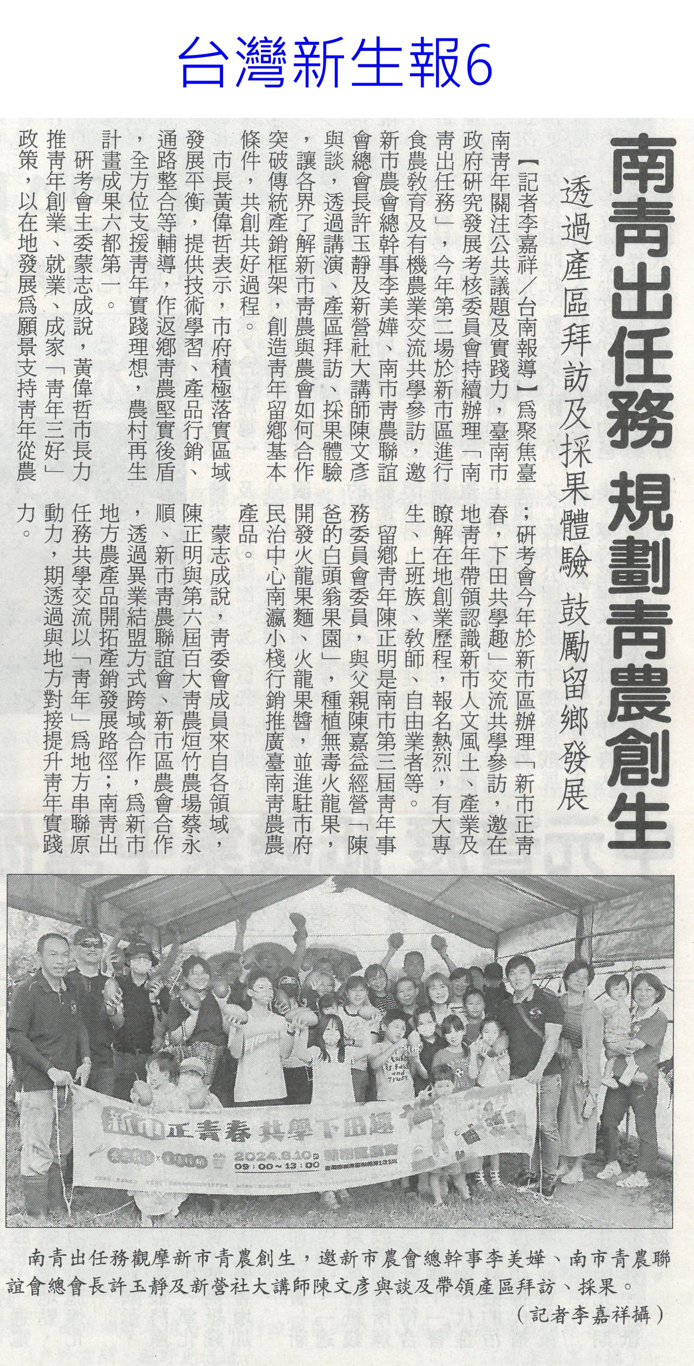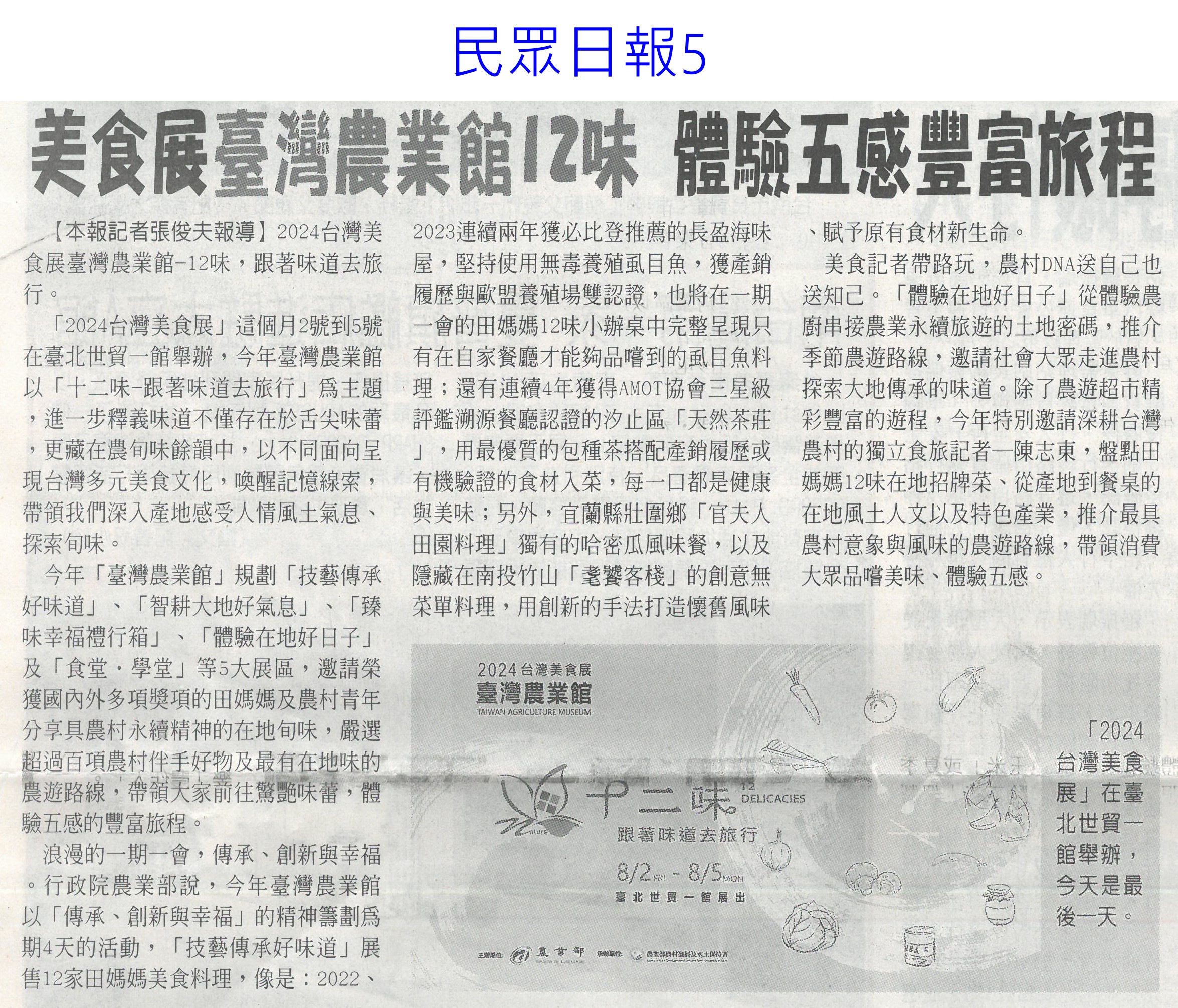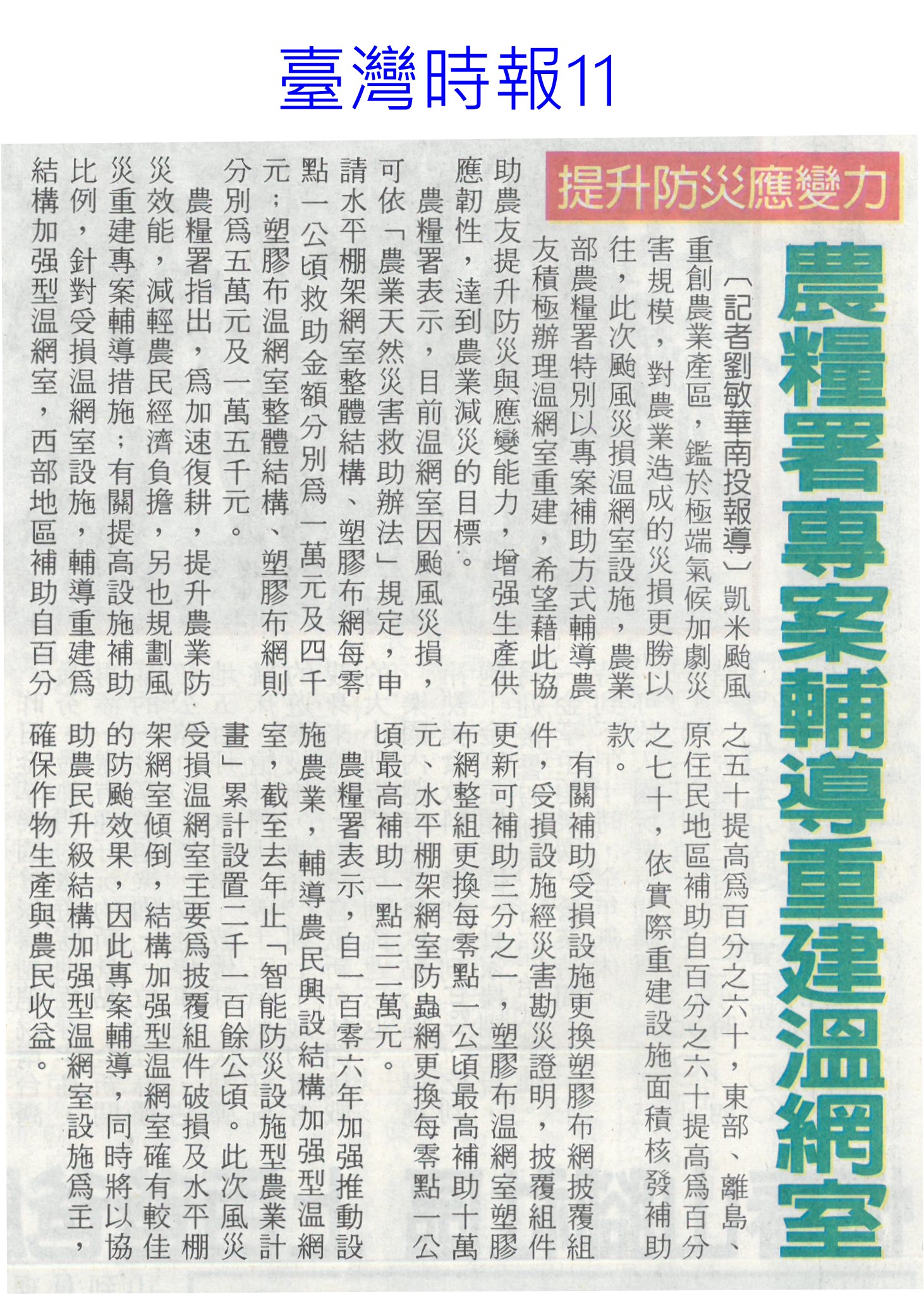 首頁花現新聞 花現新聞 排序 發布日期 更新日期 序號 發布日期 標題 541. 113/08/16 黃偉哲赴新加坡參加最盛大的秋季旅展 力推台南好吃好玩逗陣來 542. 113/08/16 拚台南觀光旅遊!黃偉哲快閃新加坡秋季旅展 543. 113/08/14 農民職災保險 月底納入皮膚癌(自由時報A9) 544. 113/08/14 中元物價查核 蔬果漲幅3成(中華日報B8) 545. 113/08/14 極端氣候衝擊大 乾旱+淹水 青農索性離農(聯合報A2) 546. 113/08/14 嘉義優鮮進軍國際 東京展售獲回響(臺灣時報18) 547. 113/08/14 雲林永續農業 雞屎牛糞變有機肥(中國時報A9) 548. 113/08/14 農產最高漲4倍 氣候通膨傷荷包(中國時報A4) 549. 113/08/12 陳駿季:研議堆疊式農業補貼(聯合報A5) 550. 113/08/12 南青出任務 規劃青農創生(台灣新生報6) 551. 113/08/12 中央對農業權無感 雲林將辦論壇(中國時報A8) 552. 113/08/12 台德協會農業交流經費 農業部喊停(自由時報A8) 553. 113/08/09 提升防災應變力 農糧署專案輔導重建溫網室(臺灣時報11) 554. 113/08/09 農業部與慈心基金會簽署合作備忘錄(民眾日報4) 555. 113/08/09 全國農業專家10傑 興大占6席(中華日報B5) 556. 113/08/09 農業部推園藝療育 可減緩退化(自由時報A10) 557. 113/08/09 山上農漁會互聯網 啟動店到店服務(中華日報B3) 558. 113/08/07 假農民寄生農保 農會挺嚴查 盼法令更明確(自由時報A9) 559. 113/08/07 颱風推升蔬菜價 7月年增2.52%(自由時報A7) 560. 113/08/06 美食展臺灣農業館12味 體驗五感豐富旅程(民眾日報5) 第 28/129 頁,共 2567 筆上一頁到第123456789101112131415161718192021222324252627282930313233343536373839404142434445464748495051525354555657585960616263646566676869707172737475767778798081828384858687888990919293949596979899100101102103104105106107108109110111112113114115116117118119120121122123124125126127128129頁下一頁每頁103070筆資料