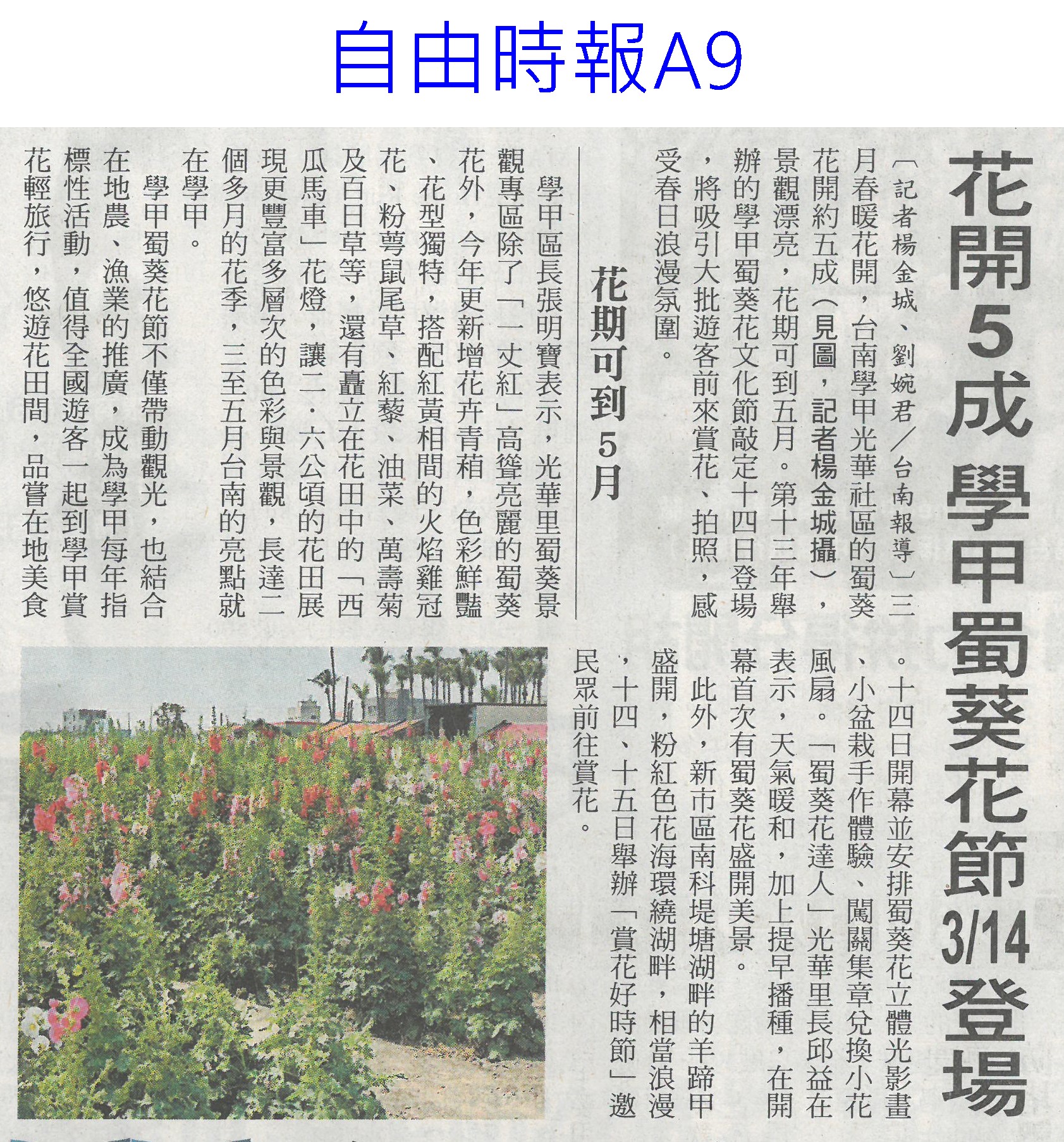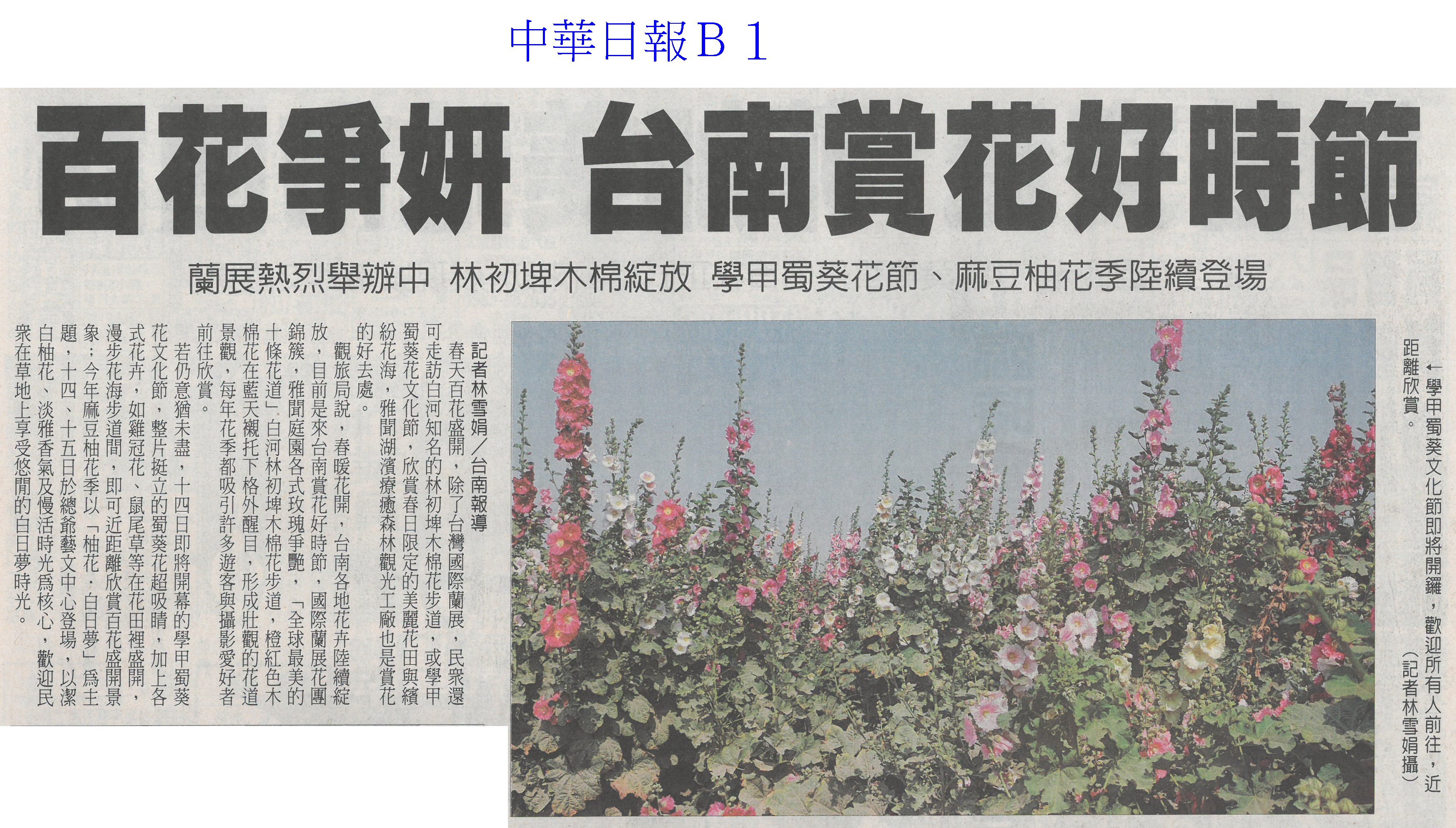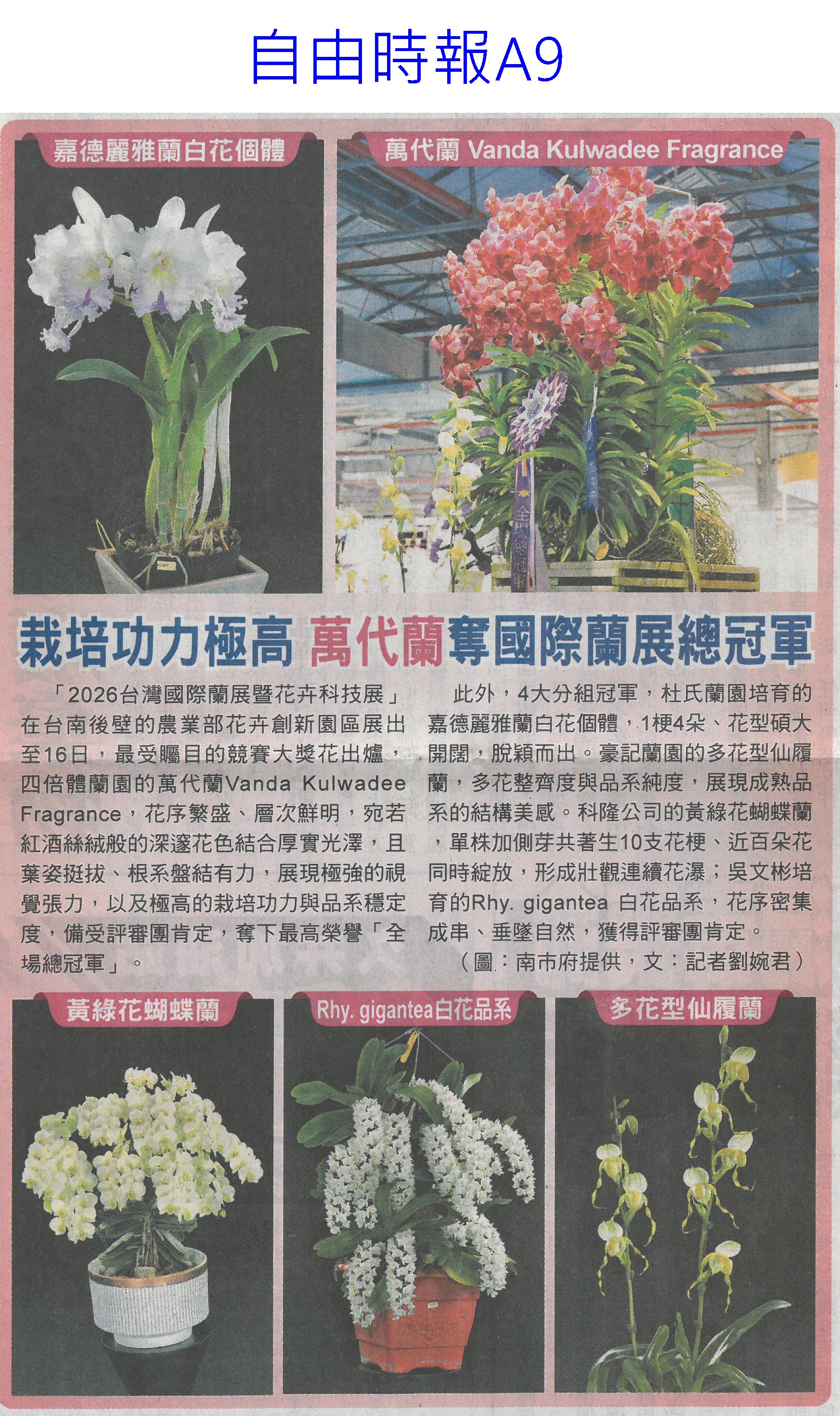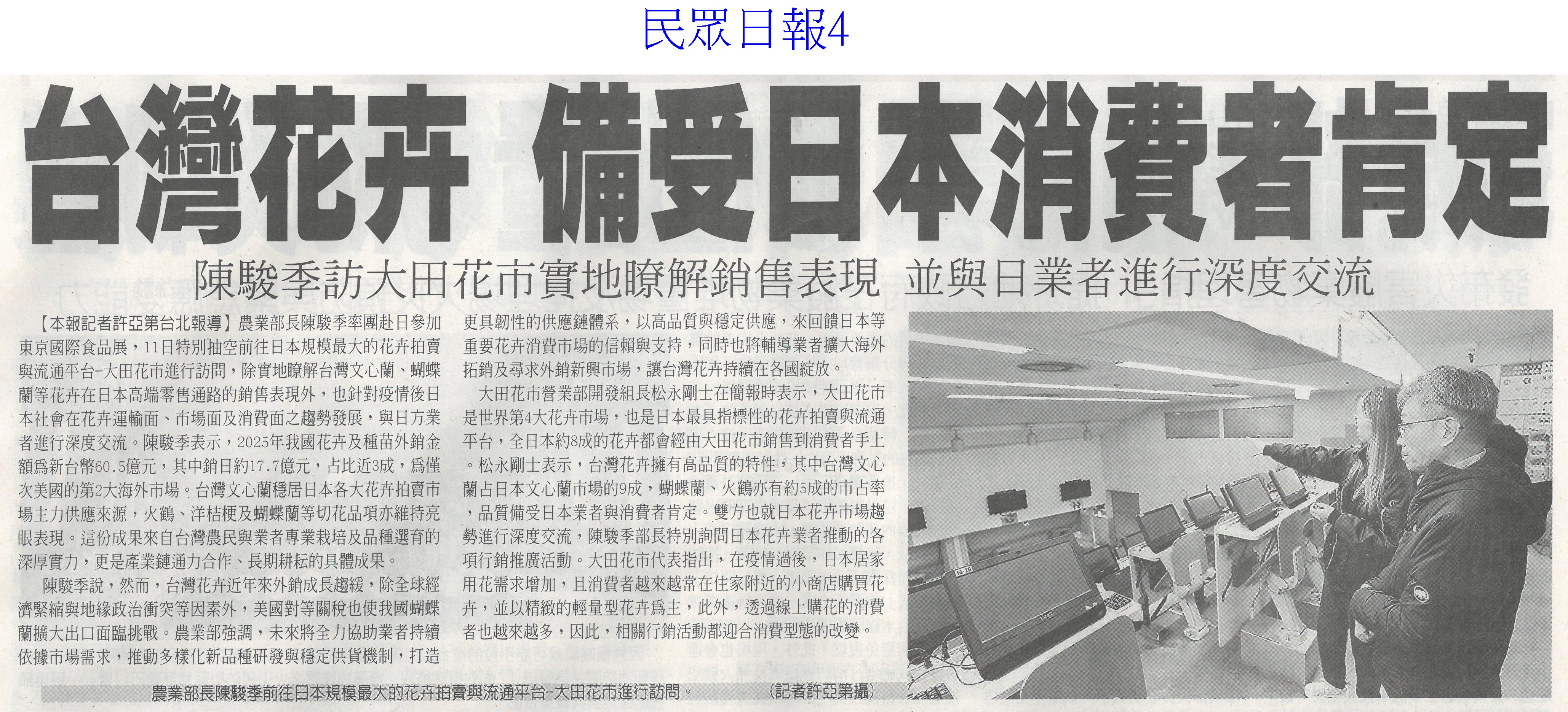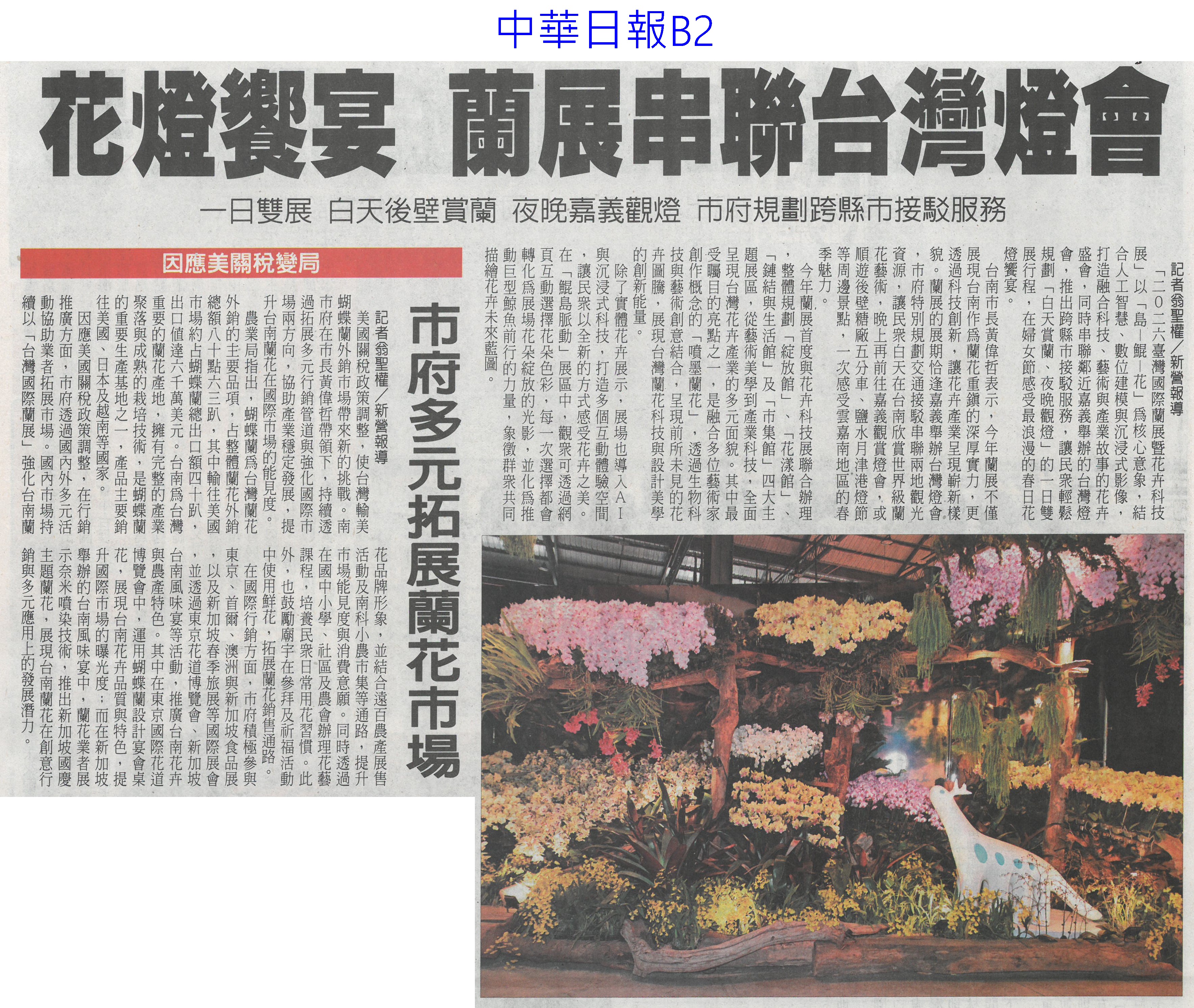 首頁花現新聞 花現新聞 排序 發布日期 更新日期 序號 發布日期 標題 41. 115/03/13 栽培功力極高 萬代蘭奪國際蘭展總冠軍(自由時報A9) 42. 115/03/13 台南百項農漁產 東京食品展亮相(自由時報A11) 43. 115/03/13 台灣國際蘭展 四倍體蘭園奪全場總冠軍(臺灣時報9) 44. 115/03/13 嘉縣推動智慧農業 最高補助(中國時報A9) 45. 115/03/13 雲林良品 東京買氣強強滾(台灣新生報6) 46. 115/03/13 百花爭妍 台南賞花時節(中華日報B1) 47. 115/03/13 台南AI市長上場 東京食品展推銷農產(自由時報A9) 48. 115/03/13 台灣花卉 備受日本消費者肯定(民眾日報4) 49. 115/03/10 花開5成 學甲蜀葵花節3/14登場(自由時報A9) 50. 115/03/10 黃偉哲送火鶴花給市府員工(民眾日報6) 51. 115/03/10 台南有機專區三代接力(中國時報A9) 52. 115/03/10 花燈饗宴 蘭展串聯台灣燈會(中華日報B2) 53. 115/03/10 質譜快檢車 進駐太保農會(民眾日報12) 54. 115/03/10 陳駿季赴東京食品展 搶攻外銷市場(民眾日報6) 55. 115/03/10 台灣農特產 躍上世界舞台(中國時報A9) 56. 115/03/06 開拓清真市場 雲林農產赴中東(中國時報A9) 57. 115/03/06 極危野生櫻石斛 復育存活率逾7成(自由時報A7) 58. 115/03/06 水情緊張 寶二 曾文水庫蓄水率僅4成(聯合報A9) 59. 115/03/06 東京國際食品展 嘉市好店搶商機(民眾日報12) 60. 115/03/06 迎接婦女節 黃偉哲贈火鶴花「乎好」祝福女性健康快樂 第 3/128 頁,共 2560 筆上一頁到第123456789101112131415161718192021222324252627282930313233343536373839404142434445464748495051525354555657585960616263646566676869707172737475767778798081828384858687888990919293949596979899100101102103104105106107108109110111112113114115116117118119120121122123124125126127128頁下一頁每頁103070筆資料
