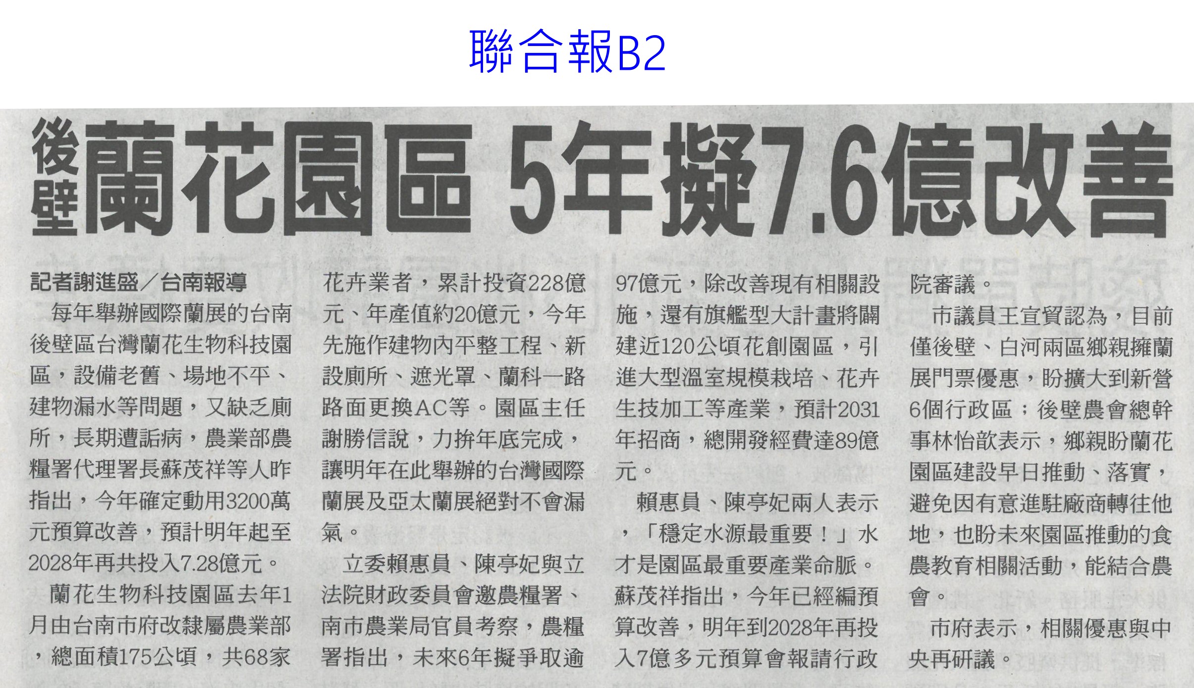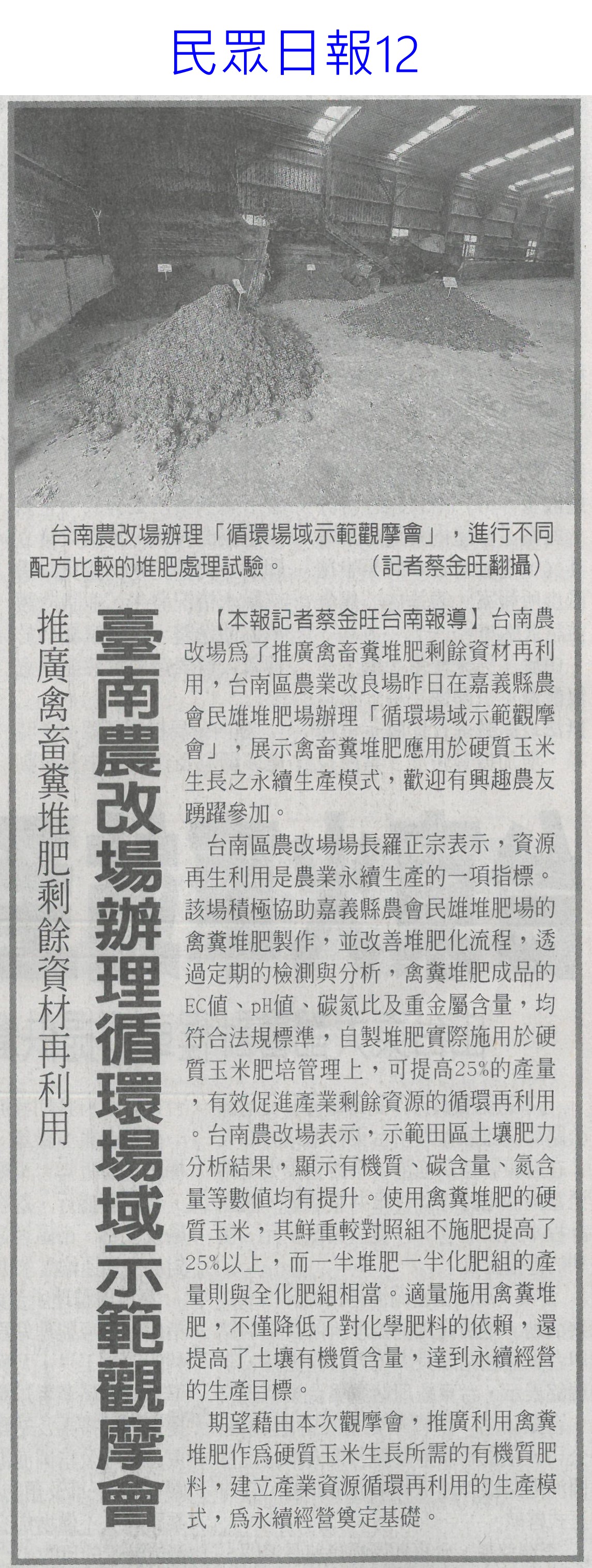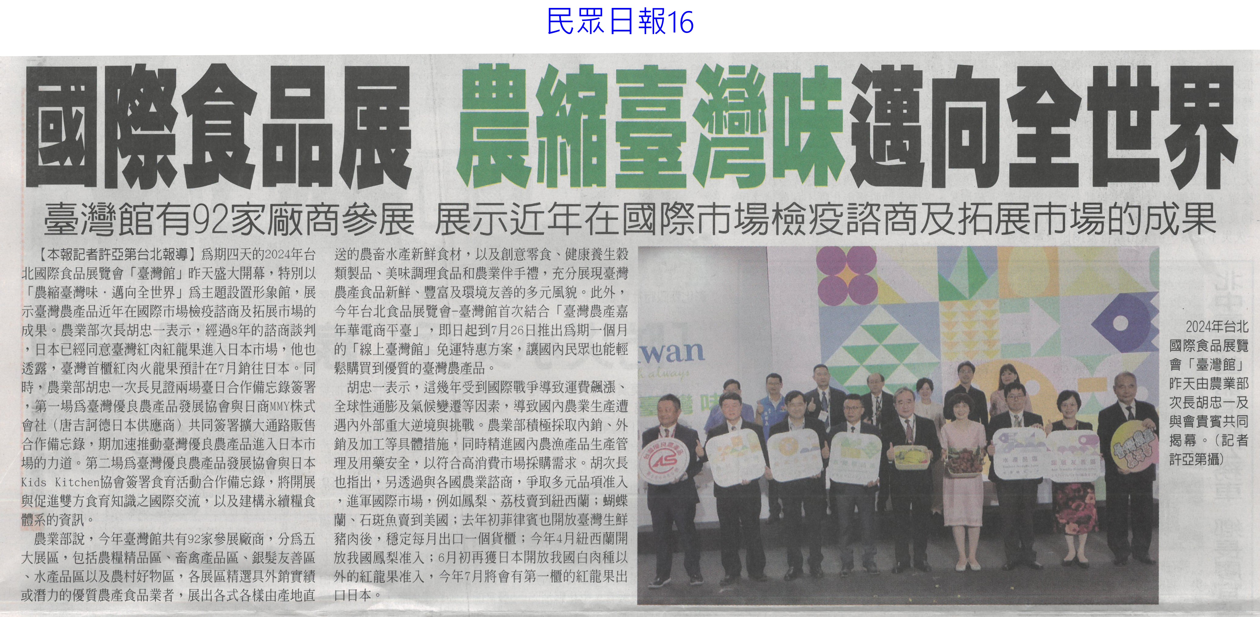 首頁花現新聞 花現新聞 排序 發布日期 更新日期 序號 發布日期 標題 621. 113/07/12 植物診療師法初審過關 最快明年招考(中國時報A5) 622. 113/07/12 口湖金湖休閒農業區 金牌農村賽奪銅(自由時報A10) 623. 113/07/12 金牌農村競賽 5社區奪金牌(民眾日報5) 624. 113/07/12 農試所攜手嘉大 孕育研發人才(民眾日報16) 625. 113/07/08 上網下單 定點取貨 南市8農會與超商合作(台灣新生報6) 626. 113/07/08 8農會攜手超商 商品直送1200據點(自由時報A13) 627. 113/07/08 臺南農改場辦理循環場域示範觀摩會(民眾日報12) 628. 113/07/08 農業部:過去8年砸294億建設照顧農漁民(臺灣時報18) 629. 113/07/08 農產品產銷履歷驗證 受理申請(臺灣時報11) 630. 113/06/28 台南農特產 外銷成果豐(中國時報A9) 631. 113/06/28 國際食品展 濃縮臺灣味邁向全世界(民眾日報16) 632. 113/06/28 台北國際食品展 翁章梁行銷嘉義優鮮(臺灣時報18) 633. 113/06/28 缺工 農業部盼再增8千移工(中華日報A4) 634. 113/06/28 農業移工爭取增至2萬人(臺灣時報4) 635. 113/06/28 後壁蘭花園區 5年擬7.6億改善(聯合報B2) 636. 113/06/28 植物診療師 需國家考試認證(自由時報A1) 637. 113/06/28 嘉義好物前進台北國際食品展(中華日報B6) 638. 113/06/28 全球第一 政院提植物診療師入法(中華日報A3) 639. 113/06/28 憂光電侵蝕 陳吉仲促速提農地白皮書(中國時報A4) 640. 113/06/28 亞太農業技術展 11國400攤齊聚(中華日報B8) 第 32/129 頁,共 2571 筆上一頁到第123456789101112131415161718192021222324252627282930313233343536373839404142434445464748495051525354555657585960616263646566676869707172737475767778798081828384858687888990919293949596979899100101102103104105106107108109110111112113114115116117118119120121122123124125126127128129頁下一頁每頁103070筆資料