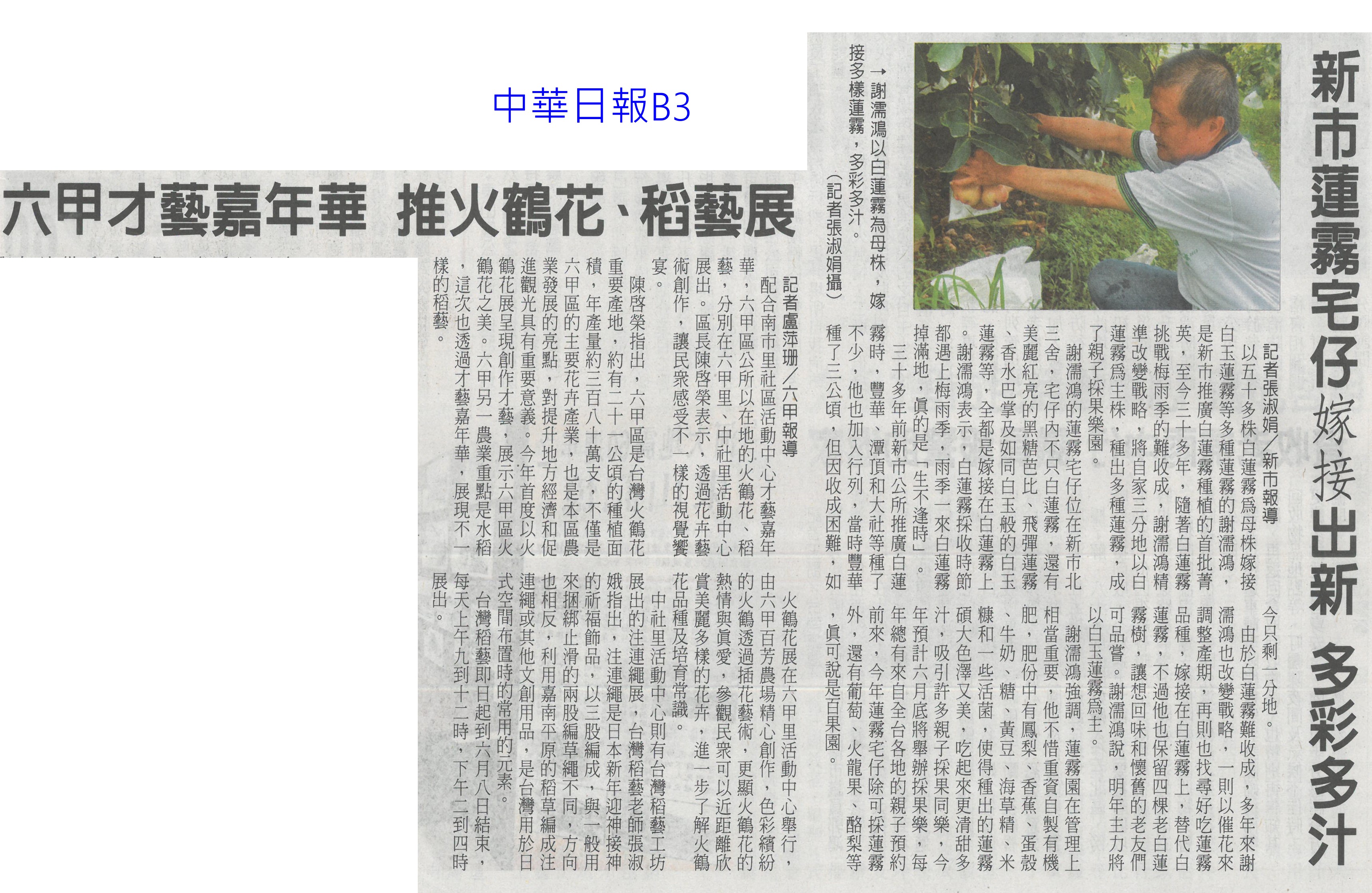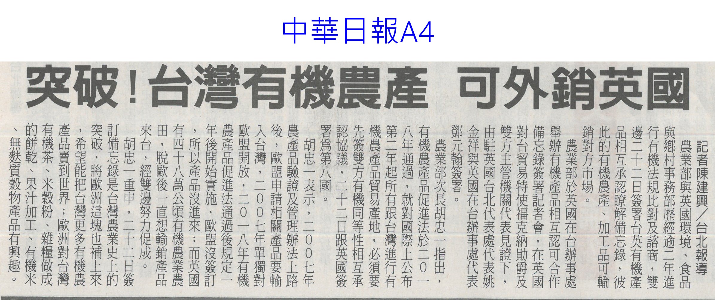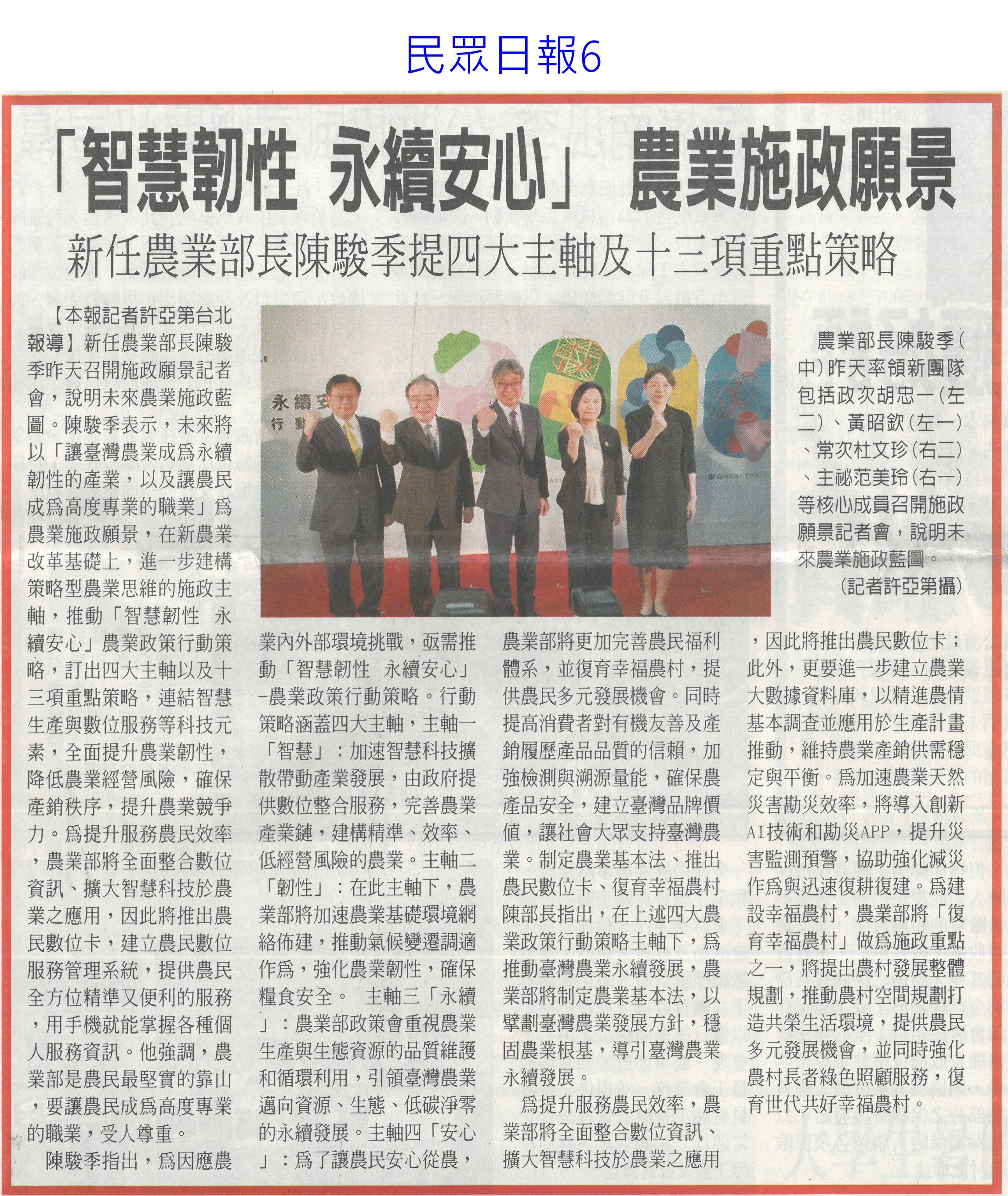 首頁花現新聞 花現新聞 排序 發布日期 更新日期 序號 發布日期 標題 661. 113/06/13 雲林15人獲百大青農 為去年3倍(自由時報A11) 662. 113/06/13 雲林15人獲獎 張麗善:盼青年返鄉(中國時報A9) 663. 113/06/11 台南400新創舉!行銷農特產 黃偉哲首赴「索朗祭」當推銷員 664. 113/06/07 六甲才藝嘉年華 推火鶴花 稻藝展(中華日報B3) 665. 113/06/07 生鮮蔬果農藥殘留 17件超標(中華日報B4) 666. 113/06/07 台南農漁產再出發 前進日韓(中華日報B8) 667. 113/06/07 雲林濁幹線通水 灌溉3.4萬公頃農地(自由時報A10) 668. 113/06/07 黃偉哲赴熊本 行銷台南農產 觀光(聯合報B2) 669. 113/06/07 日本熊本台灣展 黃偉哲站台行銷(中華日報B2) 670. 113/06/06 雲林示範 循環經濟 酸菜鹵水轉換變液肥(中國時報A9) 671. 113/06/05 確保穩定取得穀物 台美簽糧食安全合作備忘錄(臺灣時報7) 672. 113/06/05 梅雨鋒面過境 為水庫增加逾億噸水(民眾日報2) 673. 113/05/31 雲縣14農民入選百大青農(中華日報B6) 674. 113/05/31 突破!臺灣有機農產 可外銷英國(中華日報A4) 675. 113/05/31 集水區降雨破百毫米 2水庫進補(自由時報A11) 676. 113/05/31 切碎循環再利用 製成固體再生燃料 稻稈變身生質能發電(自由時報A7) 677. 113/05/31 雲林推動農藥殘留質譜快檢機制(台灣新生報6) 678. 113/05/31 梅雨進補 三大水庫水情正常(中華日報B1) 679. 113/05/22 農業部長陳駿季:推農業基本法 農民數位卡(自由時報A10) 680. 113/05/22 智慧韌性 永續安心 農業施政願景(民眾日報6) 第 34/129 頁,共 2571 筆上一頁到第123456789101112131415161718192021222324252627282930313233343536373839404142434445464748495051525354555657585960616263646566676869707172737475767778798081828384858687888990919293949596979899100101102103104105106107108109110111112113114115116117118119120121122123124125126127128129頁下一頁每頁103070筆資料