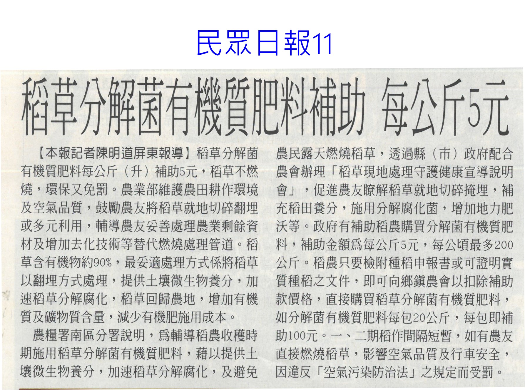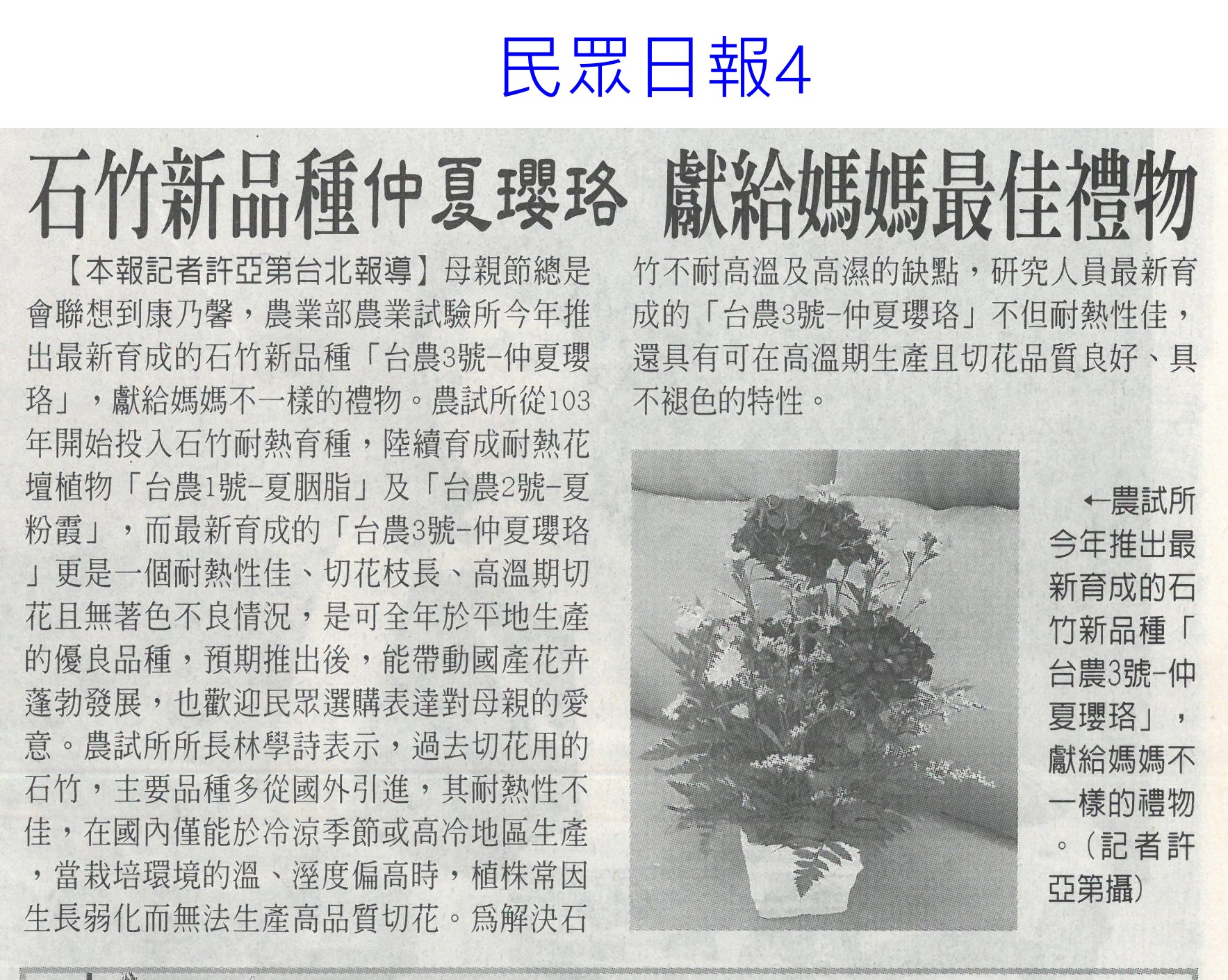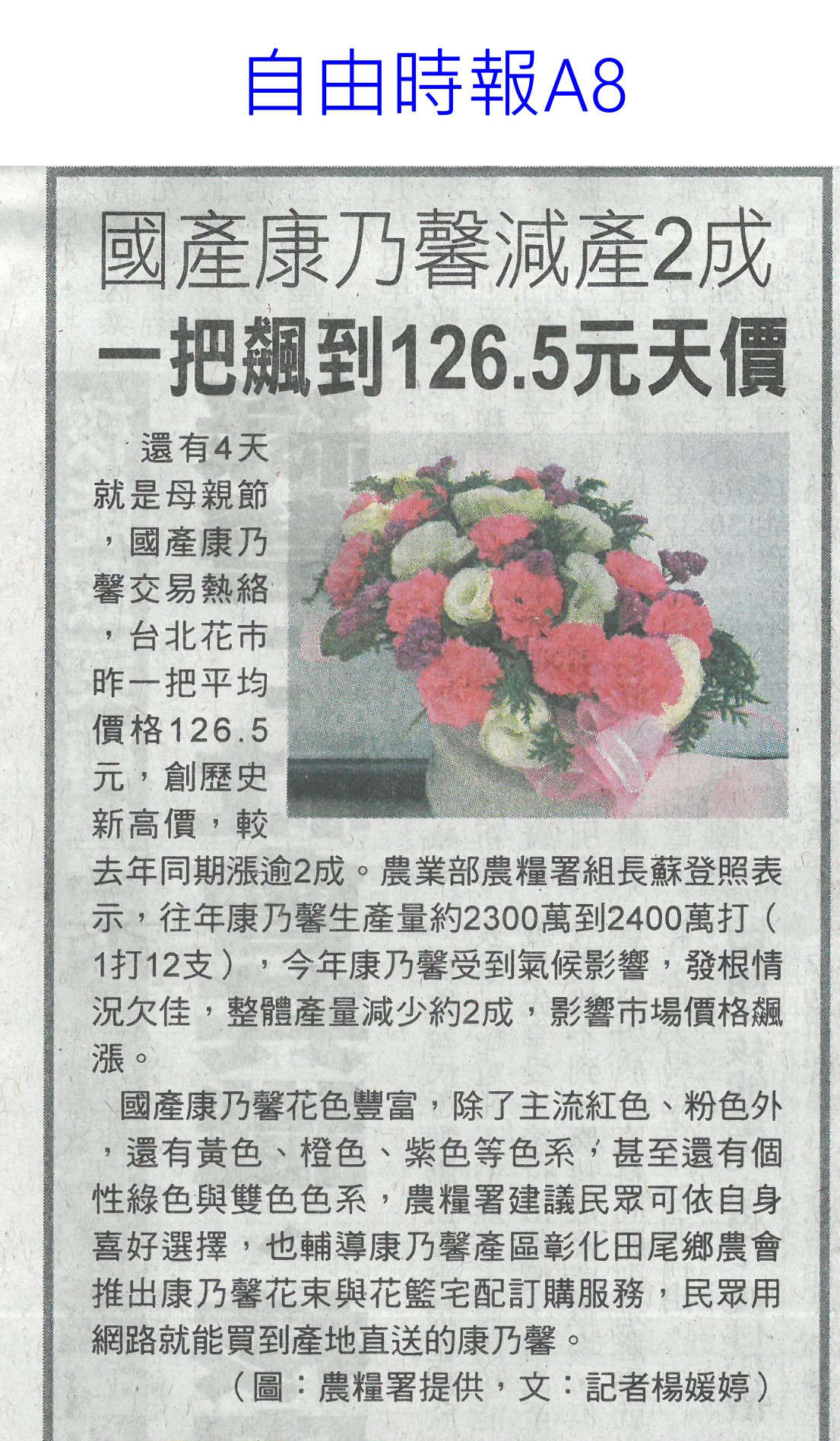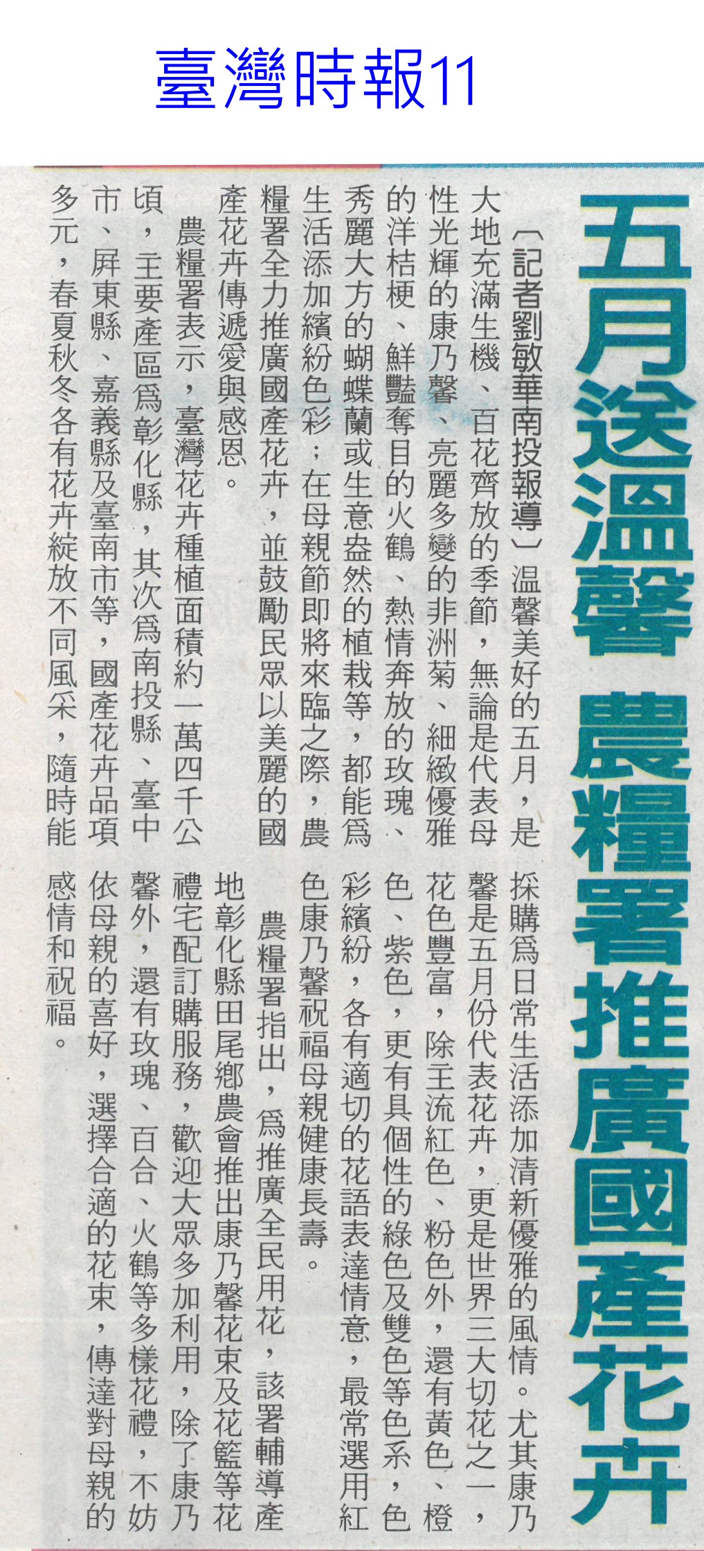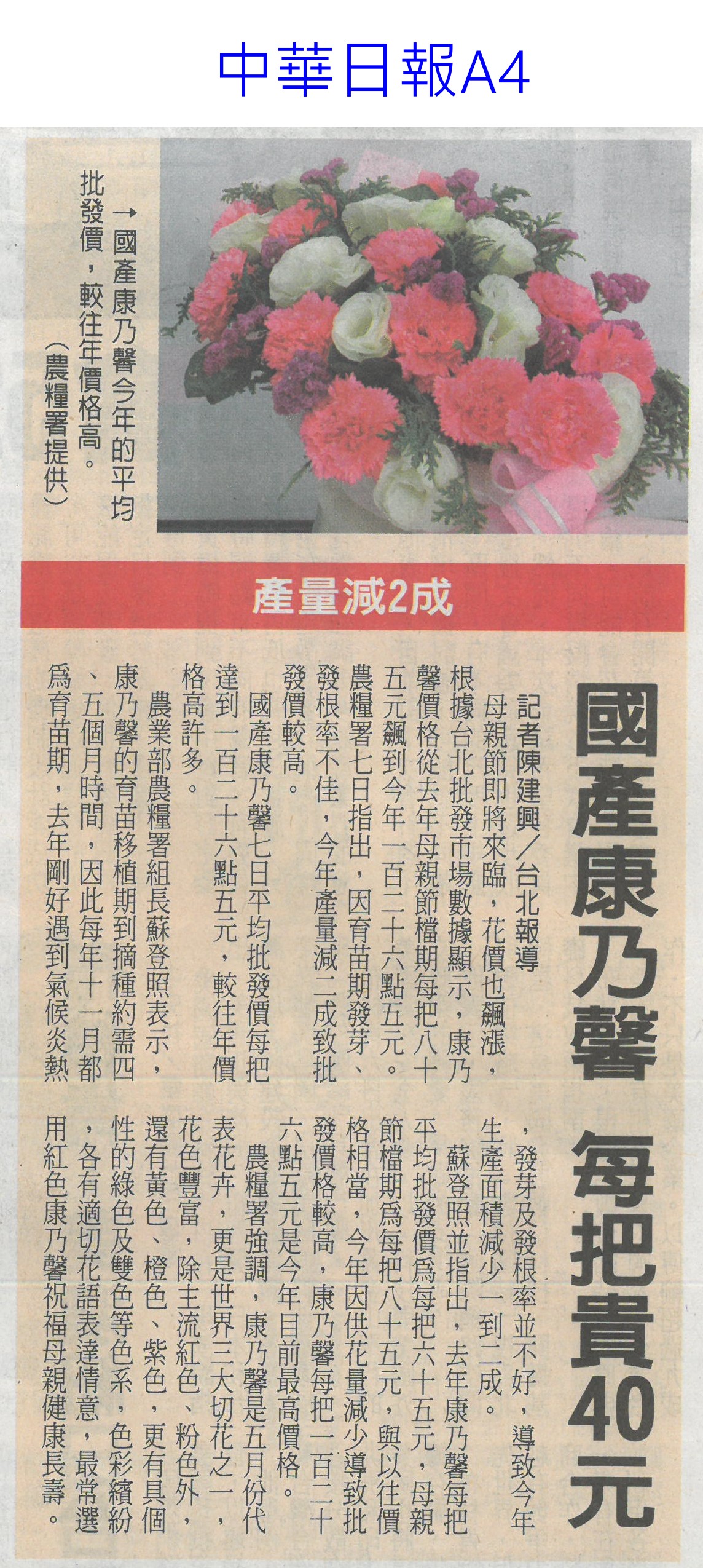 首頁花現新聞 花現新聞 排序 發布日期 更新日期 序號 發布日期 標題 681. 113/05/22 陳駿季:4年內制定農業基本法(中國時報A5) 682. 113/05/21 百大青農林一夫 楠西區長貼紅榜(中華日報B3) 683. 113/05/21 水情不樂觀3水庫蓄水率下降(臺灣時報19) 684. 113/05/21 濁水溪高灘地將供電 農民按讚(中國時報A9) 685. 113/05/21 市長送火鶴花 母親節乎好(中華日報B1) 686. 113/05/21 石竹新品種仲夏瓔珞 獻給媽媽最佳禮物(民眾日報4) 687. 113/05/21 百大青農 嘉縣大放異彩11人獲選(自由時報A12) 688. 113/05/20 國宴布置搶先看! 絕美台南蘭花超吸睛 689. 113/05/09 黃偉哲開箱國宴伴手禮 滿滿臺南人情味(台灣新生報6) 690. 113/05/09 稻草分解菌有機質肥料補助 每公斤5元(民眾日報12) 691. 113/05/09 國產康乃馨減2成 一把飆到126.5元天價(自由時報A8) 692. 113/05/09 五月送溫馨 農糧署推國產花卉(臺灣時報11) 693. 113/05/09 產量減2成 國產康乃馨 每把貴40元(中華日報A4) 694. 113/05/09 臺灣夏天恐達7個月(聯合報A1) 695. 113/05/09 氣溫忽冷忽熱 農漁產量歉收(中國時報A2) 696. 113/05/07 母親節腳步近了 國產康乃馨價格飆至每把126.5元 697. 113/05/06 降雨+節水 曾文`烏山頭水庫獲益3千萬噸(自由時報12) 698. 113/05/06 農業減碳 屏科大智慧農機來助攻(民眾日報10) 699. 113/05/06 曾彥蓉獲台南農業達人亞軍(中華日報B8) 700. 113/05/06 1至4月 火鶴花銷日`澳增6成`2成(自由時報A11)( 第 35/129 頁,共 2571 筆上一頁到第123456789101112131415161718192021222324252627282930313233343536373839404142434445464748495051525354555657585960616263646566676869707172737475767778798081828384858687888990919293949596979899100101102103104105106107108109110111112113114115116117118119120121122123124125126127128129頁下一頁每頁103070筆資料