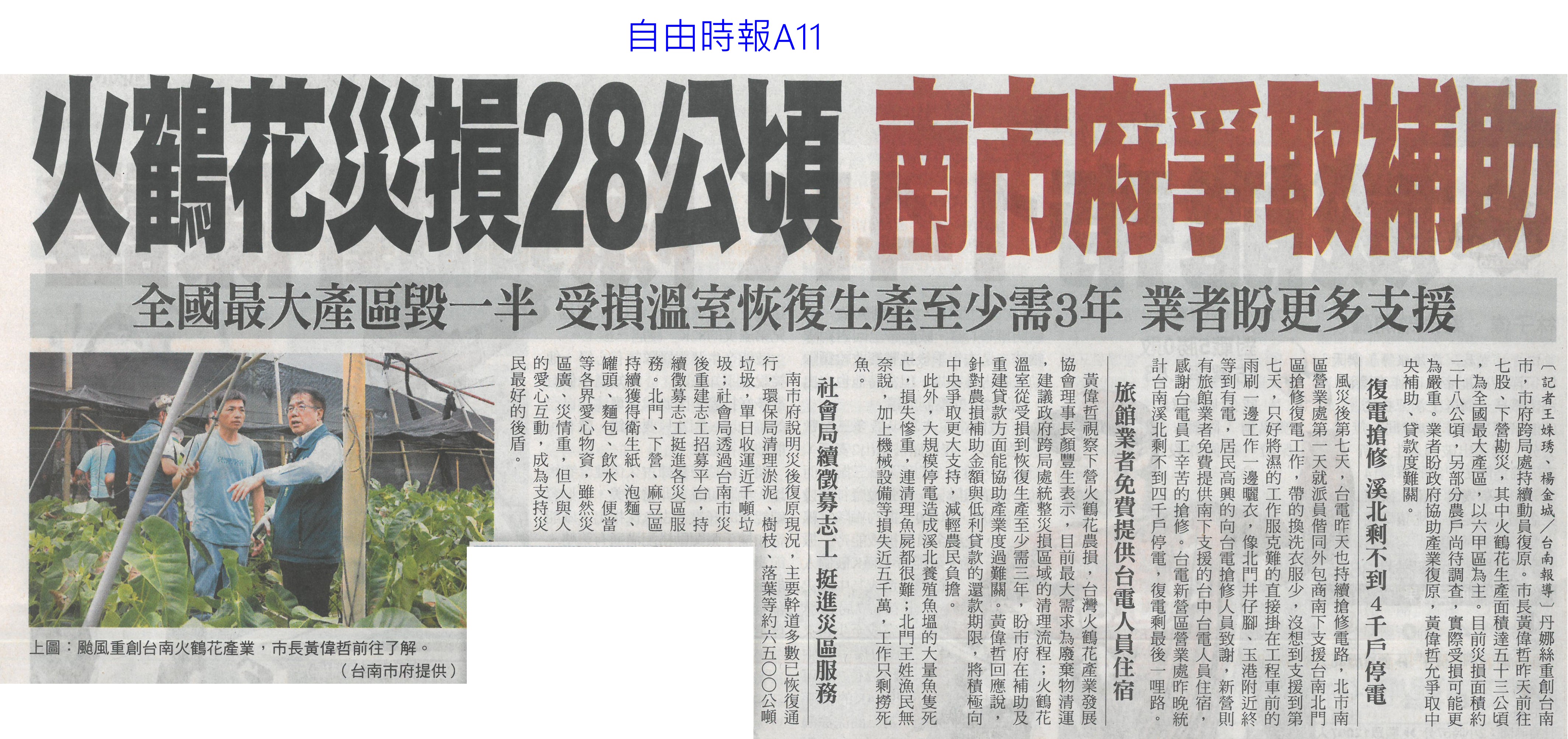 首頁花現新聞 花現新聞 排序 發布日期 更新日期 序號 發布日期 標題 161. 114/07/15 總統雲林勘災 張麗善促全品項救助(中國時報A8) 162. 114/07/15 丹娜絲農損破25億 台南最慘(臺灣時報6) 163. 114/07/15 黃偉哲下營七股勘災 了解火鶴受損情形(臺灣時報9) 164. 114/07/15 火鶴花災損28公頃 南市府爭取補助(自由時報A11) 165. 114/07/15 颱風農損26億 台南10億最慘(中華日報A1) 166. 114/07/14 丹娜絲災後復原進度曝光! 黃偉哲強調:與民眾溝通絕無阻隔 167. 114/07/13 黃偉哲深入七股、下營勘災 指示改善通訊與清運協調 168. 114/07/10 農糧署推冷凍蔬菜輕鬆購(中華日報B5) 169. 114/07/09 雲林農作物災損金額估逾2億元(臺灣時報4) 170. 114/07/09 台南文旦落果嚴重 嘉縣溫室毀9成(中國時報A8) 171. 114/07/09 丹娜絲襲台 農損逾14億文旦柚香蕉最慘重(臺灣時報9) 172. 114/07/09 總統台南勘災聽農漁民心聲(臺灣時報18) 173. 114/07/09 嘉義溫網室災損 中央擬提高救助金(自由時報A9) 174. 114/07/09 農損逾14億 總統勘災:從寬補助(自由時報A7) 175. 114/07/09 農業部公告天災救助 即起申請(中華日報B2) 176. 114/07/09 丹娜絲風災農損增至14.5億餘(中華日報A3) 177. 114/07/09 台南勘災 賴總統:會盡速救助(中華日報A3) 178. 114/07/09 回本命區勘災 賴允農貸零利率(中國時報A8) 179. 114/07/04 台北國際食品展 12家農村好物業者參與(民眾日報5) 180. 114/07/04 解決缺工 南市府展示智慧農機(台灣新生報6) 第 9/125 頁,共 2486 筆上一頁到第123456789101112131415161718192021222324252627282930313233343536373839404142434445464748495051525354555657585960616263646566676869707172737475767778798081828384858687888990919293949596979899100101102103104105106107108109110111112113114115116117118119120121122123124125頁下一頁每頁103070筆資料