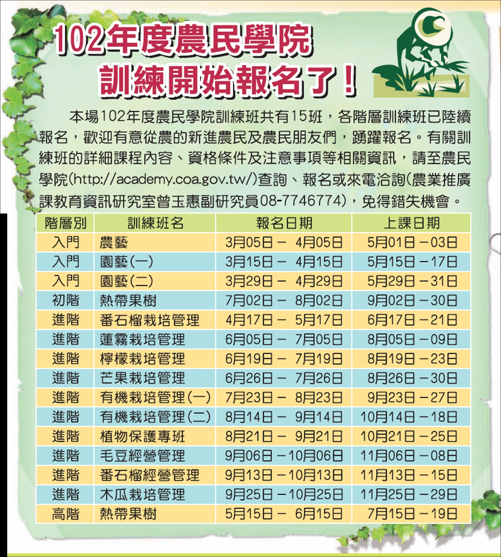 首頁蓮霧新鮮報最新情報 最新情報 排序 發布日期 更新日期 序號 發布日期 標題 81. 102/09/04 電子商務正夯 高雄場辦理農業雲端應用訓練班 82. 102/08/28 高雄區農業改良場102年蓮霧進階選修班 學成結訓 83. 102/08/05 氣候變遷下的贏家〜因應氣候變遷蓮霧栽培管理技術研習班結訓 84. 102/07/17 因應氣候變遷蓮霧栽培管理技術研習班 85. 102/06/20 香水巴掌蓮霧 1顆直逼1台斤 86. 102/06/11 「蓮霧栽培管理進階選修班」開始報名了! 87. 102/05/22 全國模範農民徐英忠 控制蓮霧裂果的施肥要訣 88. 102/05/13 高雄場作物健康管理核心班正式成軍 89. 102/05/13 模範農民徐英忠 反向操作五月收蓮霧 90. 102/05/10 科技農企業經營管理精英班 報名中 91. 102/04/27 黑珍珠的故鄉-林邊蓮霧健康管理講習紀實 92. 102/04/26 高雄區農業改良場102年度農民學院訓練班 93. 102/04/12 高雄區農業改良場4月23日將於林邊鄉辦理「蓮霧健康管理技術講習會」 94. 102/04/09 高雄改良場作物健康管理核心班招生中 95. 102/04/08 吉時從農 農友踴躍參加說明會 96. 102/02/22 高雄區農業改良場新春第一炮 麟洛蓮霧健康管理講習會紀實 97. 102/02/18 蓮霧健康管理技術講習會(麟洛) 98. 102/02/06 呵護植物人 蓮霧爺爺連3年捐助 99. 102/02/04 蓮霧料理創新藝 輕鬆上桌好過節(NTDAPTV) 100. 102/02/02 促銷黑珍珠 吃蓮霧賞藝術 第 5/9 頁,共 169 筆上一頁到第123456789頁下一頁每頁103070筆資料