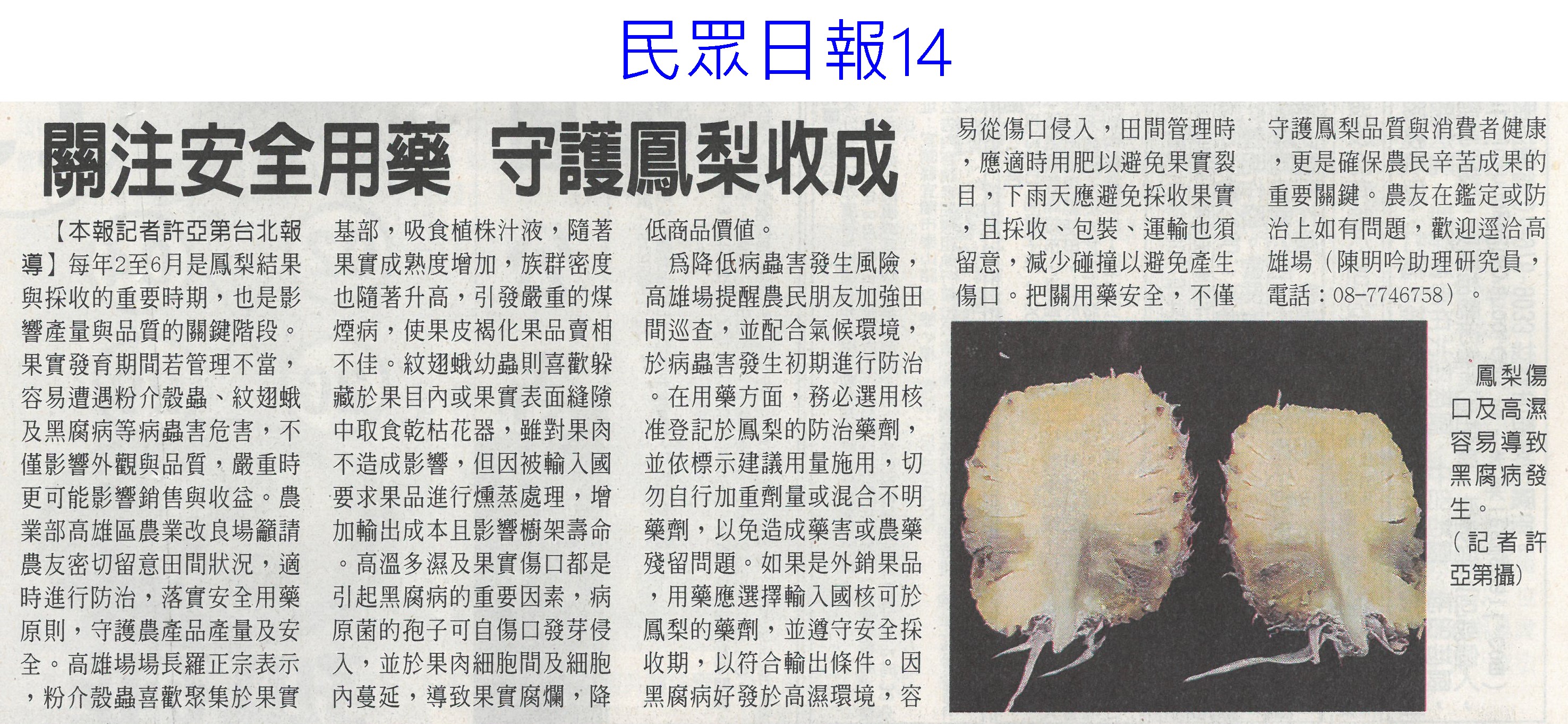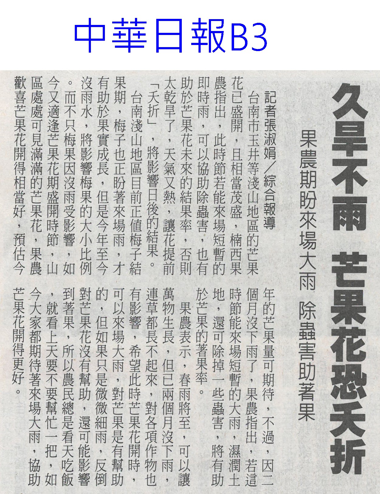 首頁柑橘就柑新鮮知鮮聞 鮮知鮮聞 排序 發布日期 更新日期 序號 發布日期 標題 41. 115/02/26 曾文水庫喊渴 蓄水率跌破5成(中國時報A9) 42. 115/02/26 臺灣燈會聯名水果盒 超商開賣(自由時報A9) 43. 115/02/26 關注安全用藥 守護鳳梨收成(民眾日報14) 44. 115/02/26 挺農民 賴:成立三百億農安基金(臺灣時報13) 45. 115/02/26 關稅農業變局 要改靠科技吃飯(聯合報A13) 46. 115/02/26 賴:設300億基金住農業全球布局(臺灣時報2) 47. 115/02/26 時當季!青農市集農產優質鮮甜(中華日報B3) 48. 115/02/26 台南蜜棗星國狂銷 開市就搶光(中華日報B2) 49. 115/02/26 鳳梨釋迦加工加值 產業點釋成金(民眾日報16) 50. 115/02/25 久旱不雨 芒果花恐夭折(中華日報B3) 51. 115/02/25 農產品銷美 爭取享ART待遇(中華日報A4) 52. 115/02/23 英國柑橘果醬大賽2026揭曉,台灣再放光芒,果食男子、玫開四度、小甜心等榮獲大獎 53. 115/02/21 橘子全黃最好吃?資深菜販揭挑選技巧「選這顆最甜」:CP值最高 54. 115/02/21 蘋果、香蕉是催熟神器 農業部:5種水果採收後無法熟成 55. 115/02/16 農青大使端年菜向林佳龍拜年 谷立言、片山和之來加菜 56. 115/02/15 無籽水果怎麼來 雜交、生長調節、氣候環境 57. 115/02/14 不到一個月芭樂產地價慘下滑 重回親民價消費者有口福 58. 115/02/13 台美關稅底定,出口農產利多,蝴蝶蘭、水產大贏家,酪農最大輸家,養豬業者受衝擊 59. 115/02/13 農業部:堅守糧食安全產品不降稅 攜手產業強化體質 60. 115/02/13 成功爭取稻米雞肉27項農產品不降稅 農業部:蝴蝶蘭銷美關稅將降為零 第 3/264 頁,共 5278 筆上一頁到第123456789101112131415161718192021222324252627282930313233343536373839404142434445464748495051525354555657585960616263646566676869707172737475767778798081828384858687888990919293949596979899100101102103104105106107108109110111112113114115116117118119120121122123124125126127128129130131132133134135136137138139140141142143144145146147148149150151152153154155156157158159160161162163164165166167168169170171172173174175176177178179180181182183184185186187188189190191192193194195196197198199200201202203204205206207208209210211212213214215216217218219220221222223224225226227228229230231232233234235236237238239240241242243244245246247248249250251252253254255256257258259260261262263264頁下一頁每頁103070筆資料