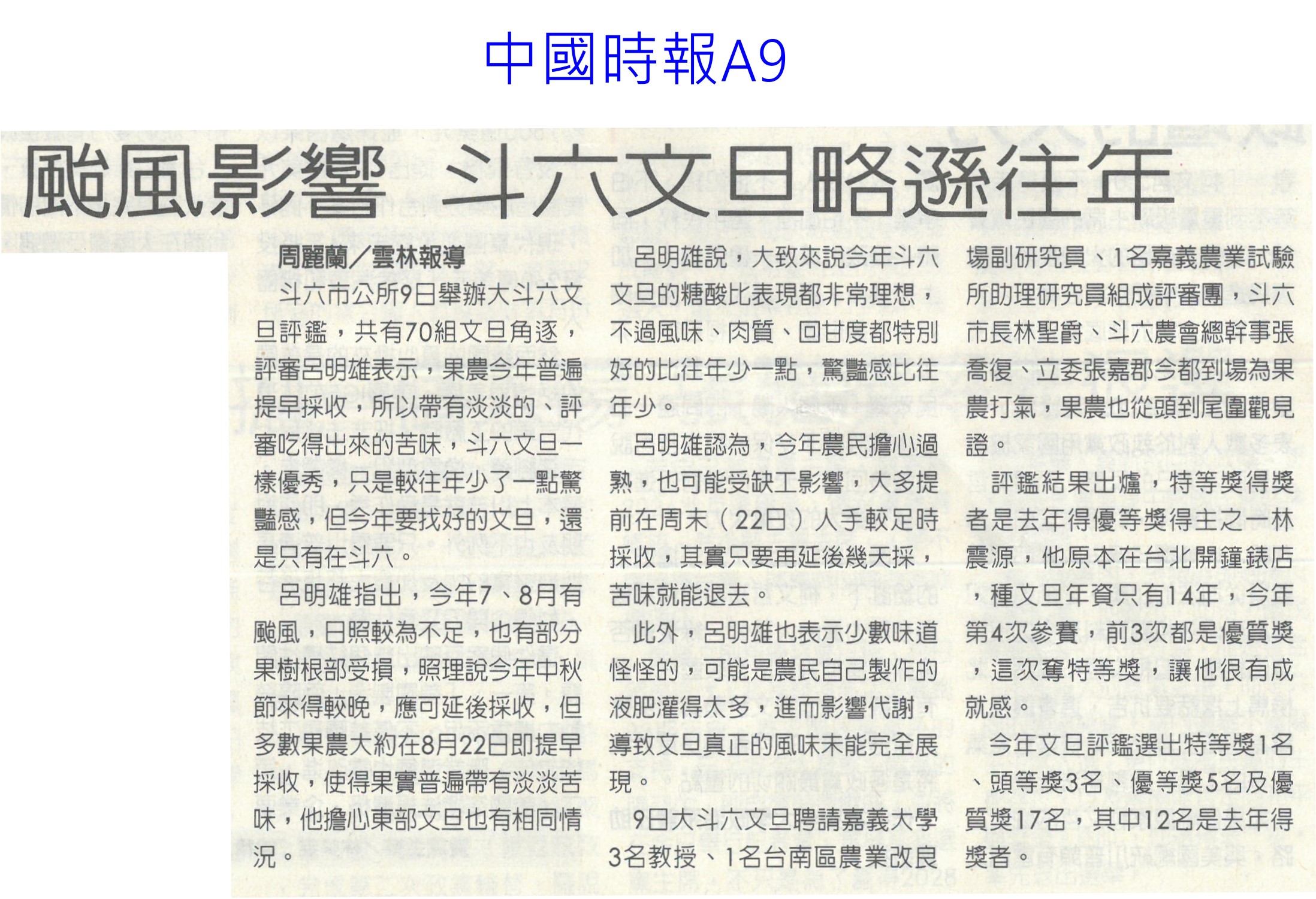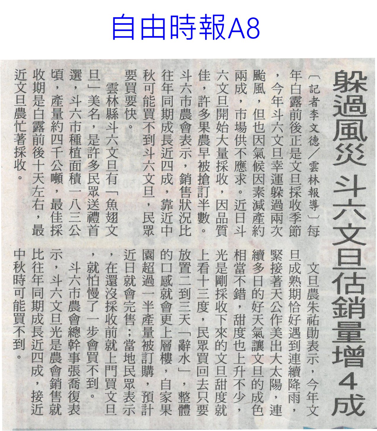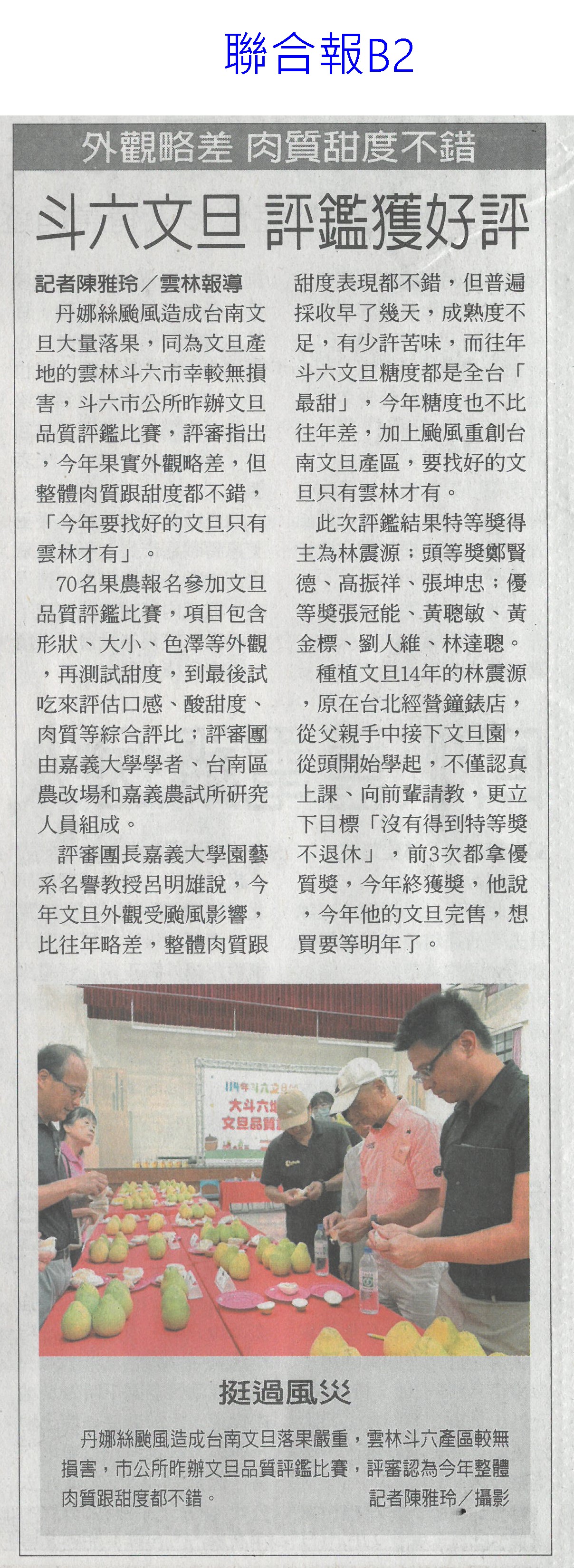 首頁柑橘就柑新鮮知鮮聞 鮮知鮮聞 排序 發布日期 更新日期 序號 發布日期 標題 101. 114/09/14 農業部推鄉村長者喝鮮乳,養羊協會呼籲,修法讓羊奶作保久乳,更多偏鄉長者可受惠 102. 114/09/14 影/基隆七堵柚子今年因雨產量僅三分之一 但大顆、甜度高、價格好 103. 114/09/13 柚見幸福!「2025斗六文旦節」熱鬧登場 柚農評鑑得獎名單出爐 104. 114/09/12 澳洲食品展台灣館 台南6業者進駐(自由時報A9) 105. 114/09/12 澳洲食品展 黃偉哲推銷農漁產品(中華日報B8) 106. 114/09/12 躲過風災 斗六文旦銷量增四成(自由時報A8) 107. 114/09/12 麻豆文旦是寶 警方護柚(自由時報A1) 108. 114/09/12 南市農業局力推柚類加工品(台灣新生報3) 109. 114/09/12 南市安定/官田獲全國優良農業產銷班殊榮(台灣新生報3) 110. 114/09/12 稻田轉作雜糧 雲林高鐵沿線 節水減緩地層下陷(民眾日報2) 111. 114/09/12 農遊體驗超夯 年產值逾110億(自由時報A7) 112. 114/09/12 柚見好滋味 國產文旦季起跑(民眾日報4) 113. 114/09/12 斗六文旦評鑑獲好評(聯合報B2) 114. 114/09/12 大斗六文旦評鑑 特等獎出爐(台灣時報9) 115. 114/09/12 大斗六地區文旦評鑑 林震源得特等獎(自由時報A9) 116. 114/09/12 颱風影響 斗六文旦略遜往年(中國時報A9) 117. 114/09/12 丹娜絲風災/728豪雨 地方送件牛步 農民救助金卡關(自由時報A7) 118. 114/09/12 雲林良品大躍進 蔬果外銷逾千噸(台灣新生報6) 119. 114/09/12 雲林蔬果銷星 封櫃啟航(中華日報B6) 120. 114/09/12 風災減產8成 麻豆文旦搶手(中華日報B1) 第 6/252 頁,共 5035 筆上一頁到第123456789101112131415161718192021222324252627282930313233343536373839404142434445464748495051525354555657585960616263646566676869707172737475767778798081828384858687888990919293949596979899100101102103104105106107108109110111112113114115116117118119120121122123124125126127128129130131132133134135136137138139140141142143144145146147148149150151152153154155156157158159160161162163164165166167168169170171172173174175176177178179180181182183184185186187188189190191192193194195196197198199200201202203204205206207208209210211212213214215216217218219220221222223224225226227228229230231232233234235236237238239240241242243244245246247248249250251252頁下一頁每頁103070筆資料