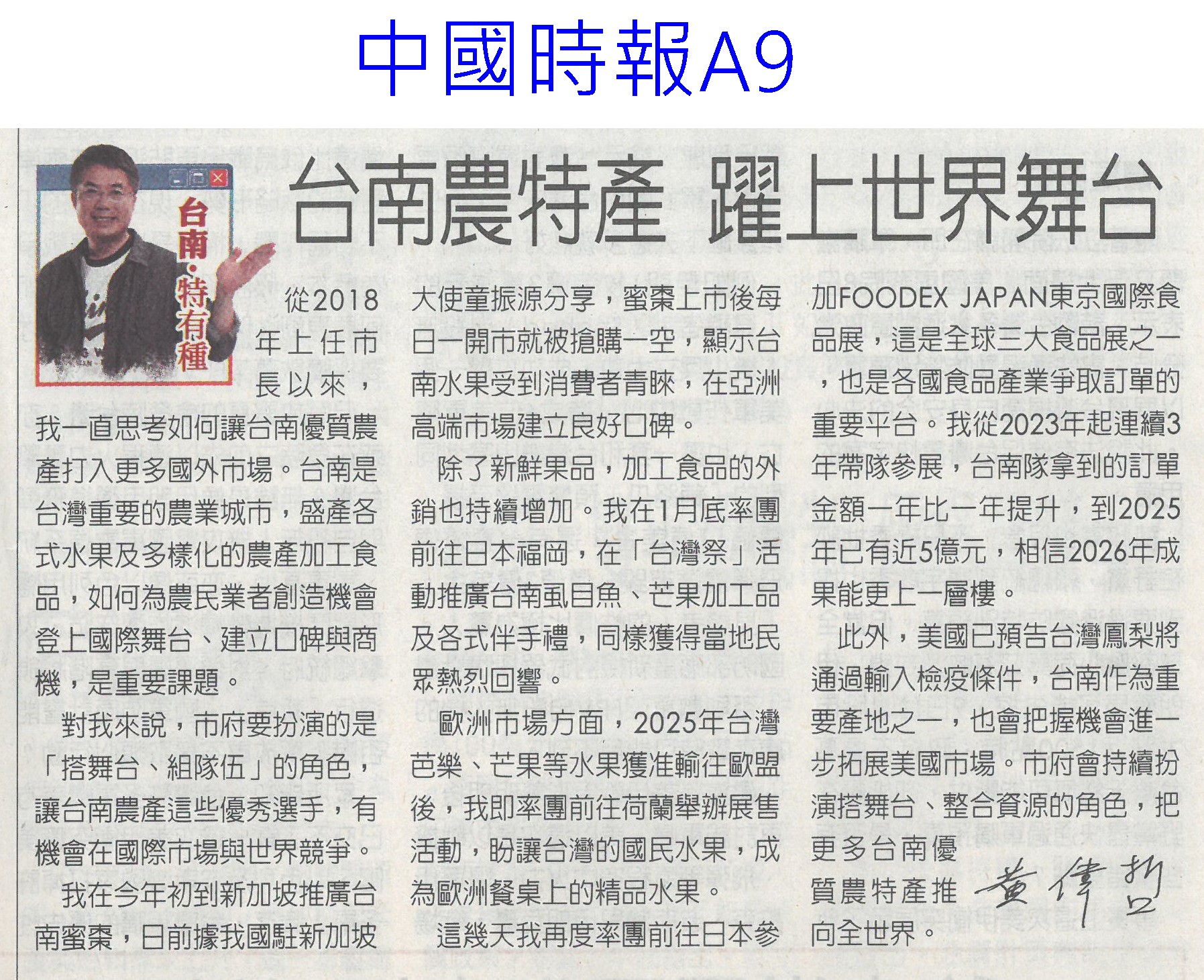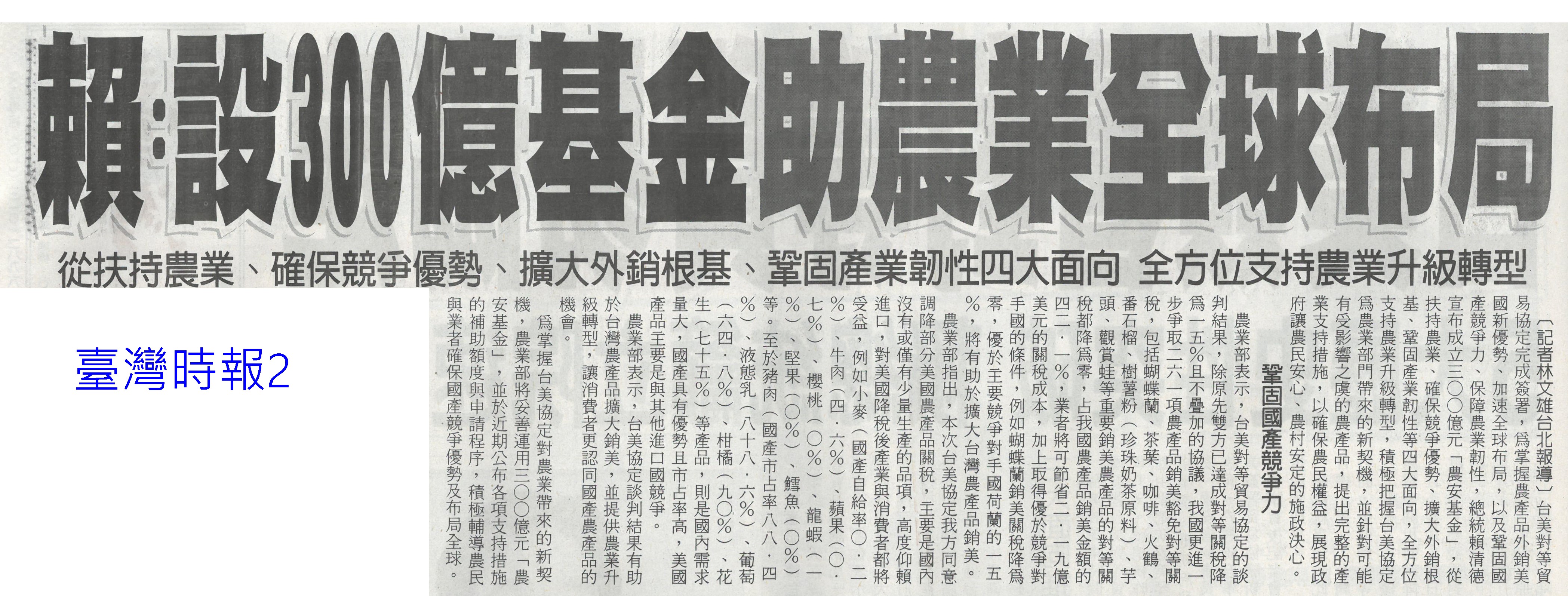 首頁蘆筍新新聞 蘆筍新新聞 排序 發布日期 更新日期 序號 發布日期 標題 21. 115/03/10 七股紅蔥頭節 手作紅蔥頭棒棒糖吸睛(中華日報B1) 22. 115/03/10 質譜快檢車 進駐太保農會(民眾日報12) 23. 115/03/10 台灣農特產 躍上世界舞台(中國時報A9) 24. 115/03/10 冷凍蔬菜沒營養? 營養師:3大好處不輸新鮮菜 但最忌「這件事」 25. 115/03/06 水情緊張 寶二 曾文水庫蓄水率僅4成(聯合報A9) 26. 115/03/06 東京國際食品展 嘉市好店搶商機(民眾日報12) 27. 115/03/06 紅蔥頭進入收穫後期 質佳價穩(中華日報B3) 28. 115/03/05 雲林良品進軍東京食品展(台灣新生報6) 29. 115/03/05 黃偉哲再戰東京食品展(台灣新生報6) 30. 115/03/05 雲林智慧農業 補助最高百萬元(中國時報A9) 31. 115/03/04 產地溯源到永續實踐!楓橋餐廳打造專屬台灣風味地圖 32. 115/02/26 曾文水庫喊渴 蓄水率跌破5成(中國時報A9) 33. 115/02/26 挺農民 賴:成立三百億農安基金(臺灣時報13) 34. 115/02/26 關稅農業變局 要改靠科技吃飯(聯合報A13) 35. 115/02/26 高麗菜豐收 雲縣府跨縣市行銷(中國時報A7) 36. 115/02/26 賴:設300億基金住農業全球布局(臺灣時報2) 37. 115/02/26 時當季!青農市集農產優質鮮甜(中華日報B3) 38. 115/02/25 將軍拔胡蘿蔔 27日登場(中華日報B4) 39. 115/02/25 農產品銷美 爭取享ART待遇(中華日報A4) 40. 115/02/11 農糧署攜手全聯 推國產農漁畜年節食材(民眾日報6) 第 2/142 頁,共 2838 筆上一頁到第123456789101112131415161718192021222324252627282930313233343536373839404142434445464748495051525354555657585960616263646566676869707172737475767778798081828384858687888990919293949596979899100101102103104105106107108109110111112113114115116117118119120121122123124125126127128129130131132133134135136137138139140141142頁下一頁每頁103070筆資料