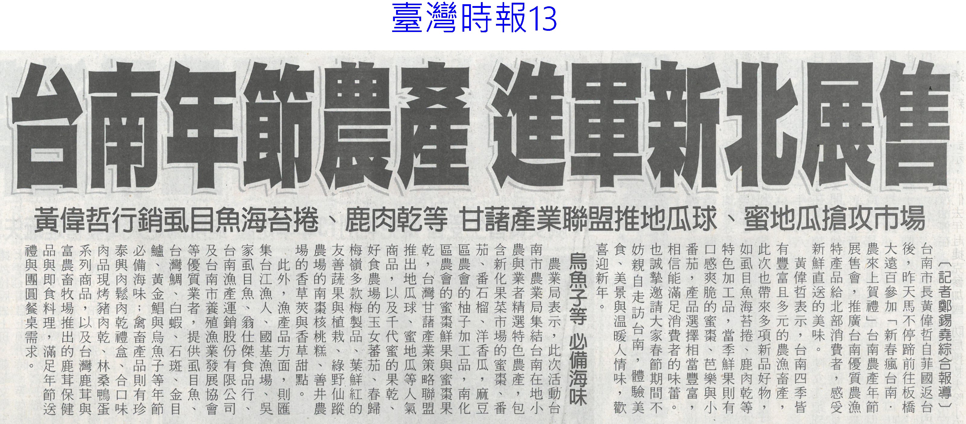 首頁蘆筍新新聞 蘆筍新新聞 排序 發布日期 更新日期 序號 發布日期 標題 61. 115/01/22 鹽水番茄產季 農業局行銷(中華日報B1) 62. 115/01/22 胡蘿蔔生產機械化 減緩缺工問題(中華日報B3) 63. 115/01/22 鹽水區農會行銷在地優質番茄(民眾日報16) 64. 115/01/22 甘藍產銷調節新利器 液態氮急凍技術(民眾日報16) 65. 115/01/22 菠菜盛產大俗賣 民眾樂撿便宜(台灣時報10) 66. 115/01/22 台美談判 農產進口未以零關稅為前提(台灣新生報2) 67. 115/01/22 永康西勢拔蘿蔔 親子下田趣(中華日報B1) 68. 115/01/22 雲林好禮揪柑心 北上推廣(台灣新生報6) 69. 115/01/22 政院拍板 老農津貼增至1萬(臺灣時報1) 70. 115/01/22 新農經營準備金 19日起開放申請(中華日報A4) 71. 115/01/22 青花菜大落價 民眾樂購(臺灣時報15) 72. 115/01/22 質譜快篩把關 蔬果安全有保障(民眾日報10) 73. 115/01/21 台南年節農產 進軍新北展售(台灣時報13) 74. 115/01/21 農業應對關稅 需變革而非補助(聯合報A10) 75. 115/01/21 新興農產業 四南坡地啤酒花試種成功(民眾日報16) 76. 115/01/21 嘉縣推12項伴手禮 台灣燈會限定聯名(自由時報A9) 77. 115/01/21 立院三讀 壟斷/操作農產品交易 最重可處30萬罰款(自由時報A7) 78. 115/01/21 嘉義優鮮伴手禮型錄 上線(台灣新生報6) 79. 115/01/21 嘉義優鮮迎燈會 搶攻年節商機(中國時報A9) 80. 115/01/13 高麗菜一顆19元 引爆搶購潮(臺灣時報13) 第 4/142 頁,共 2838 筆上一頁到第123456789101112131415161718192021222324252627282930313233343536373839404142434445464748495051525354555657585960616263646566676869707172737475767778798081828384858687888990919293949596979899100101102103104105106107108109110111112113114115116117118119120121122123124125126127128129130131132133134135136137138139140141142頁下一頁每頁103070筆資料