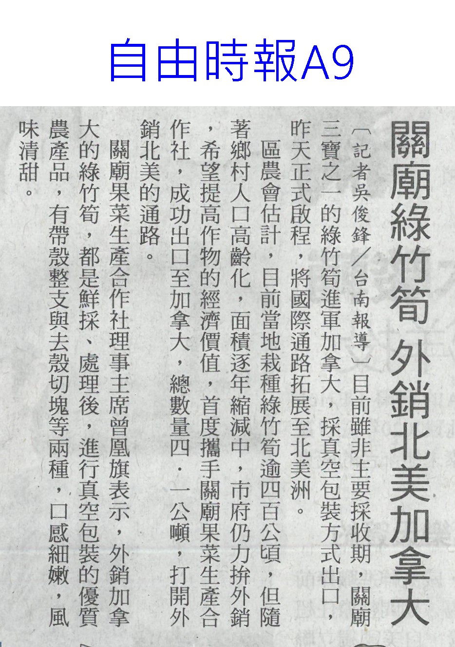 首頁蘆筍新新聞 蘆筍新新聞 排序 發布日期 更新日期 序號 發布日期 標題 81. 115/01/13 臺南農改場育成臺南2號胡麻新品種(民眾日報16) 82. 115/01/09 菜價暴漲暴跌 朝野立委齊聲罵(聯合報A6) 83. 115/01/09 高麗菜大落價 菜農嘆血本無歸(臺灣時報15) 84. 115/01/09 番路農會翻轉柿餅產業 百家農會取經(民眾日報16) 85. 115/01/09 今年力推農作種植登記 操縱交易最重罰3000萬(中國時報A8) 86. 115/01/09 冷氣團來襲 市長籲農漁民防寒害(中華日報B3) 87. 115/01/09 立院考察團至冷鏈中心現勘進度(中華日報B2) 88. 115/01/06 臺南農改場新芝麻含油率高 台南2號可機械採收淨收益增逾35%(自由時報A1) 89. 115/01/06 農改場新品種胡麻「臺南2號」低落粒適合機採(中華日報B1) 90. 115/01/06 關廟4.1噸綠竹筍外銷加拿大(中華日報B4) 91. 115/01/06 雲林地層下陷緩解 25年首見(聯合報B1) 92. 115/01/06 25年首次 雲林無明顯地層下陷區域(自由時報A8) 93. 115/01/06 青花菜慘跌挨批 農糧署:氣候造成集中採收(臺灣時報4) 94. 115/01/06 質譜快檢把關 守護蔬果安全(台灣新生報4) 95. 115/01/06 青花菜產銷波動 氣候致集中採收(台灣新生報12) 96. 115/01/06 政府催出海量青花菜?農糧署駁斥(民眾日報2) 97. 115/01/06 雲嘉南 南北水互通 每日可引34.5萬噸(自由時報A7) 98. 115/01/06 harpin蛋白 可抑制甜椒微斑病毒(民眾日報10) 99. 115/01/06 質譜快篩把關 蔬果安全有保障(民眾日報6) 100. 115/01/02 關廟綠竹筍 外銷北美加拿大(自由時報A9) 第 5/142 頁,共 2838 筆上一頁到第123456789101112131415161718192021222324252627282930313233343536373839404142434445464748495051525354555657585960616263646566676869707172737475767778798081828384858687888990919293949596979899100101102103104105106107108109110111112113114115116117118119120121122123124125126127128129130131132133134135136137138139140141142頁下一頁每頁103070筆資料